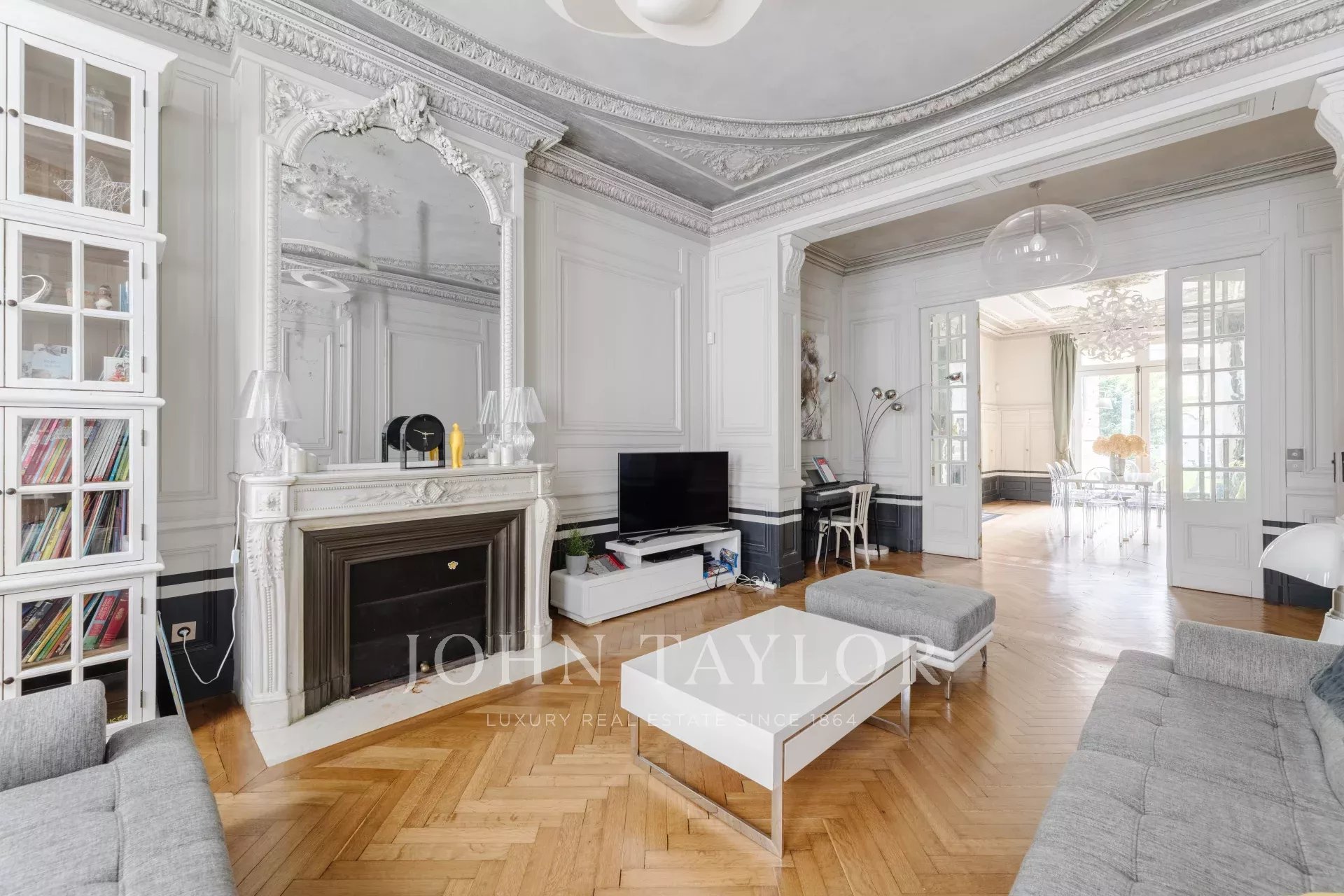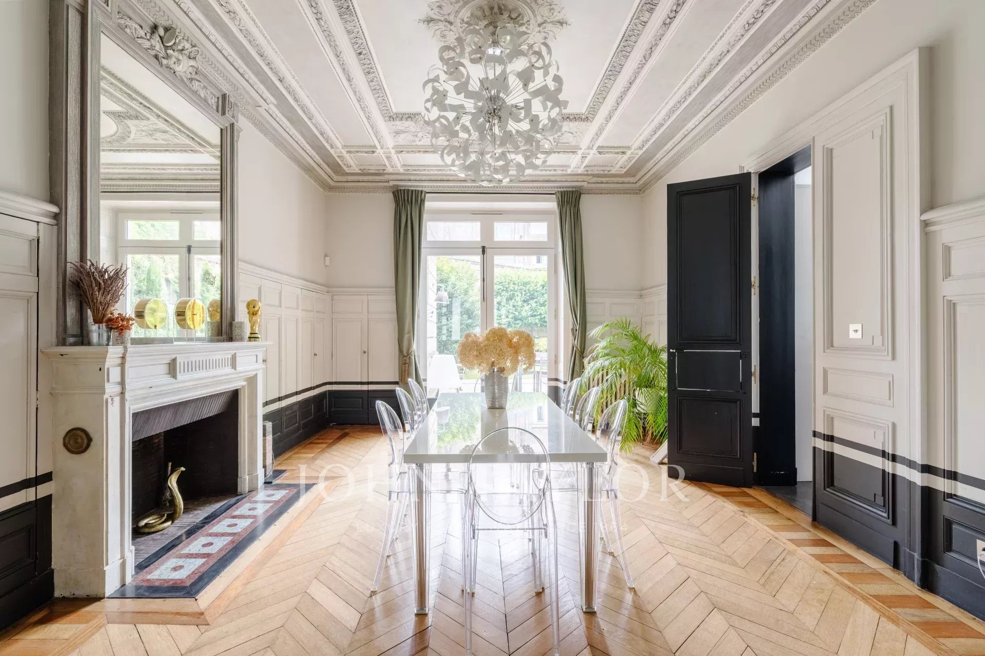 En la planta baja, descubra un majestuoso hall de entrada que conduce a una sala de estar con notables molduras, suelos de parqué y chimeneas, un comedor contiguo y una cocina independiente totalmente equipada con meticulosos acabados.