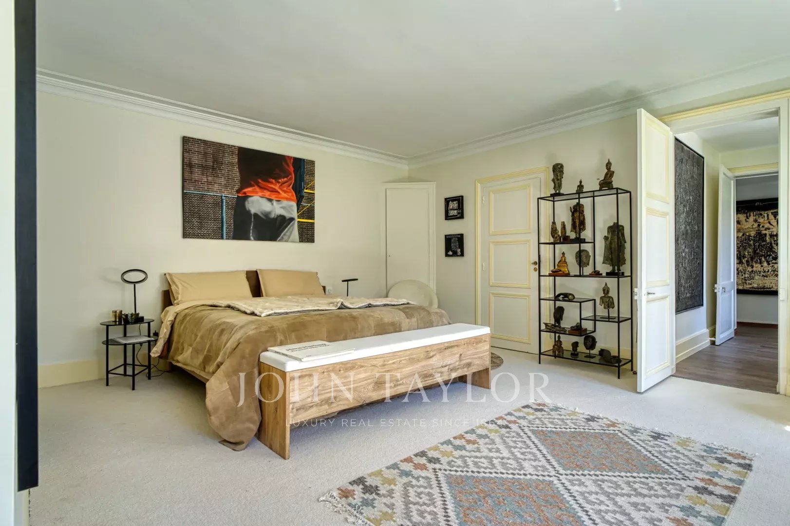 El primer piso se alcanza por una majestuosa escalera doble de roble o mediante el ascensor privado. Alberga cuatro dormitorios con vistas al parque, incluida una elegante suite, así como un gran vestidor diseñado con inteligencia y equipado con su propio cuarto de ducha.