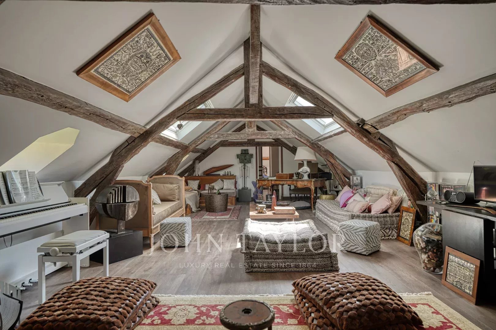 Un rellano/biblioteca da acceso al antiguo desván, realzado por su majestuosa estructura de madera vista y convertido en un espacio íntimo y atemporal, perfecto como salón privado, estudio artístico o refugio exclusivo y confidencial.