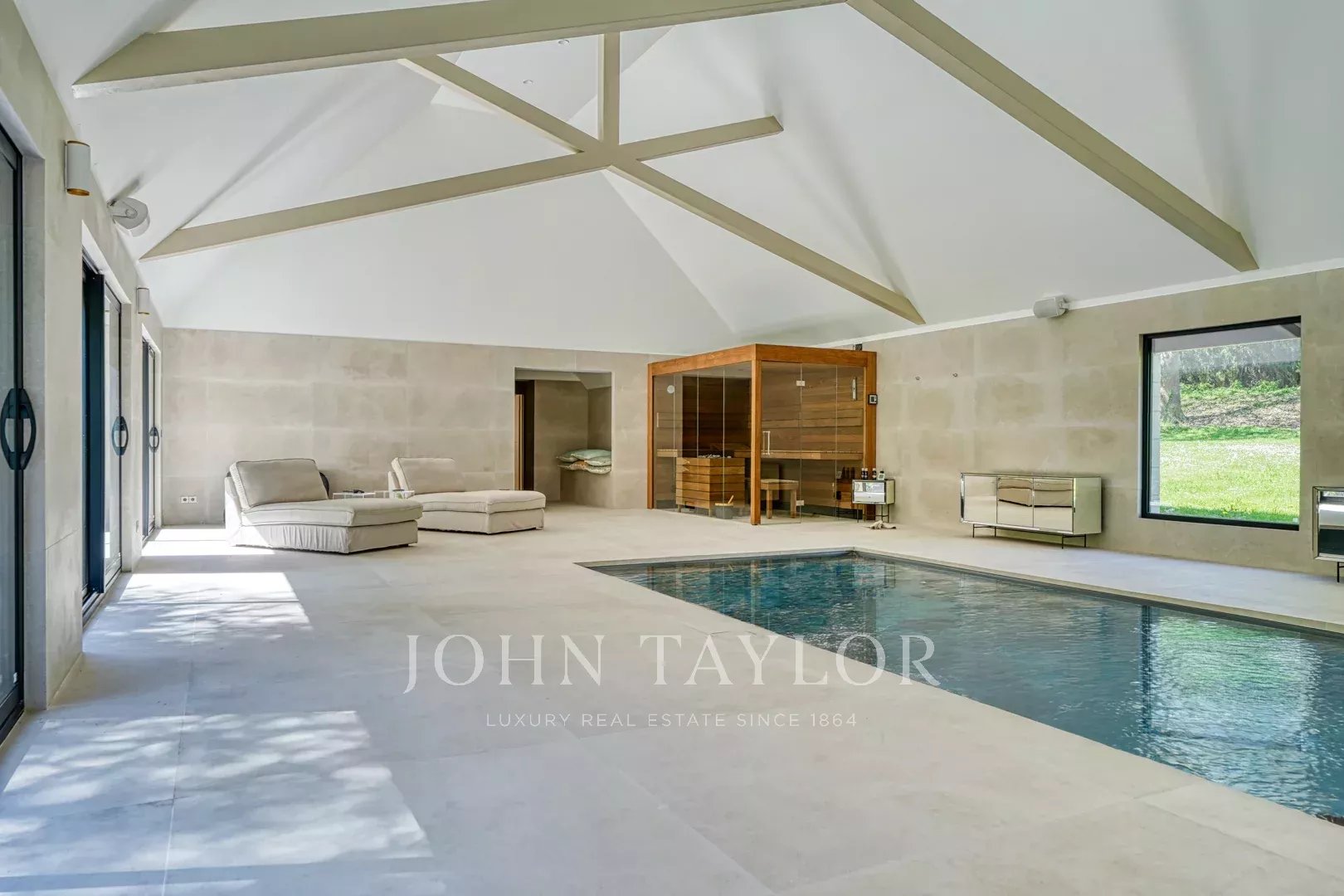 El jardín exterior es un verdadero oasis con piscina, sauna y áreas verdes que invitan al relax. Este entorno natural es ideal para disfrutar de jornadas al aire libre, ofreciendo una combinación perfecta de lujo y tranquilidad. No deje pasar la oportunidad de vivir en este rincón exclusivo de Francia.