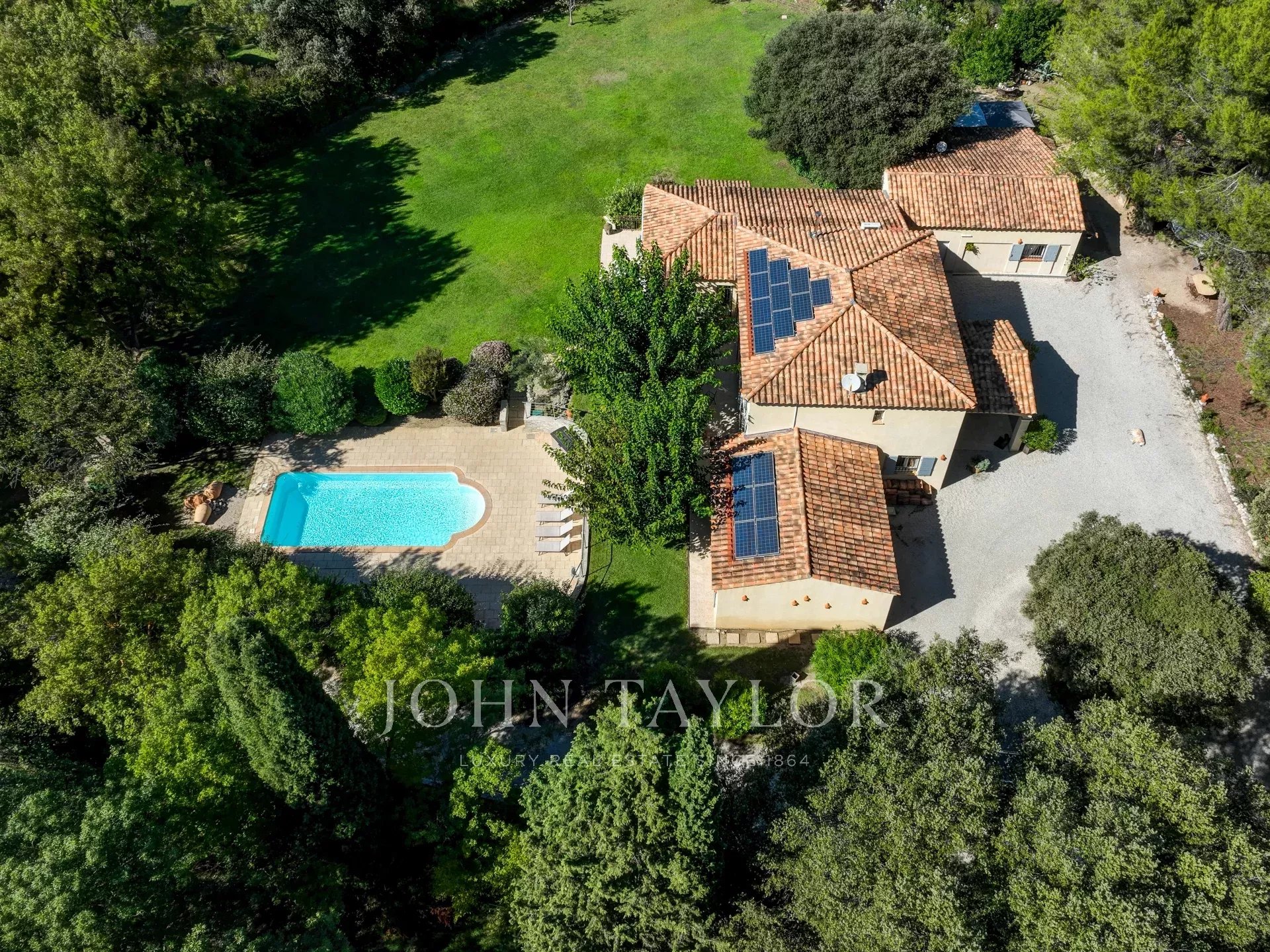 Una piscina adorna el jardín, mientras que una cocina de verano y una gran terraza que bordea la casa son ideales para disfrutar del aire libre durante todo el año.