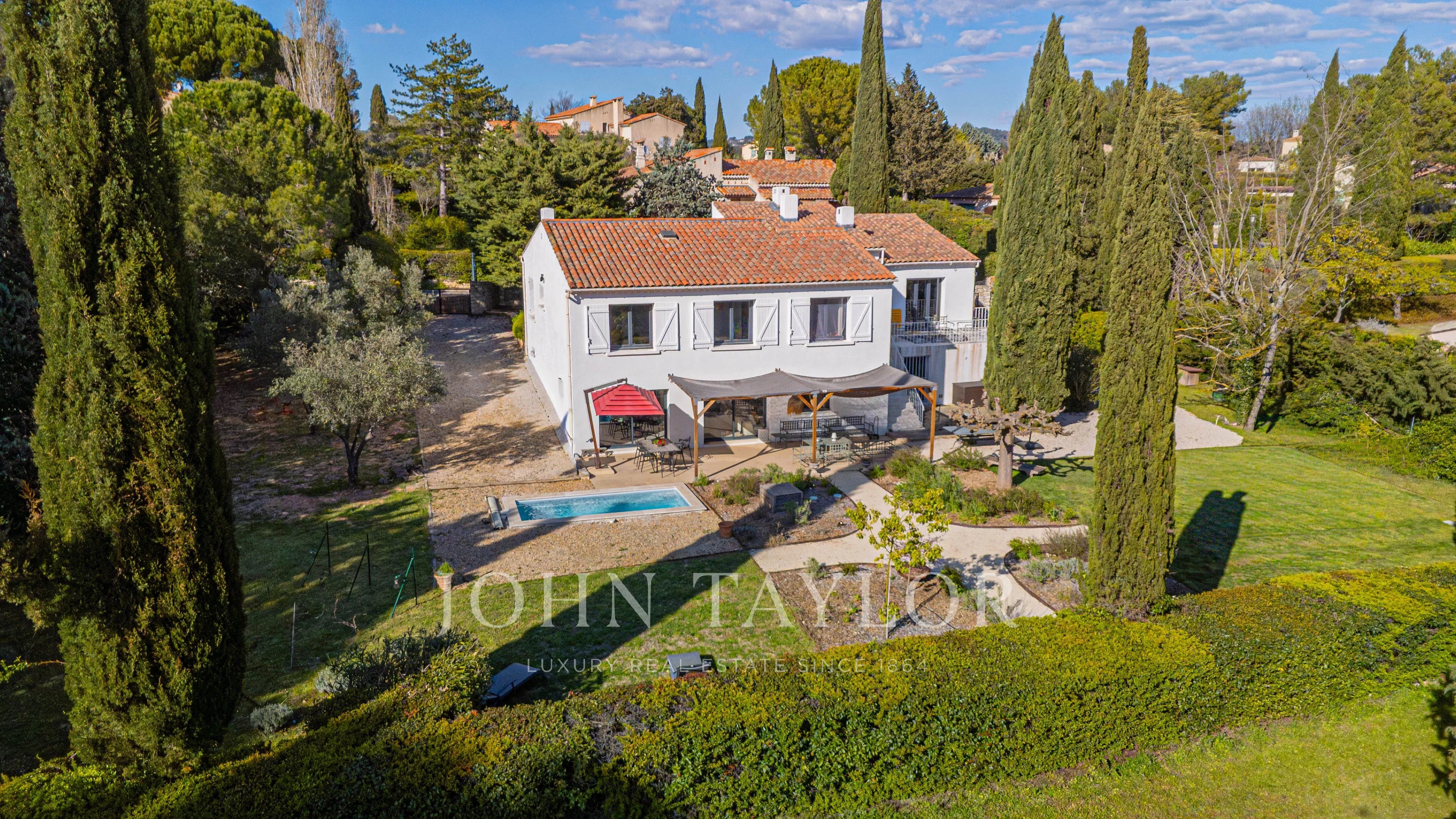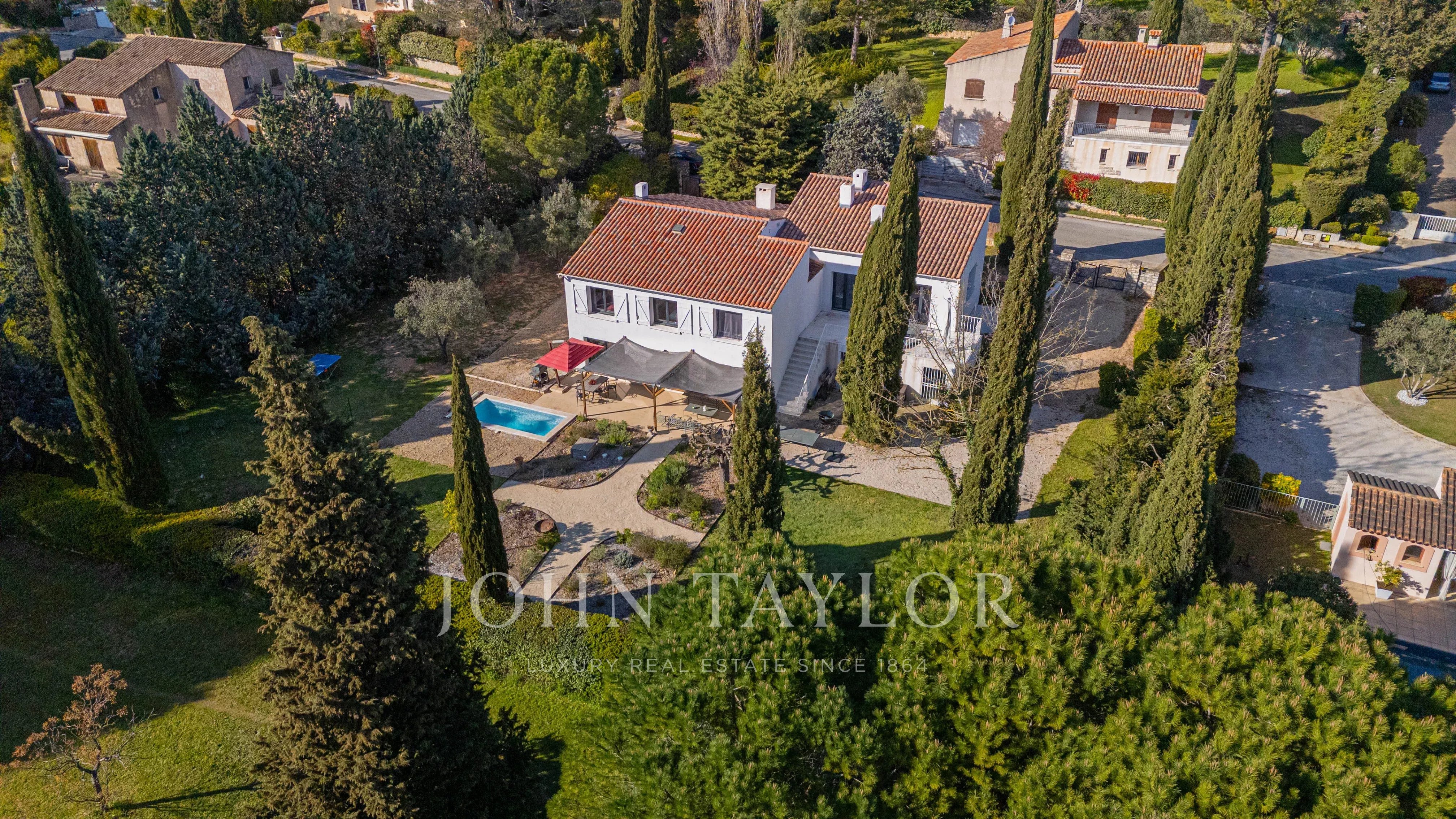 Una casa familiar con piscina en Aix-en-Provence, que combina renovación de calidad, seguridad (guardia en la residencia) y proximidad inmediata a servicios y autobuses.