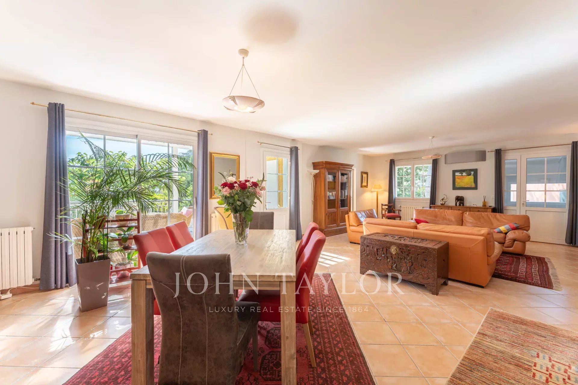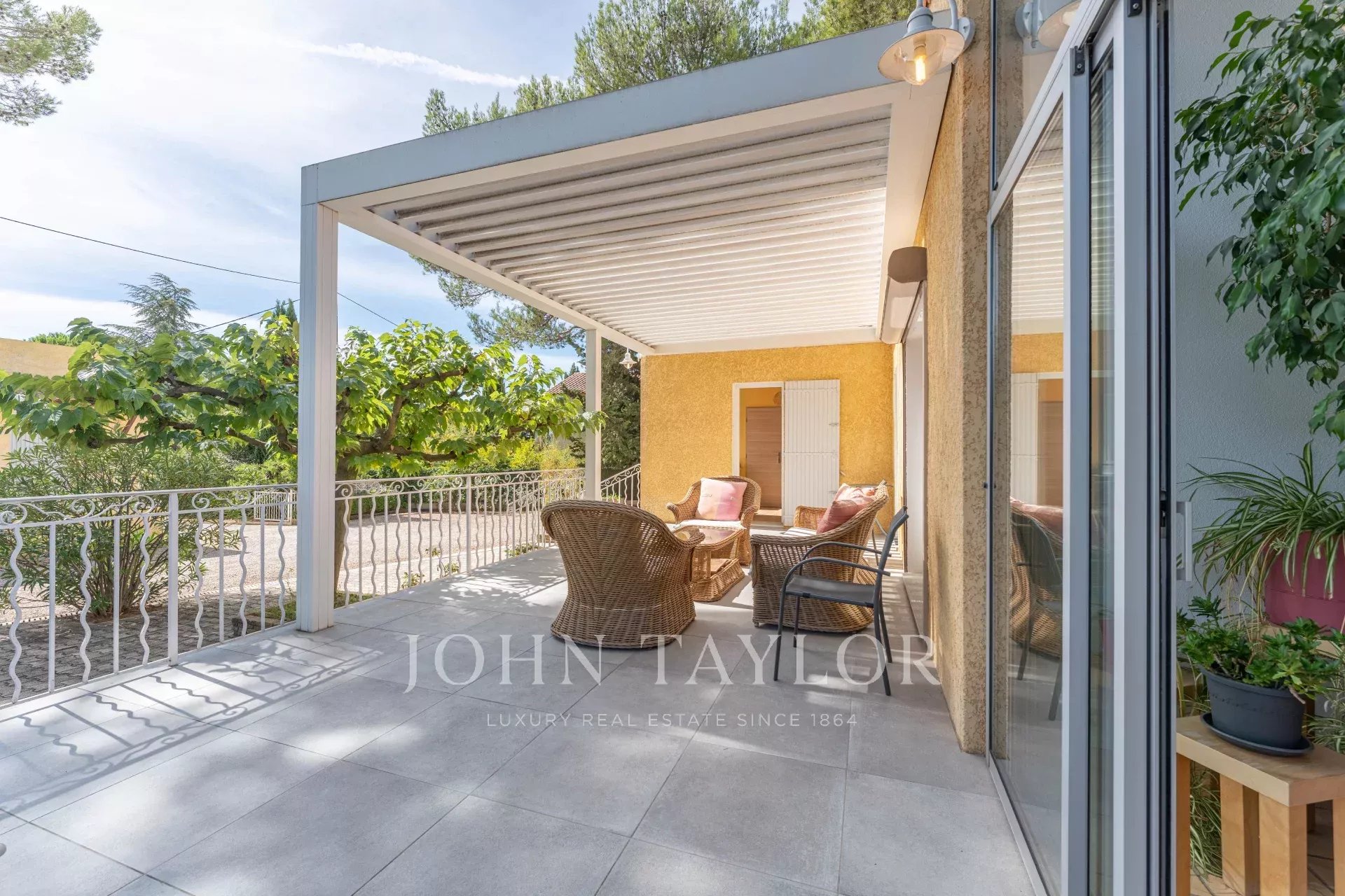 Se articula en torno a un amplio salón de 55 m², abierto a una terraza con pérgola bioclimática, prolongada por un porche que puede utilizarse todo el año.