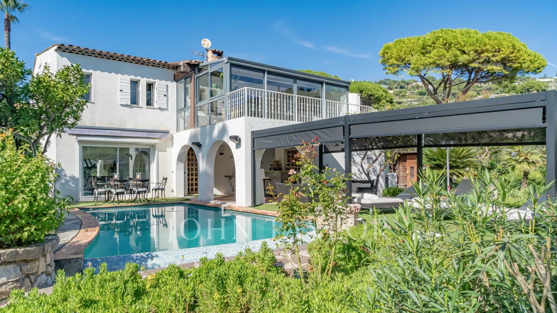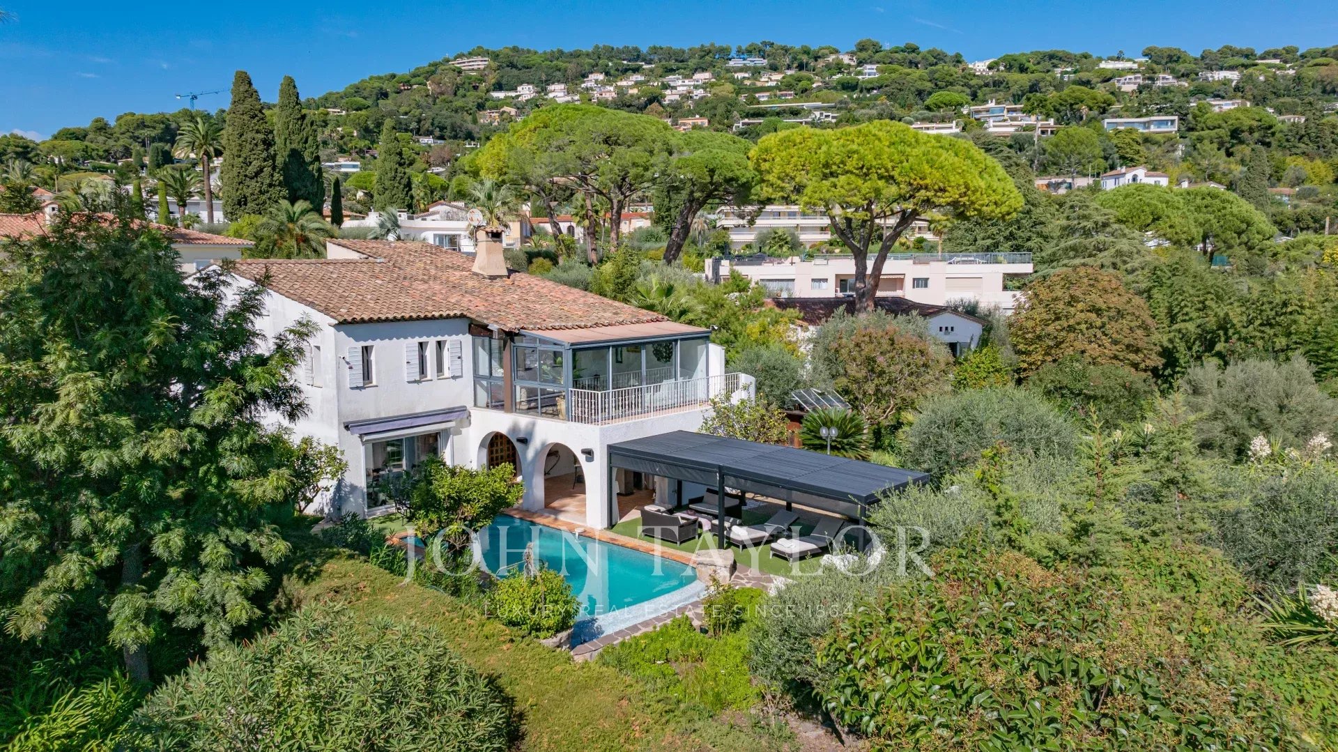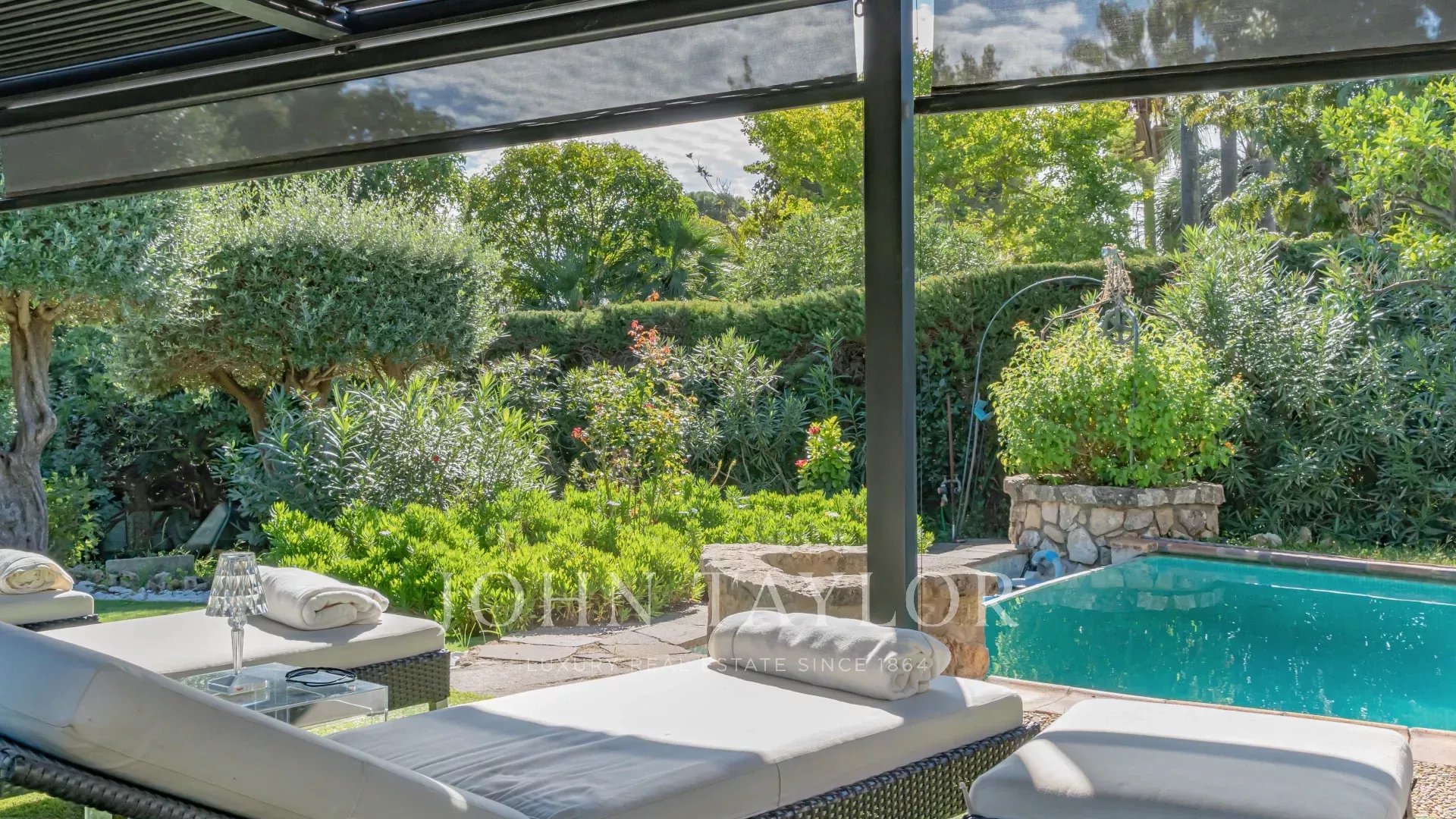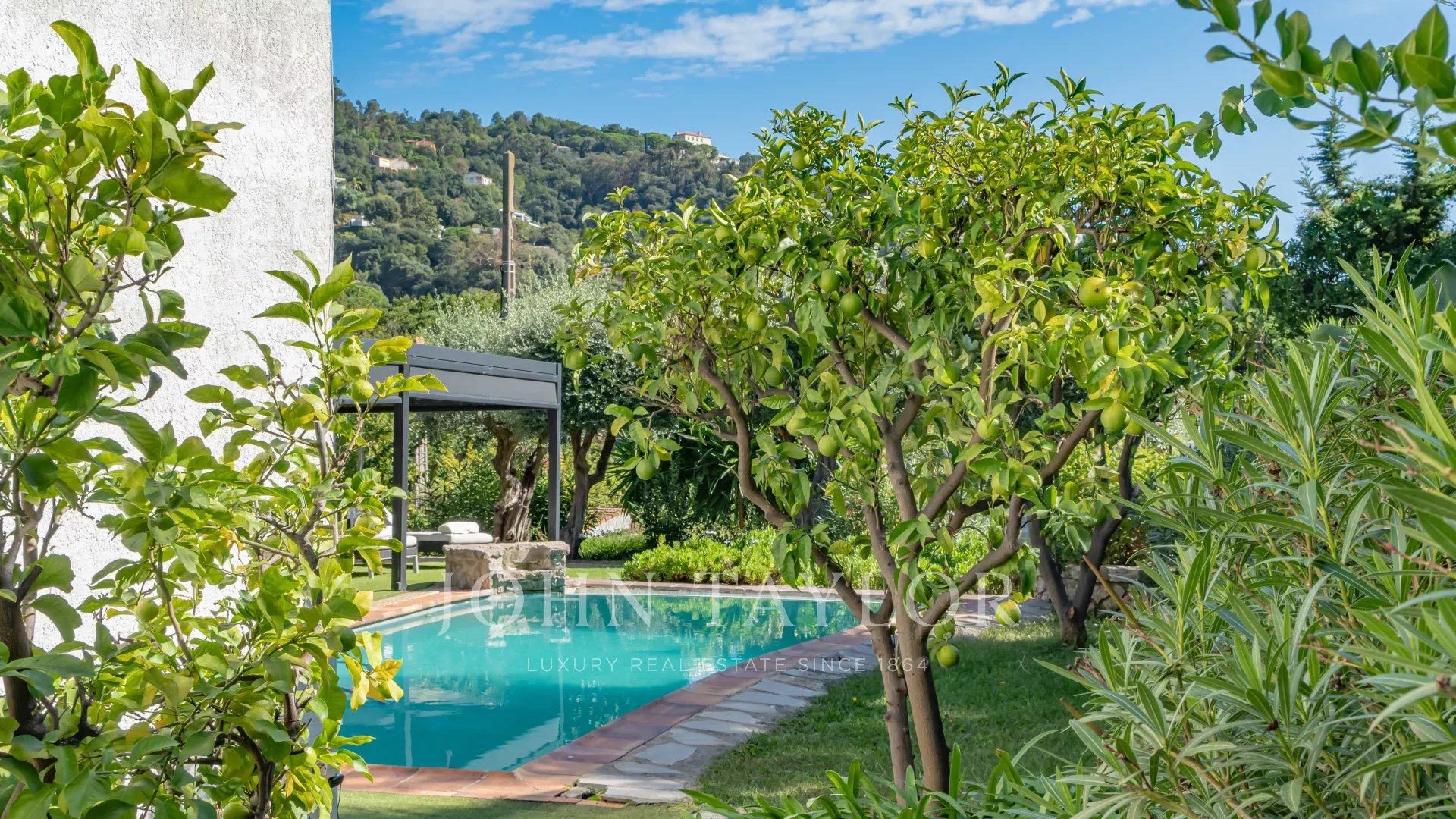 Cerca del centro de la ciudad, esta villa goza de un entorno verde. Su espacio exterior, plantado con numerosas especies mediterráneas, cuenta con varias terrazas que rodean la piscina.