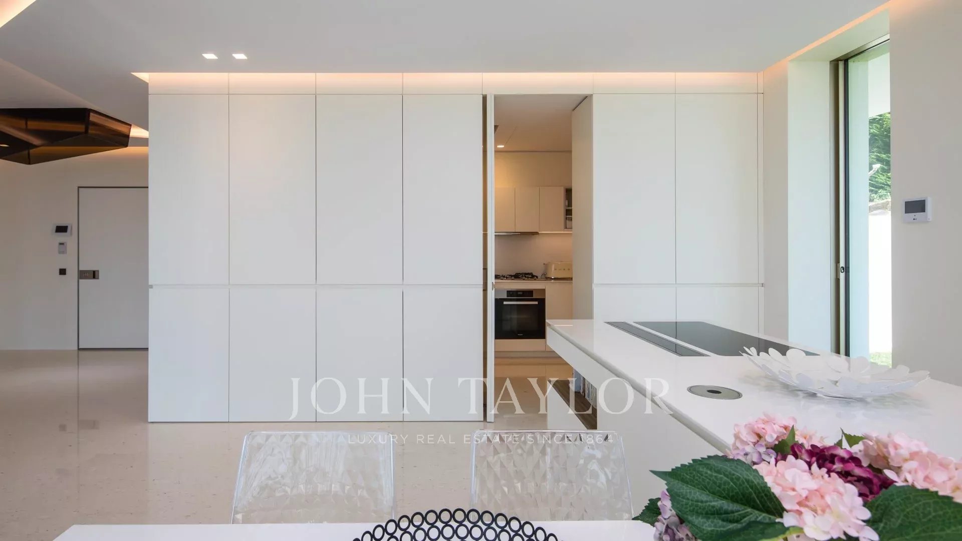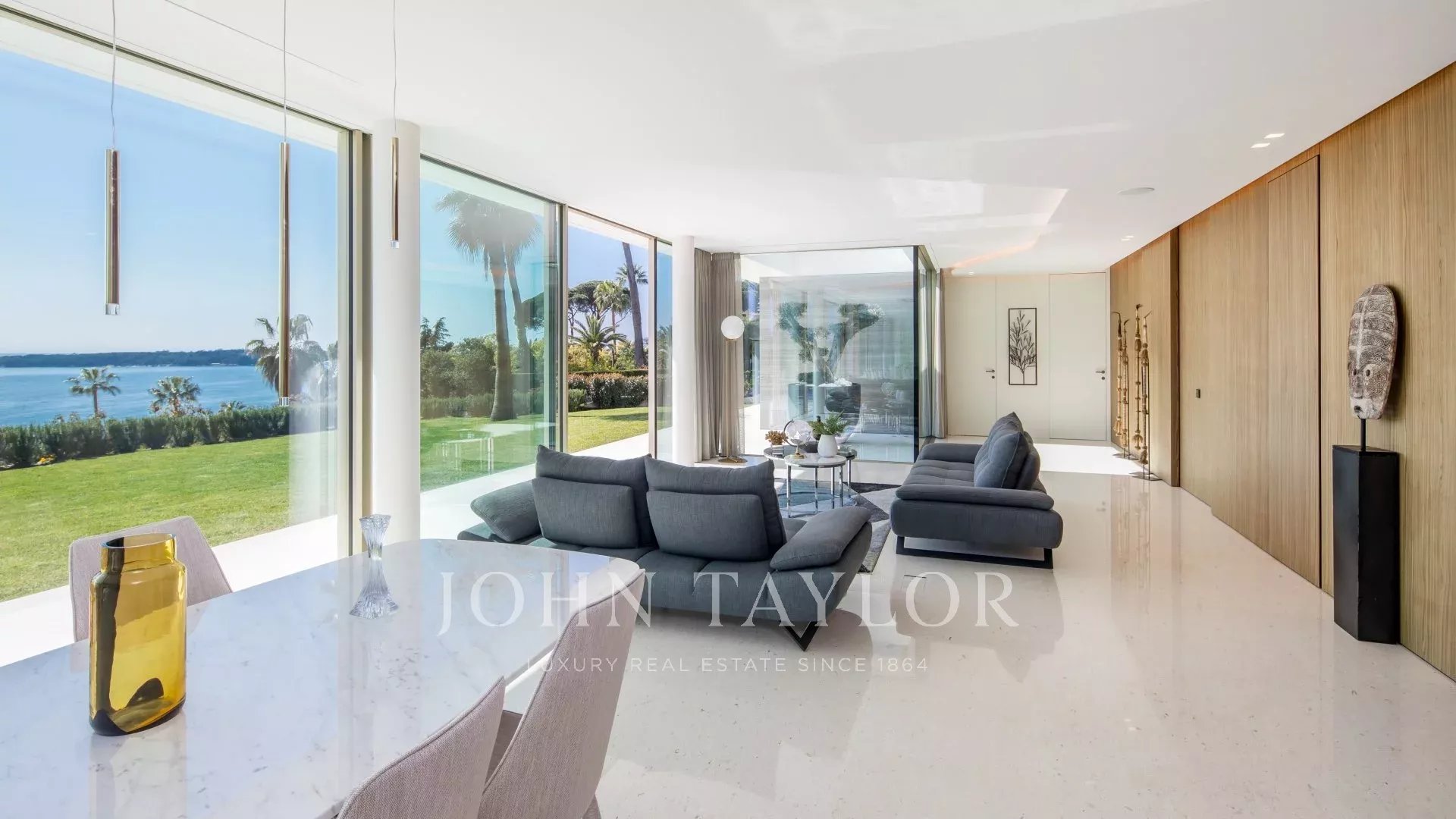 La villa goza de la máxima apertura gracias a sus paredes de cristal y grandes ventanales que comunican la casa con el campo circundante. La mayoría de las estancias se extienden por amplias terrazas y ofrecen una vista privilegiada del mar y de la isla de Sainte Marguerite.