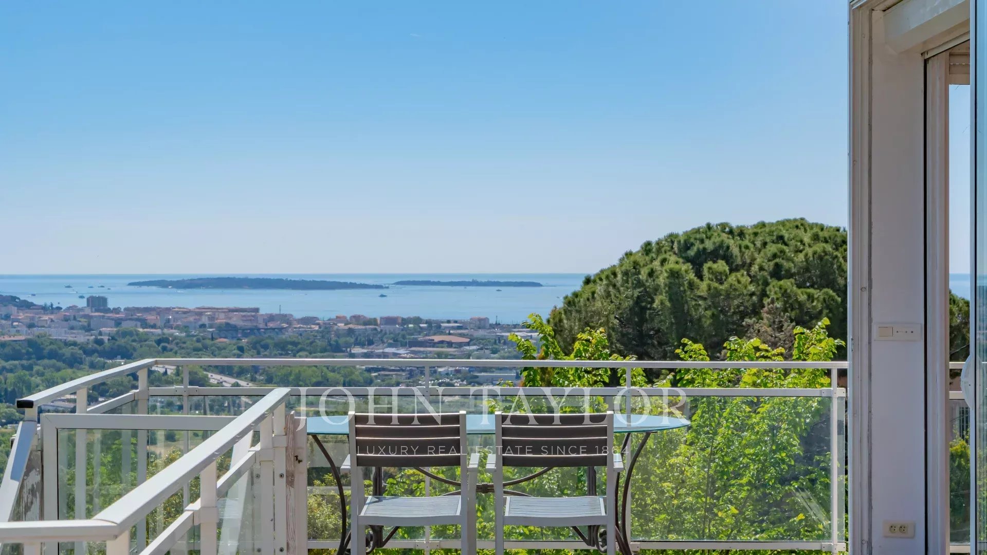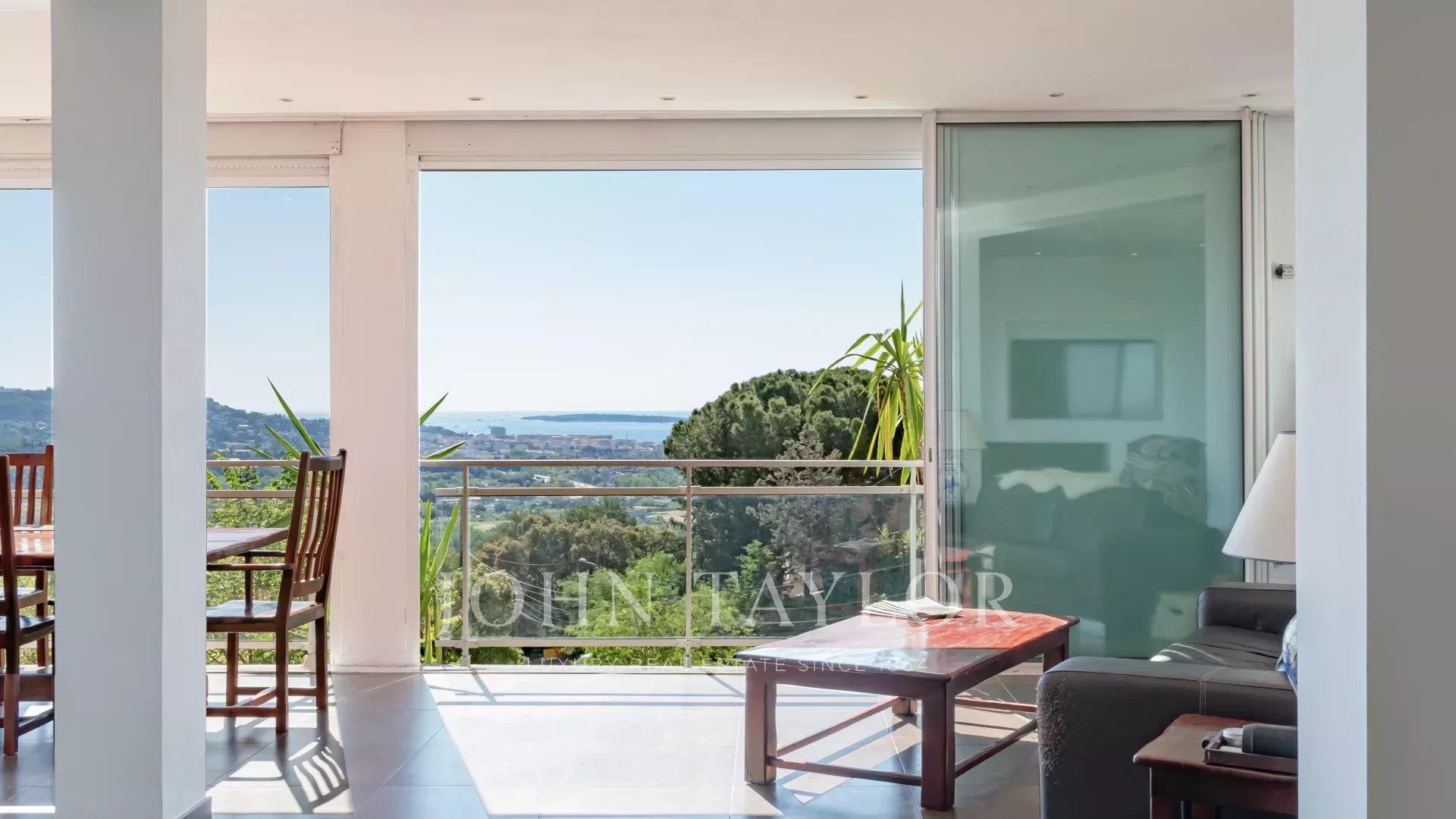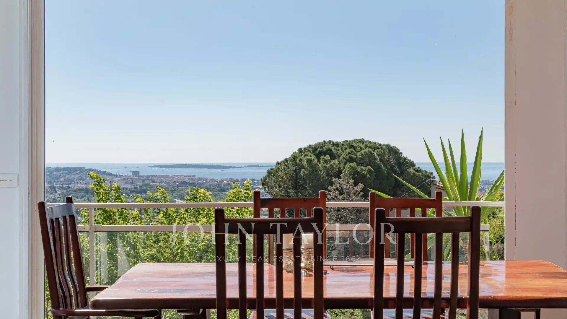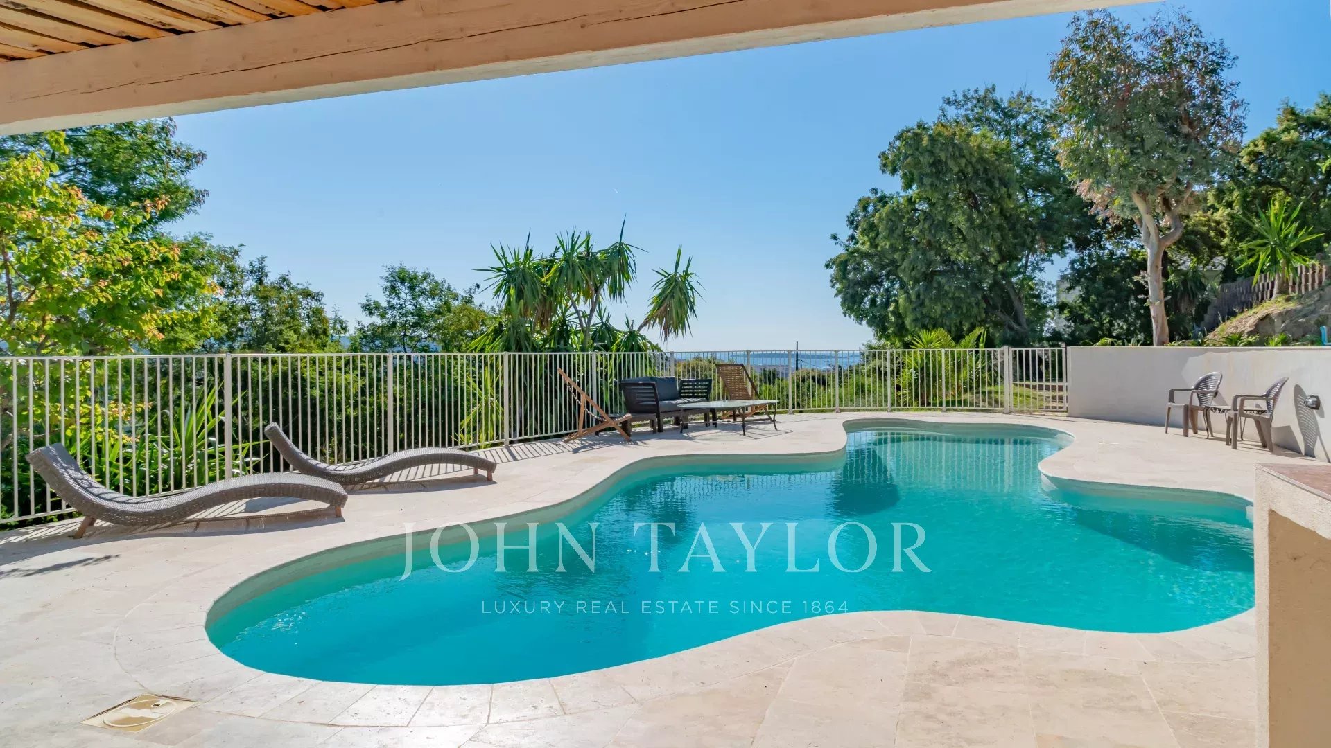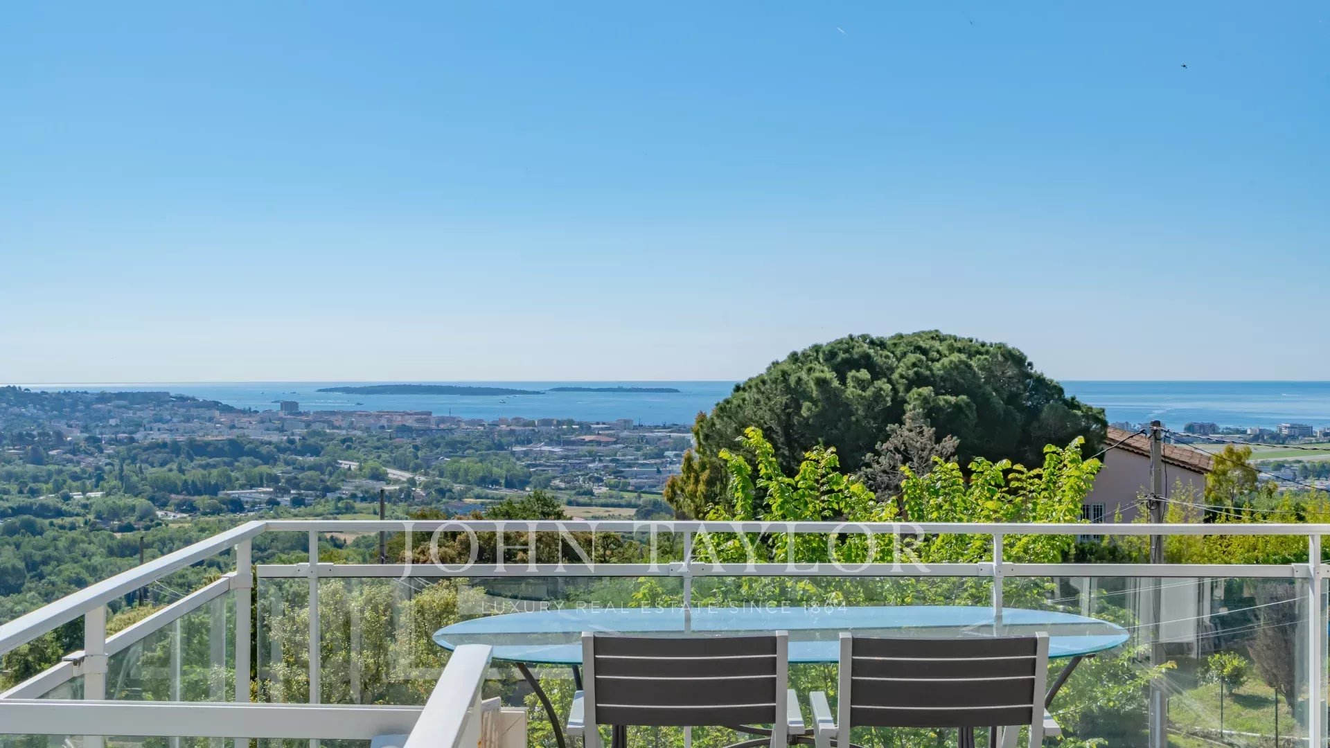 Situada en la ladera de Mandelieu, esta villa de estilo contemporáneo goza de unas impresionantes vistas panorámicas de 270 grados sobre las islas, la bahía de Cannes, el macizo del Estérel y los Alpes.
