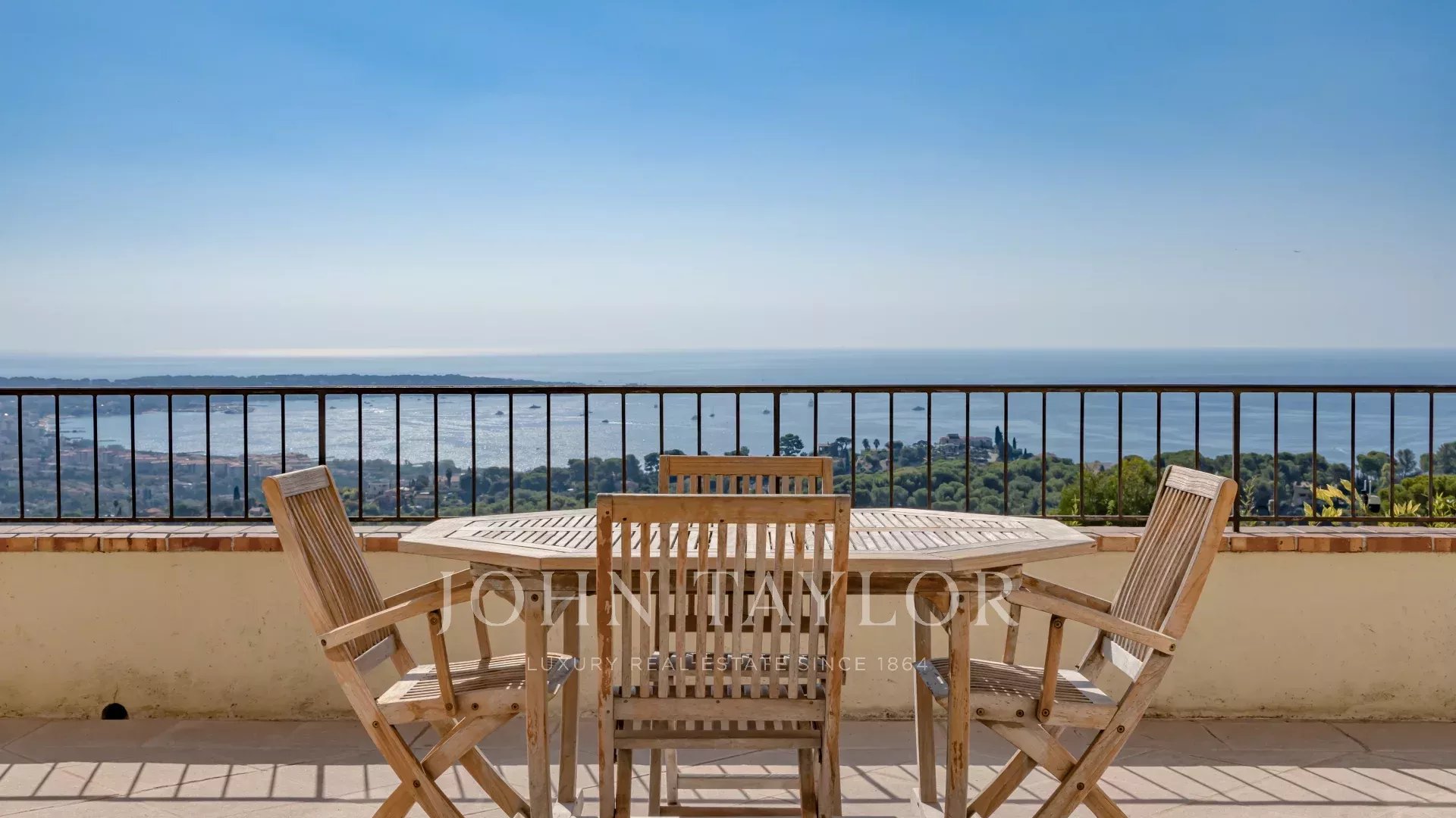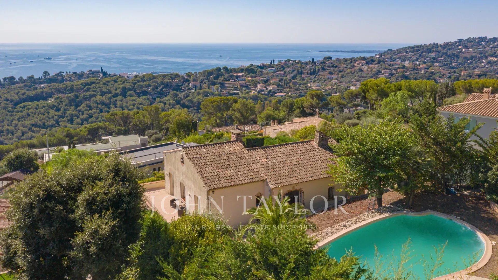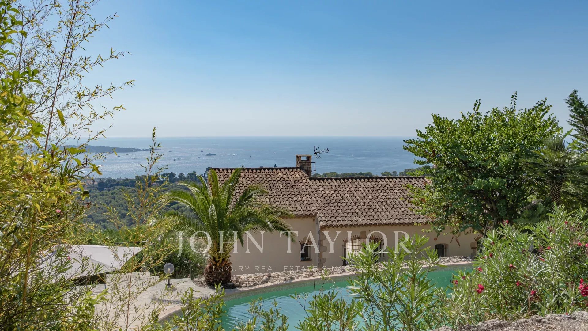 En las alturas de Golfe Juan, cerca de las carreteras principales, esta villa provenzal situada en 1820 m² de terreno con piscina ofrece unas vistas excepcionales del mar y del Cap d'Antibes.