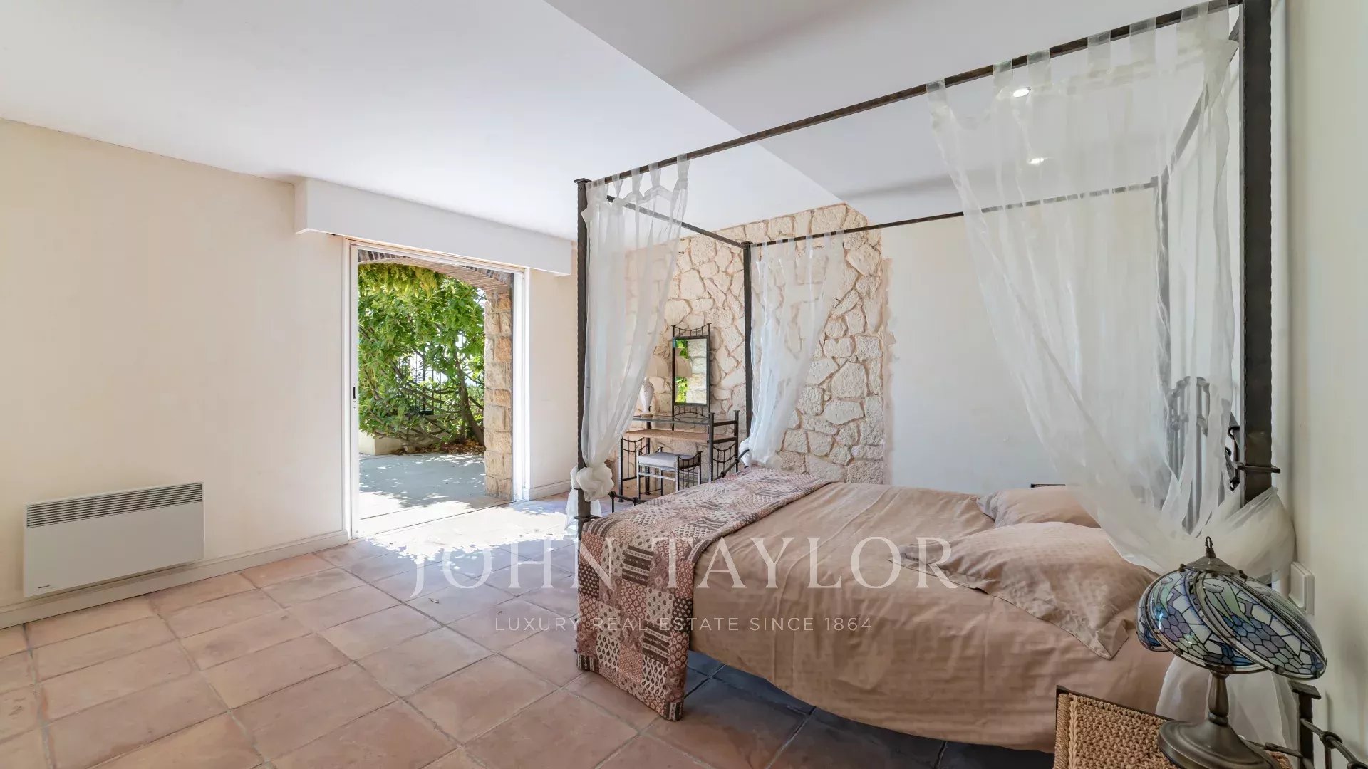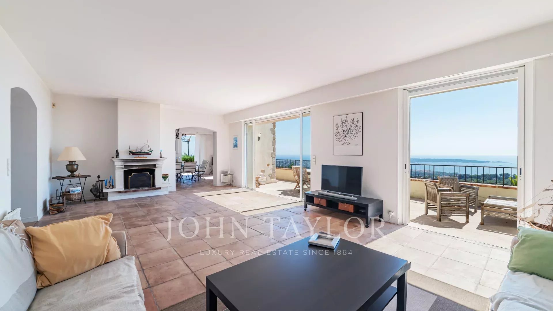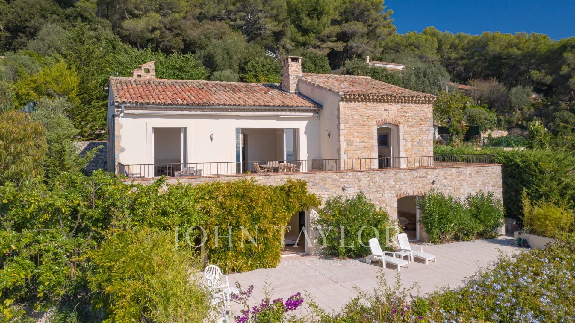 En las alturas de Golfe Juan, cerca de las carreteras principales, esta villa provenzal situada en 1820 m² de terreno con piscina ofrece unas vistas excepcionales del mar y del Cap d'Antibes.