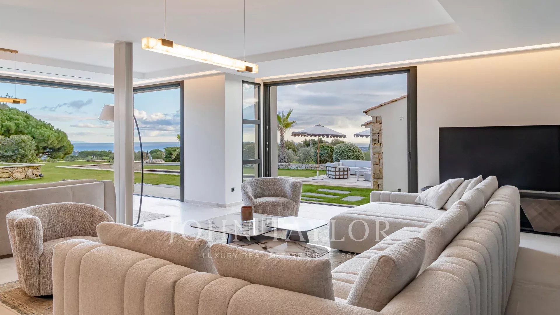 Esta villa contemporánea de unos 382 m² se encuentra en una urbanización cerrada en la prestigiosa zona residencial de Super Cannes, extremadamente tranquila. Situado en una posición dominante en 2.090 m² de terreno, la propiedad goza de unas vistas sublimes de Cap d'Antibes sobre los Alpes hasta las montañas italianas.