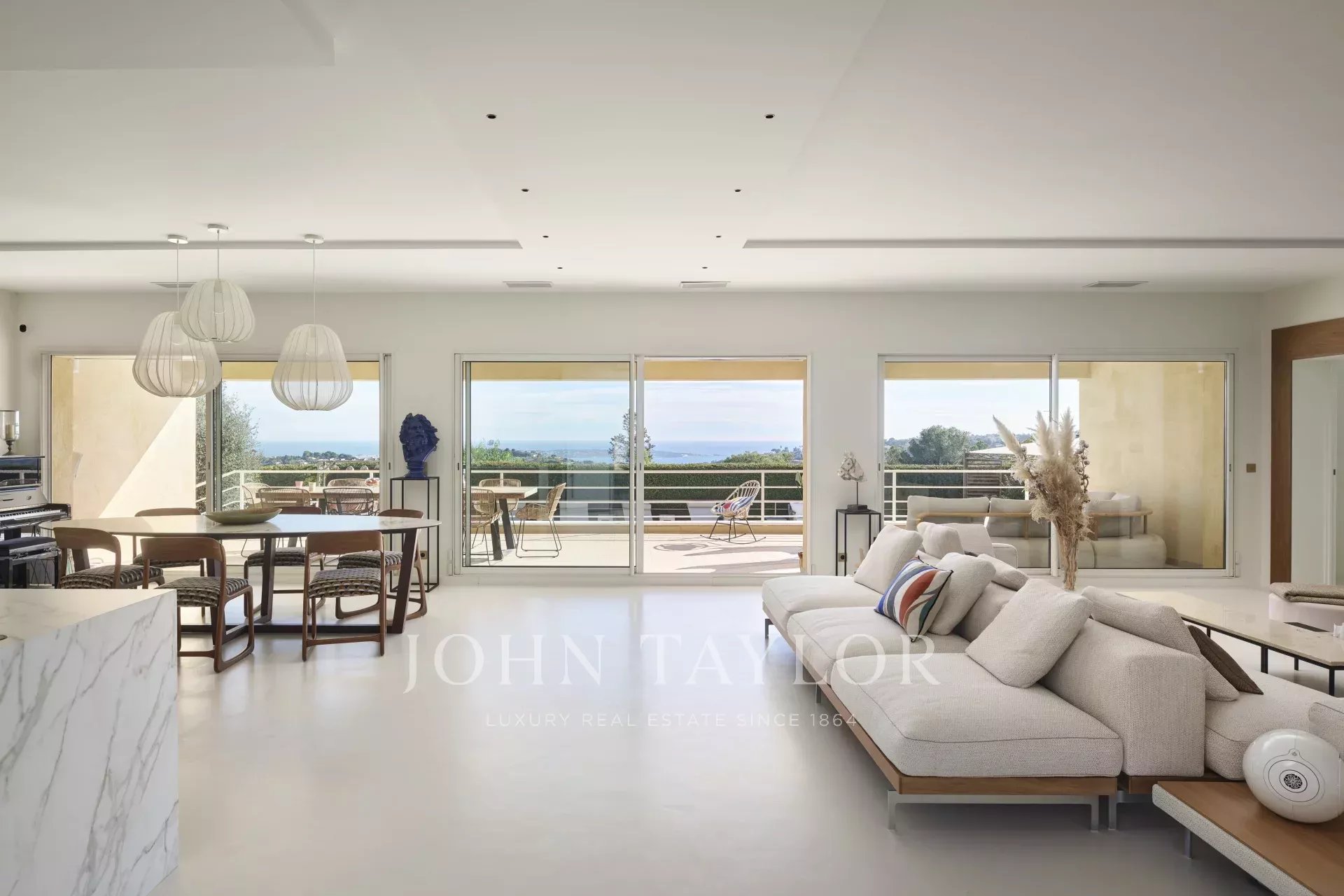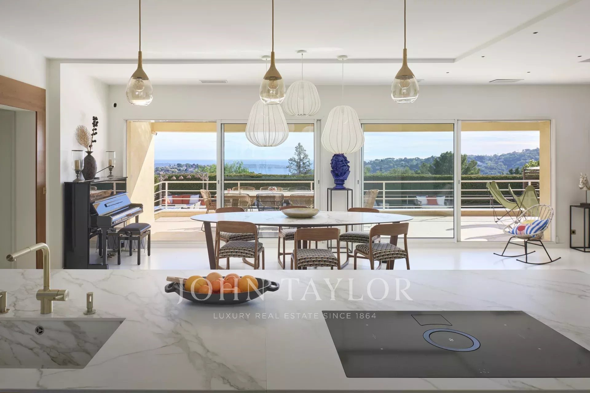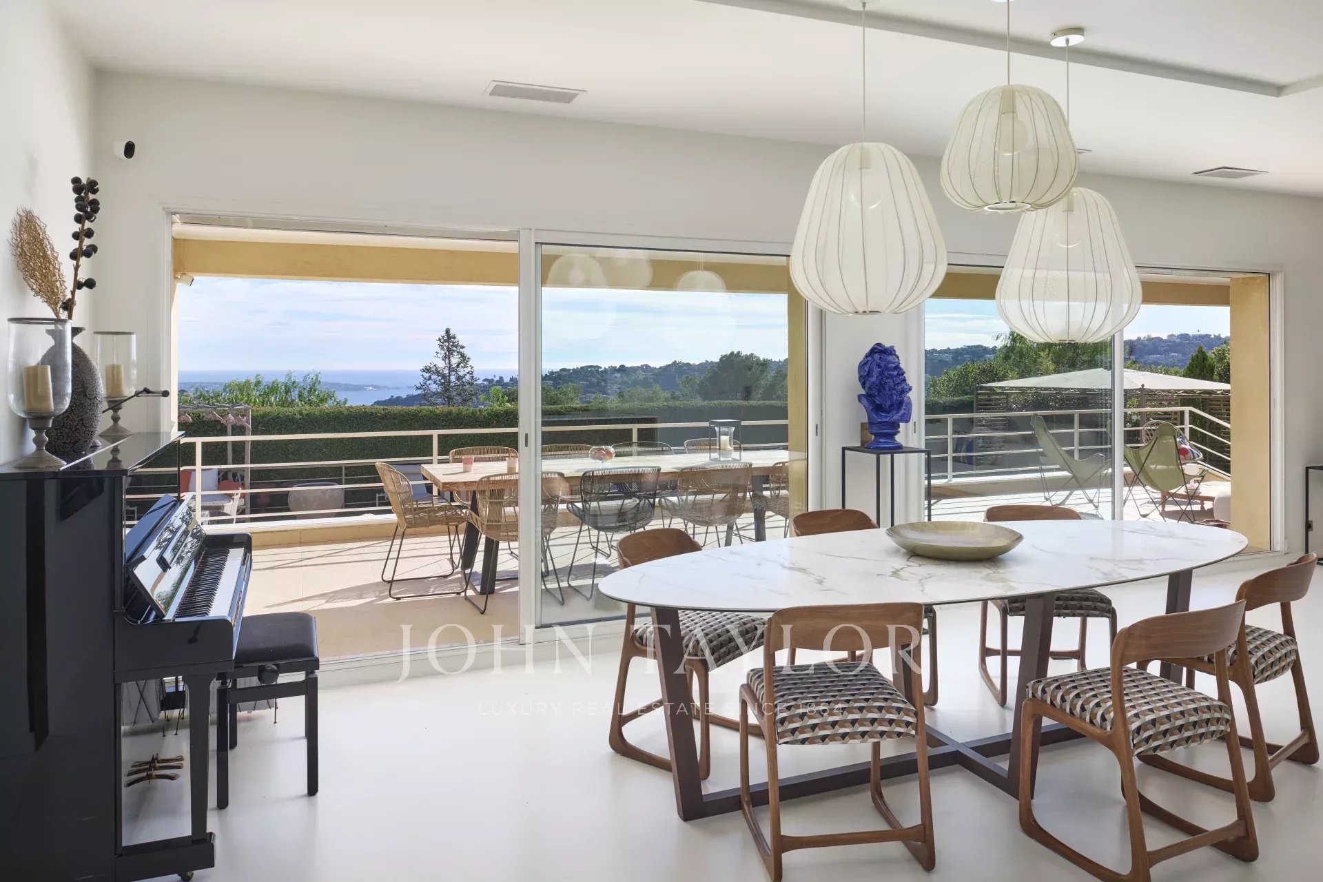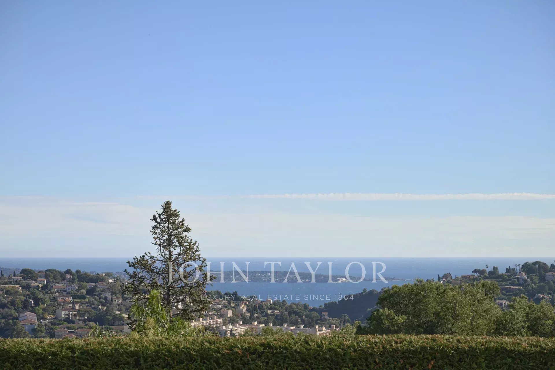 Esta bonita y moderna villa de una sola planta situada en las alturas de Vallauris, a dos pasos de las principales vías de comunicación y del centro de Cannes, ofrece vistas panorámicas al mar, al Cap d'Antibes y a las montañas.