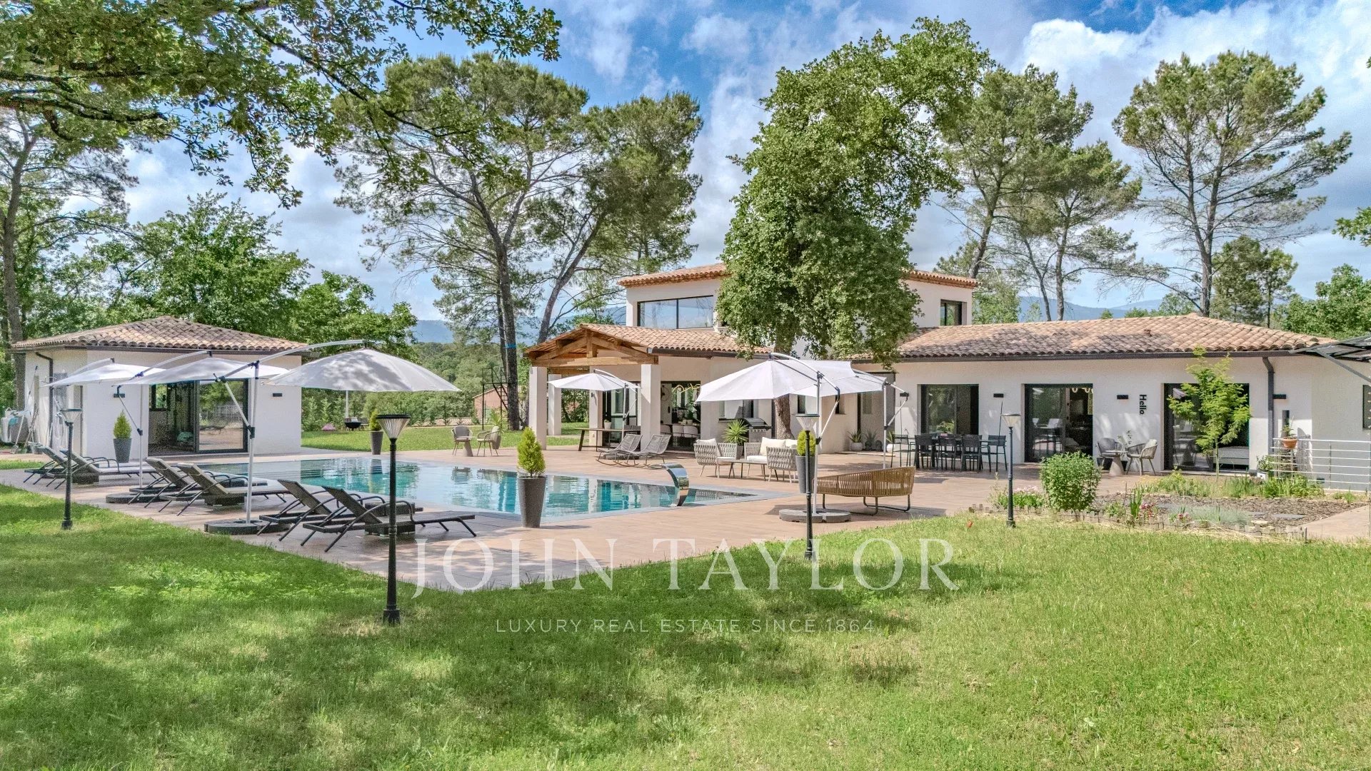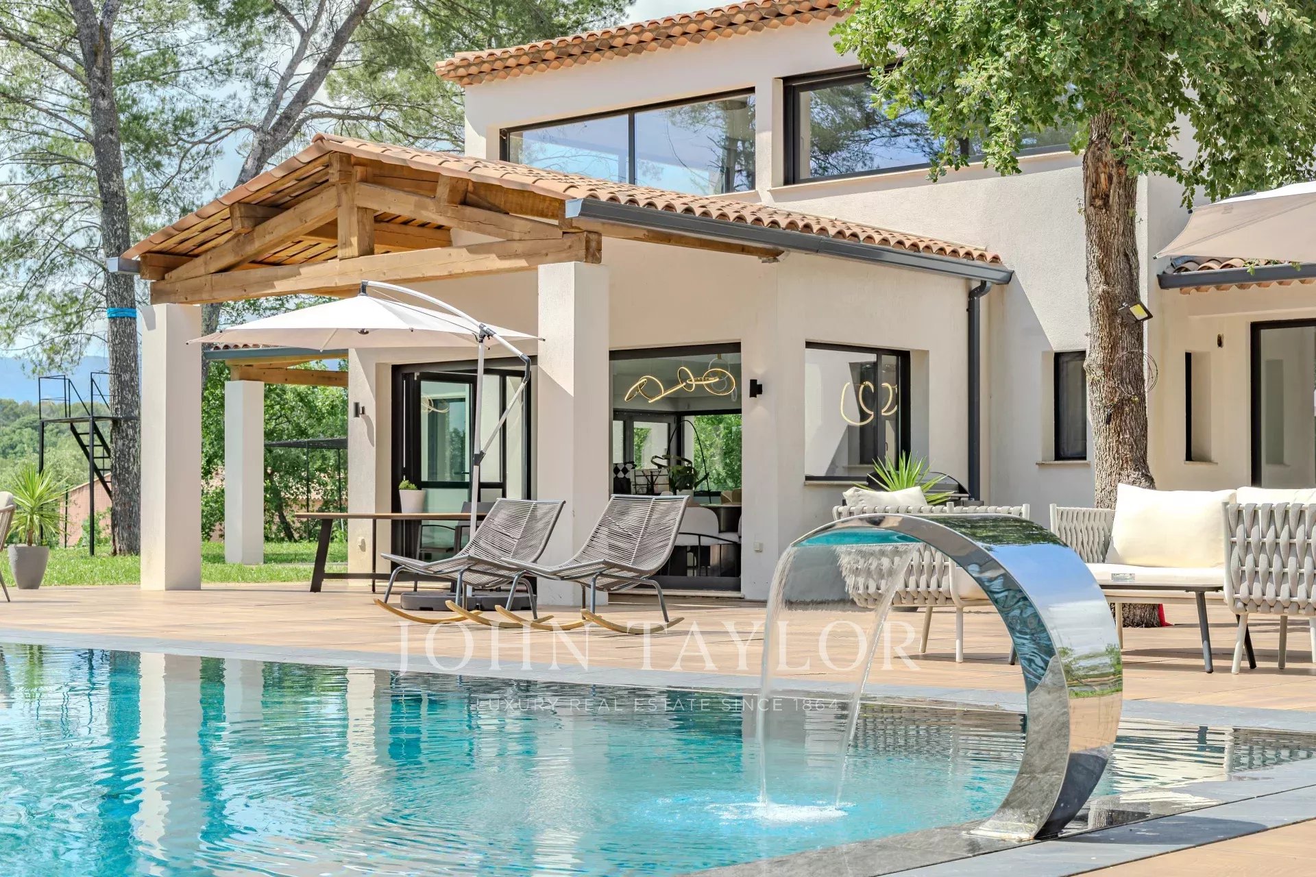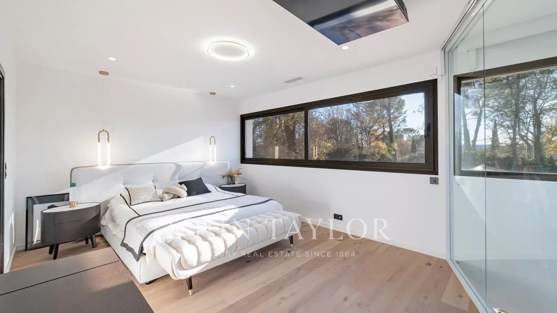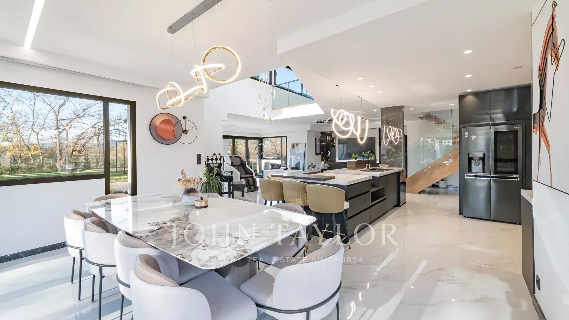 Esta villa contemporánea de diseño arquitectónico, construida en 2023, con una superficie total de unos 543 m², se encuentra en 4.200 m² de terreno llano en un entorno residencial codiciado y tranquilo, justo al lado de la prestigiosa urbanización Terre Blanche.
