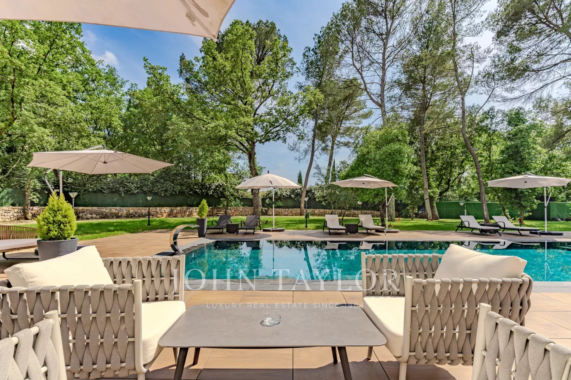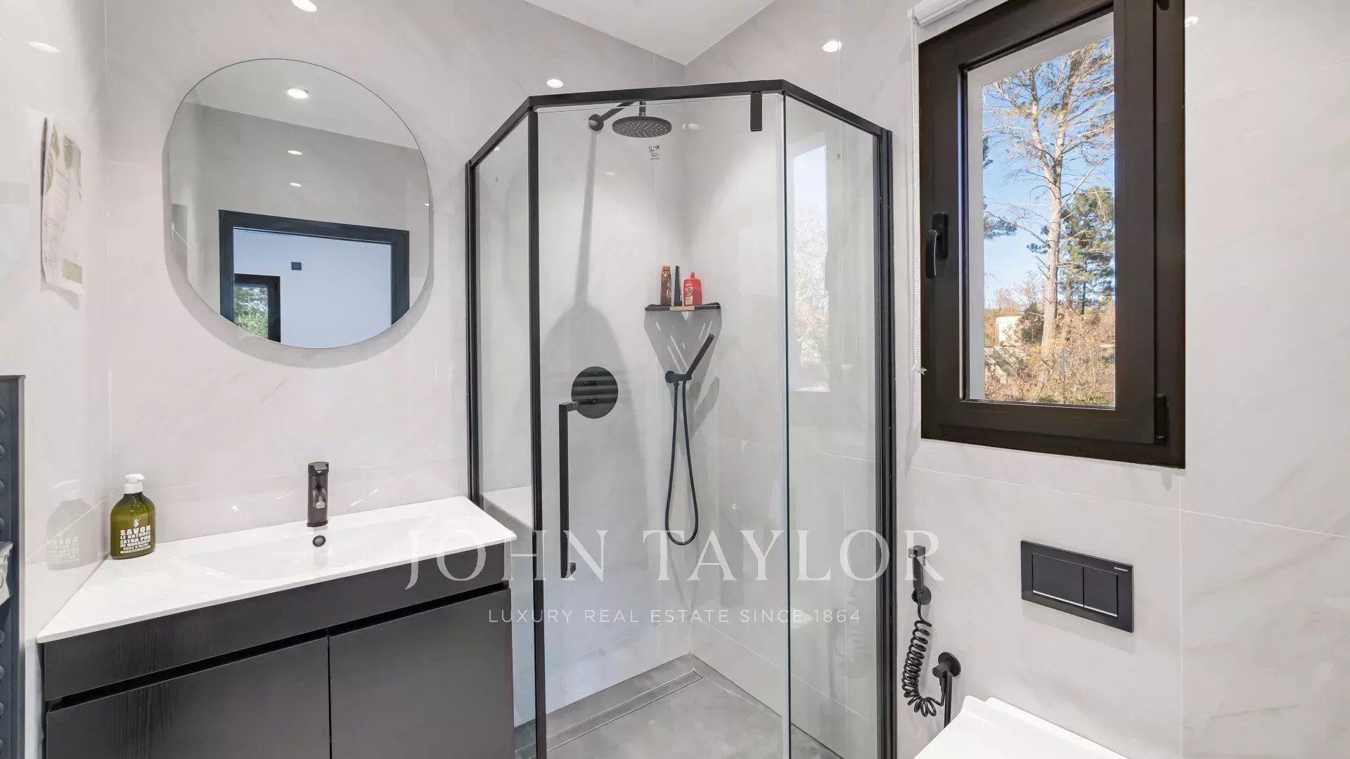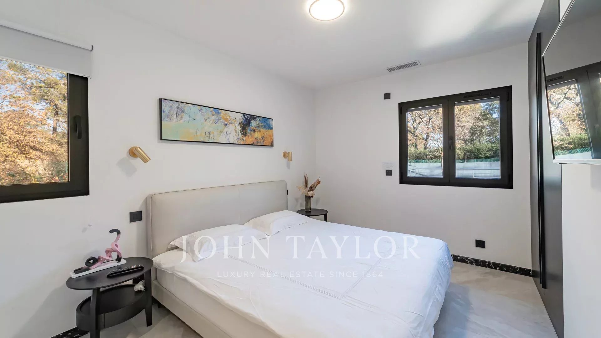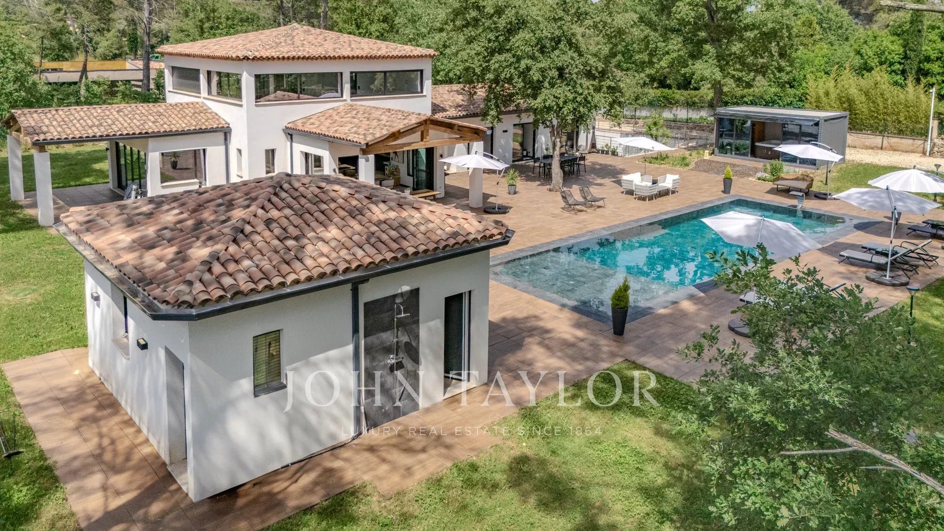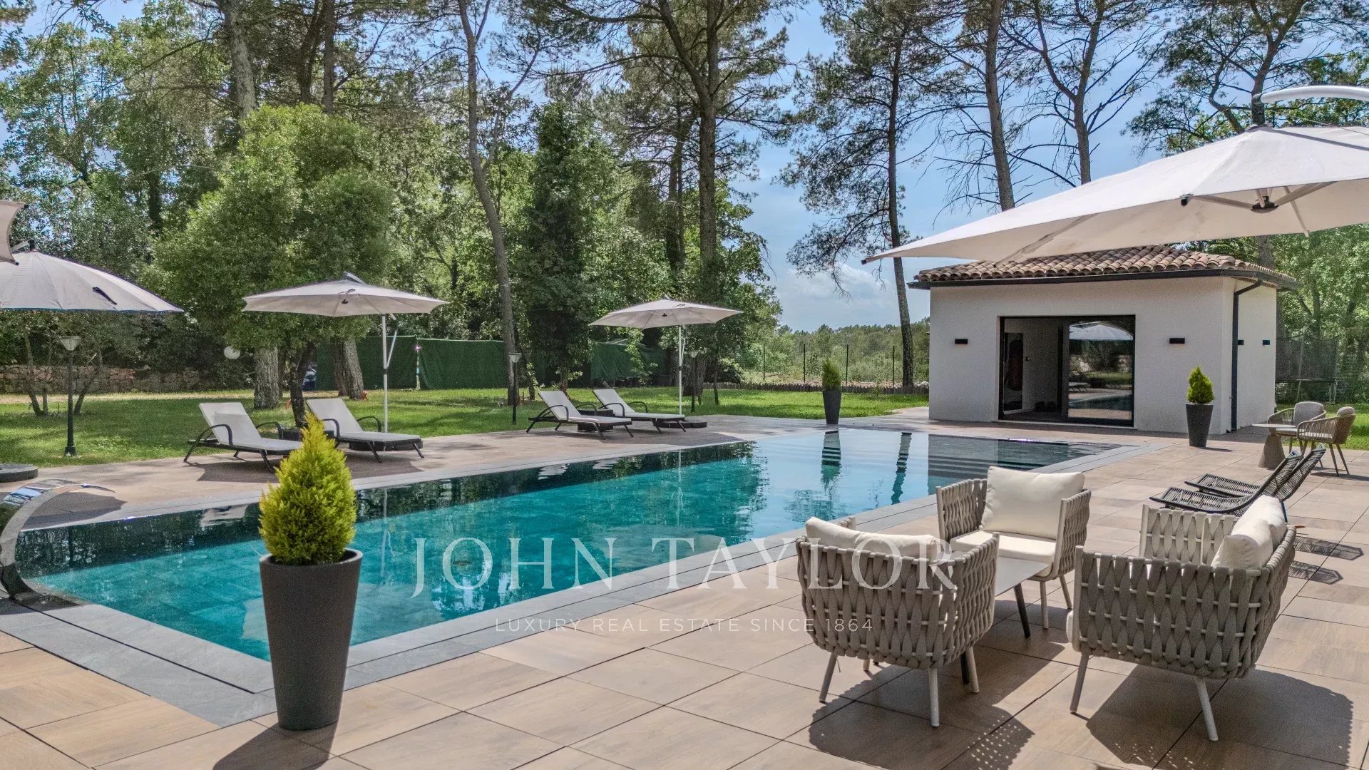 Esta villa contemporánea de diseño arquitectónico, construida en 2023, con una superficie total de unos 543 m², se encuentra en 4.200 m² de terreno llano en un entorno residencial codiciado y tranquilo, justo al lado de la prestigiosa urbanización Terre Blanche.