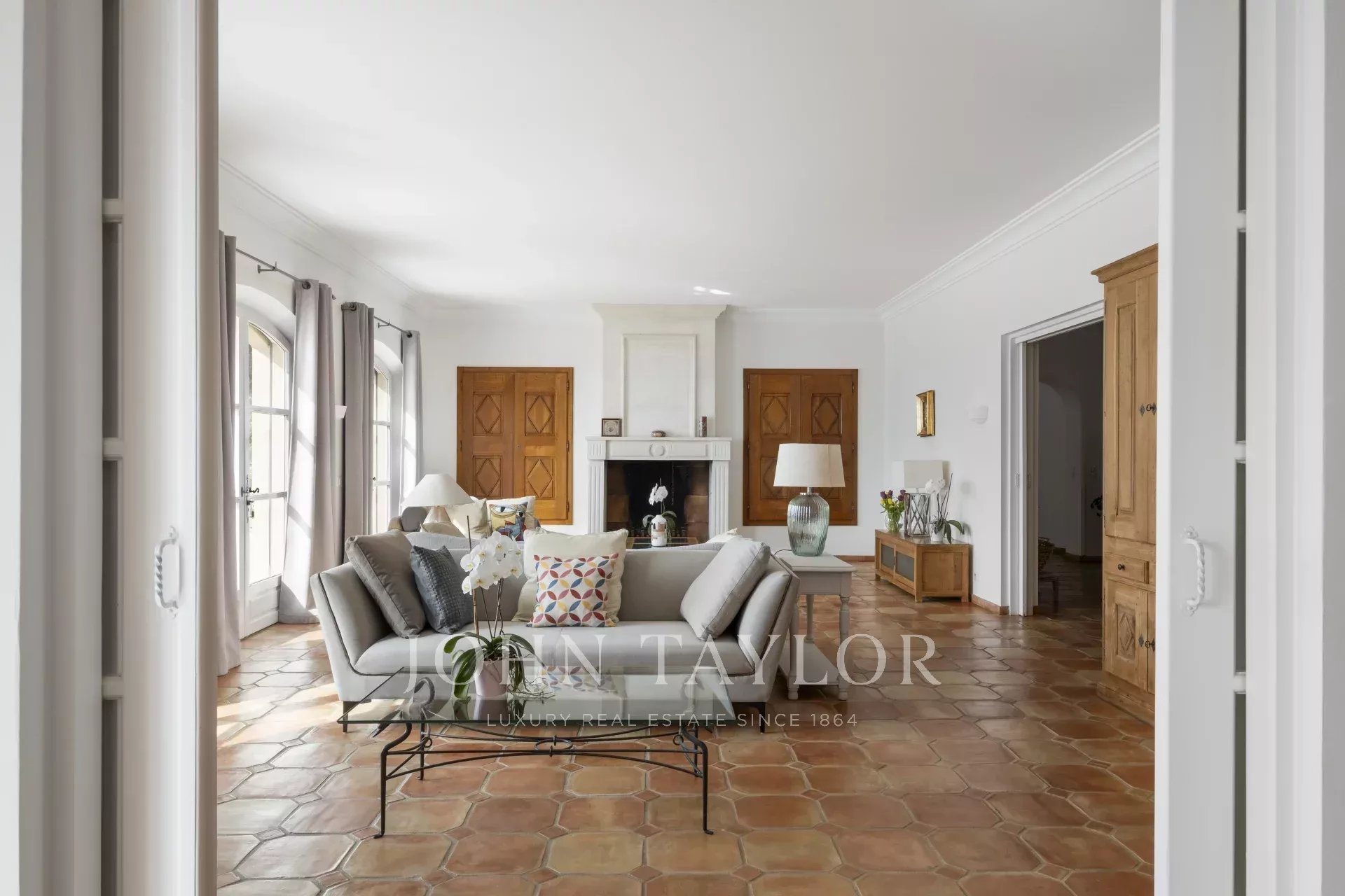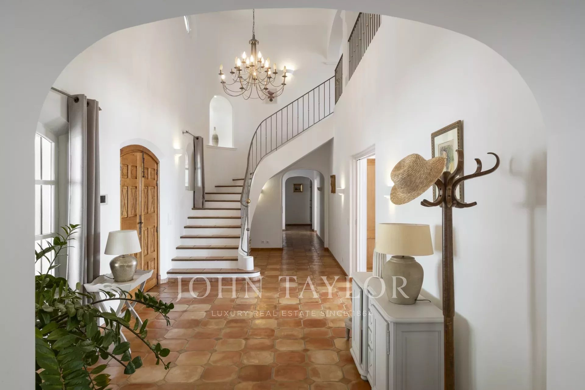 Un magnífico hall de entrada con techo de doble altura conduce al amplio salón-comedor, con su elegante chimenea y grandes ventanales que dan a una inmensa terraza. La encantadora cocina provenzal, con su gran chimenea, ofrece un espacio acogedor para las comidas familiares. En el mismo nivel, también encontrará un estudio, dos dormitorios, incluyendo una suite principal con un atractivo cuarto de baño, vestidor y su propia terraza privada, así como una sala de lavandería, trastero y guardarropa.