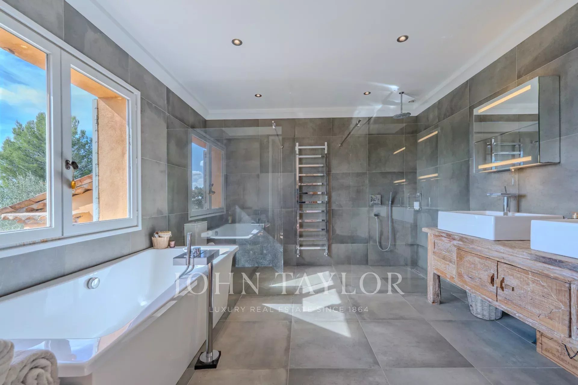 Una cochera para tres vehículos completa el confort de esta magnífica propiedad, idealmente situada cerca de renombrados campos de golf y centros de enseñanza, y a sólo 40 minutos de Cannes.