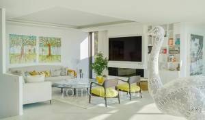 El nivel principal se abre a una amplia sala de estar con vistas panorámicas de 180 grados. Este espacio incluye un hall de entrada, una cocina equipada, un lavadero, un comedor, una sala de estar con chimenea y una suite principal con vestidor y amplio cuarto de baño. Todos los ventanales de la sala de estar ofrecen magníficas vistas al mar y a los pinares, así como acceso a la gran terraza exterior.