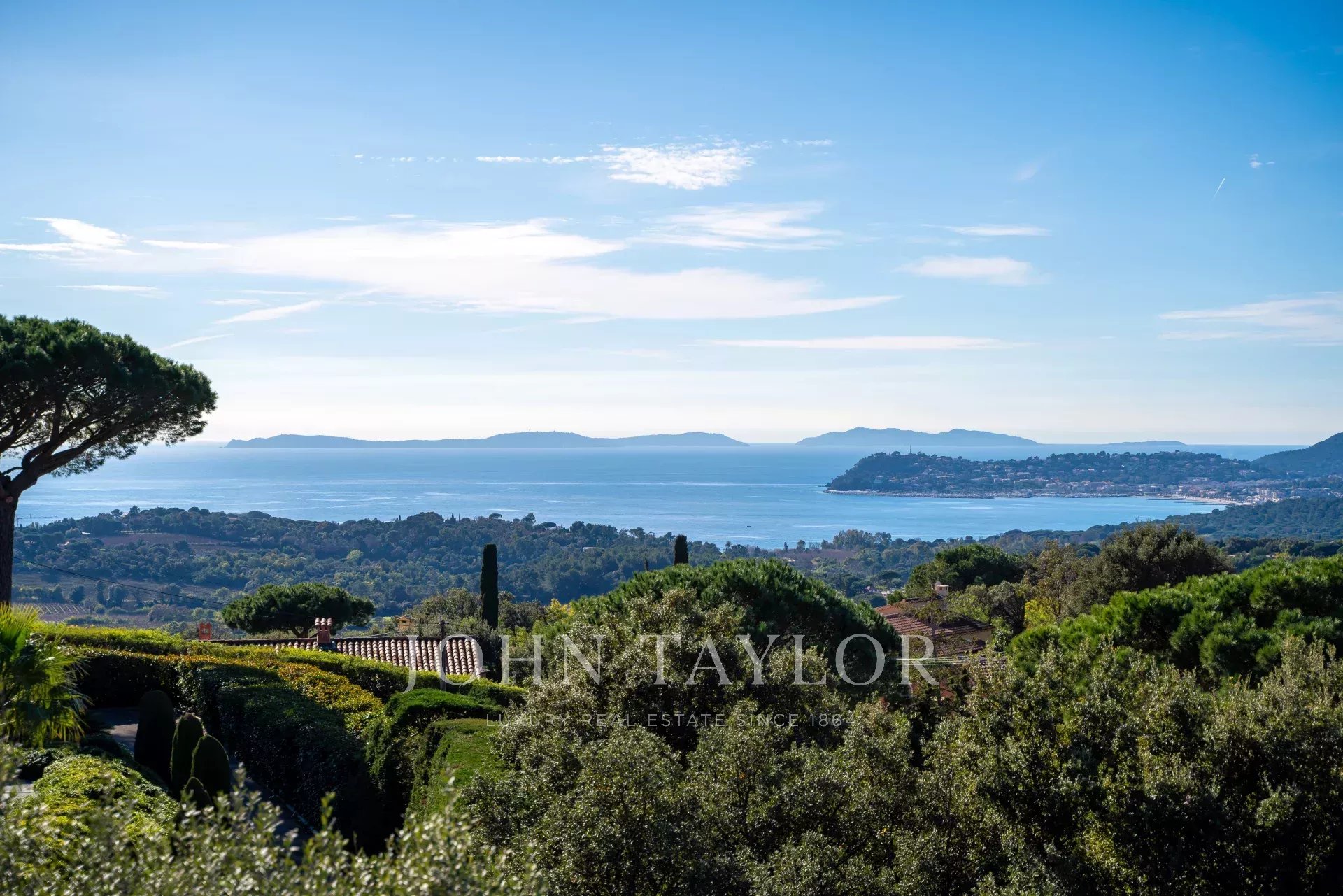 Enclavada en la ladera de una colina, la propiedad está orientada al sur y ofrece unas vistas excepcionales del mar Mediterráneo, las islas Doradas y el puerto de Cavalaire-sur-Mer.