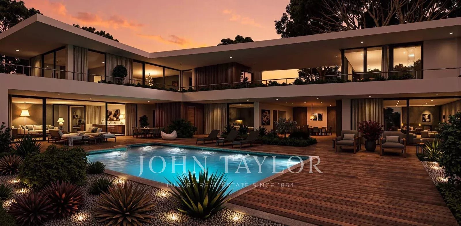 Principalmente en un nivel, la casa tiene cinco dormitorios, incluyendo una espaciosa suite principal con vestidor y baño, así como otros tres dormitorios en suite con entradas independientes. En el exterior, una piscina de 15 metros invita a relajarse. Un vasto sótano de más de 100 m² está disponible para su conversión según sea necesario.