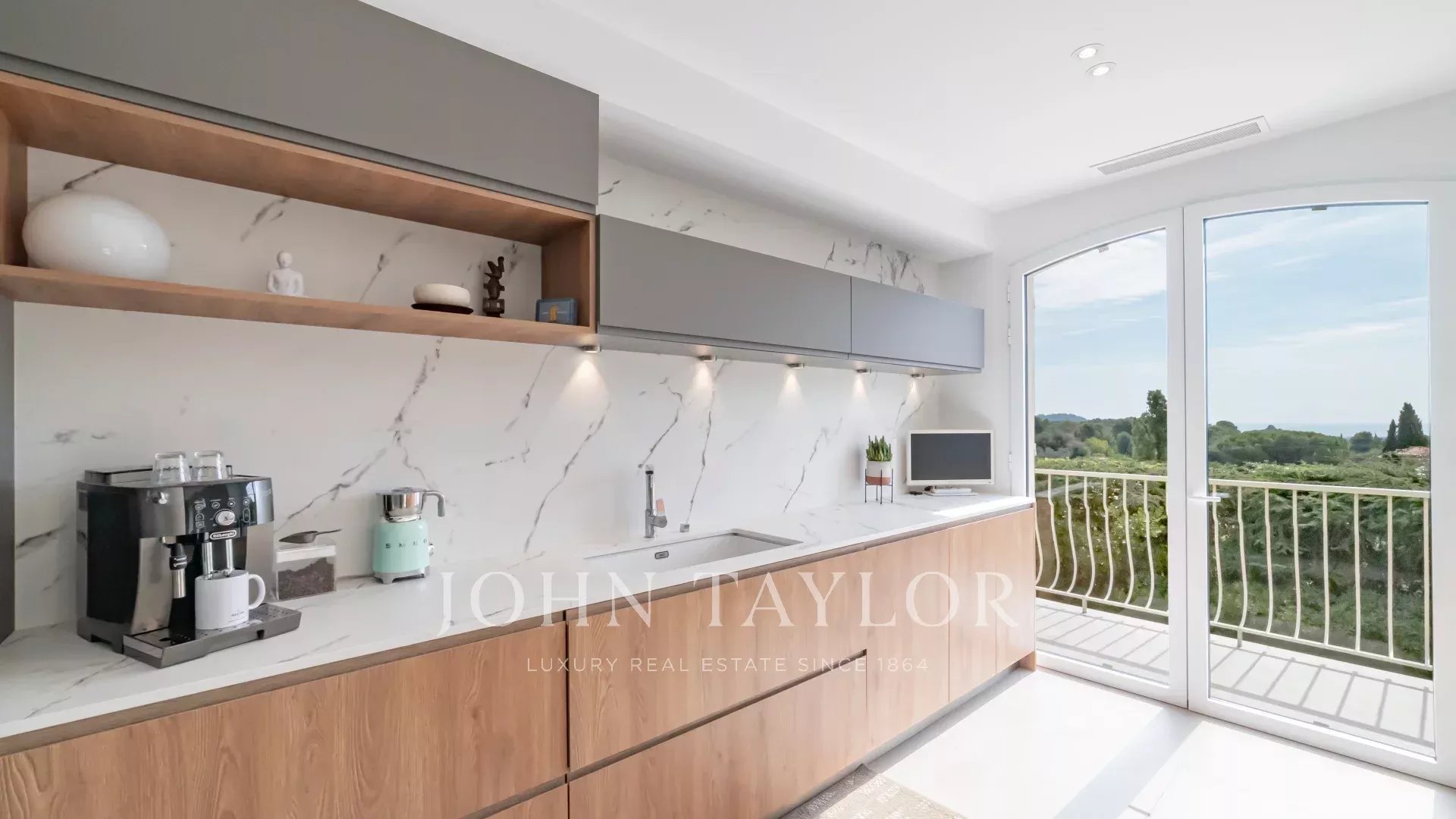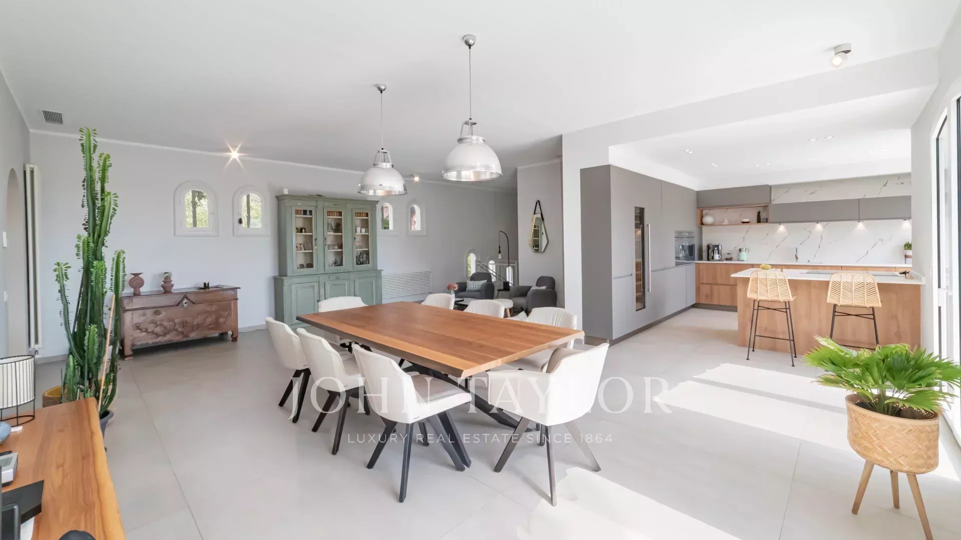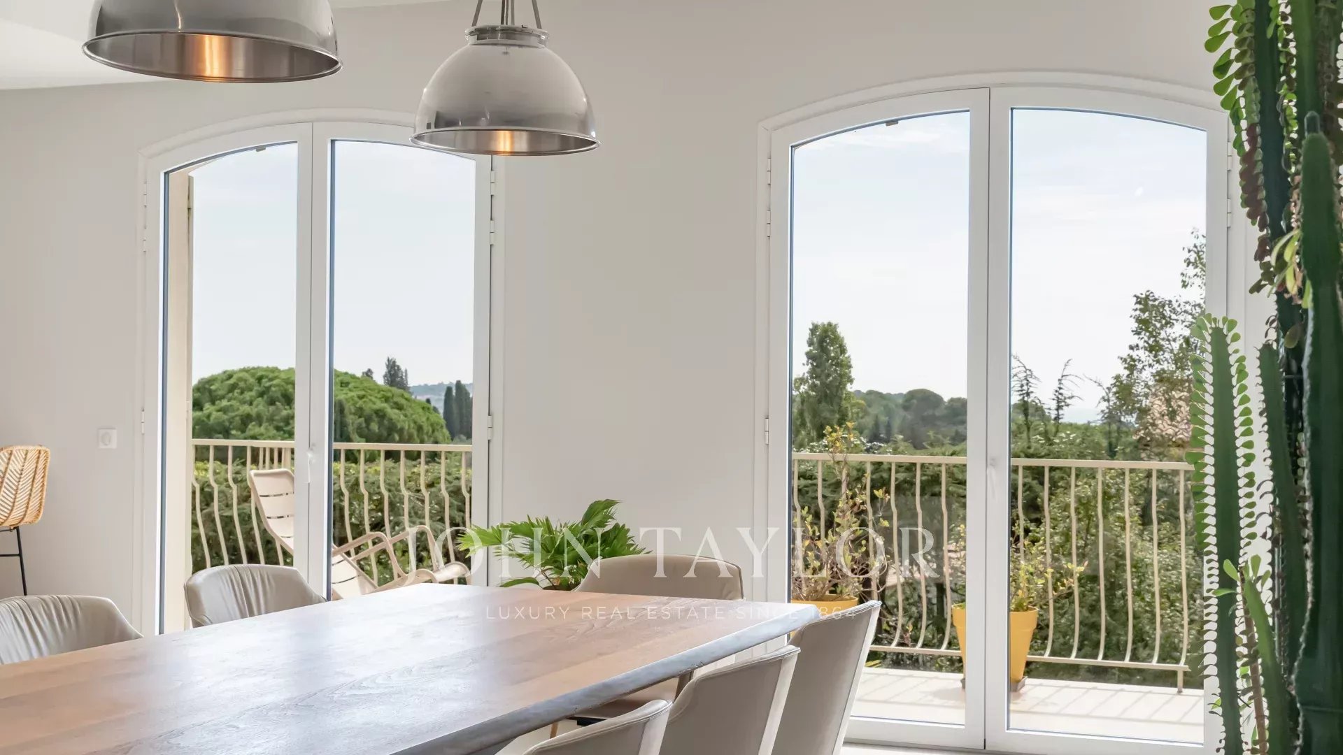 A sólo 5 minutos de Mougins, en una codiciada urbanización de La Roquette-sur-Siagne, esta encantadora villa de 258 m² goza de vistas ininterrumpidas al mar. Completamente renovado a un alto nivel, que ofrece un ambiente de vida tranquilo y refinado. La villa cuenta con cinco amplios dormitorios y cuatro cuartos de baño modernos. El luminoso salón se abre a una amplia terraza que ofrece unas vistas impresionantes. En el exterior, una magnífica piscina acompañada de una casita de piscina de 35 m², una auténtica segunda habitación con cocina de verano, invita a aprovechar al máximo el buen tiempo. Una gran cochera y un amplio espacio que podría utilizarse como gimnasio o despacho independiente completan esta propiedad.