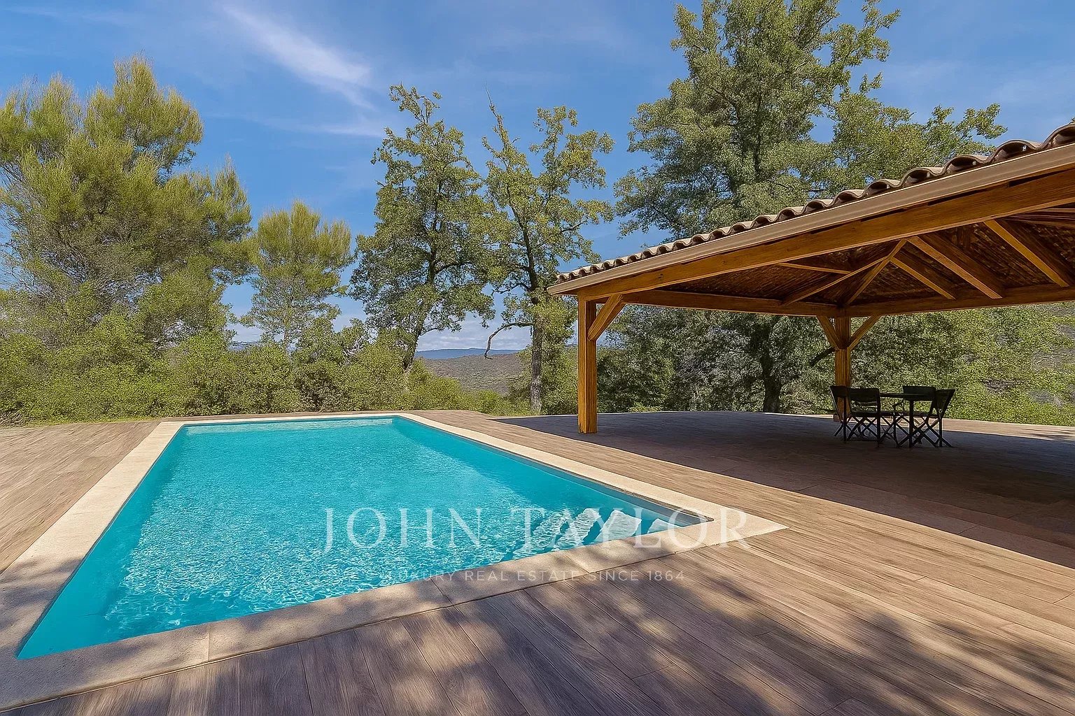 Con alrededor de 200 m² de espacio habitable, se encuentra en 7.500 m² de jardines con una piscina y amplias terrazas.
