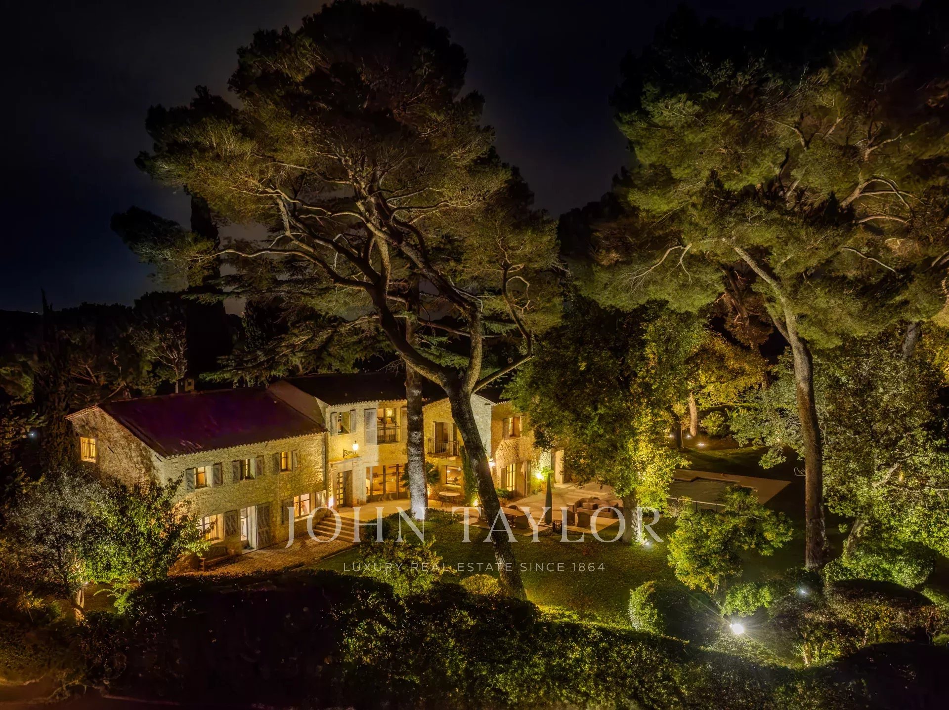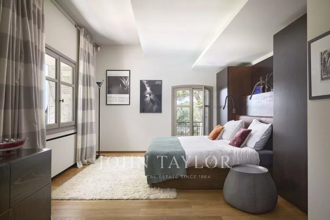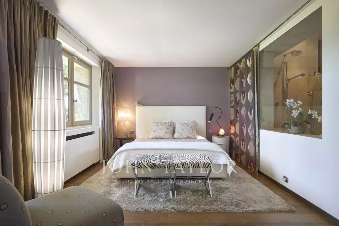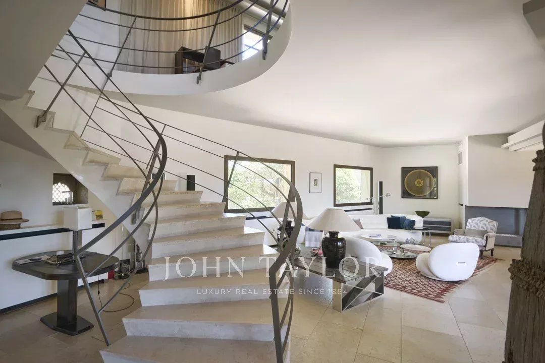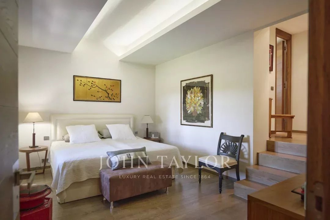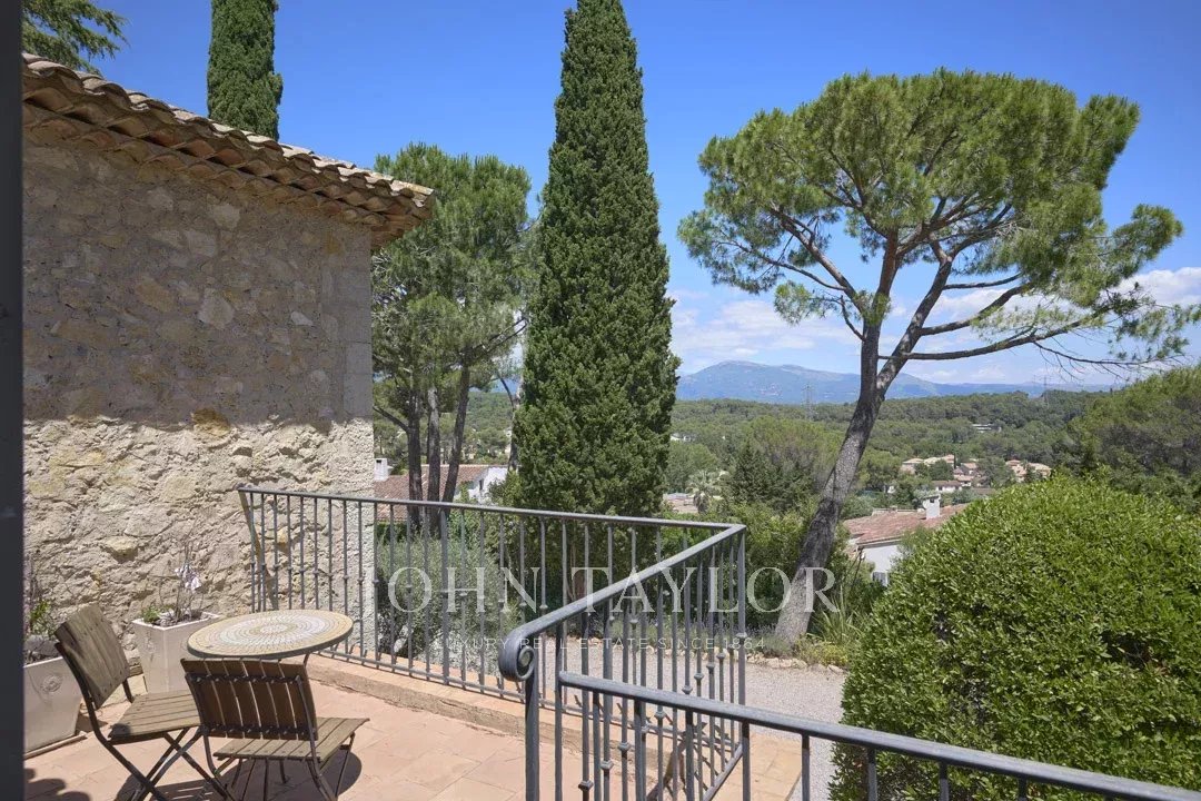 Idealmente situada en el punto más alto de la finca, la propiedad disfruta de vistas ininterrumpidas hasta el antiguo pueblo de Mougins.