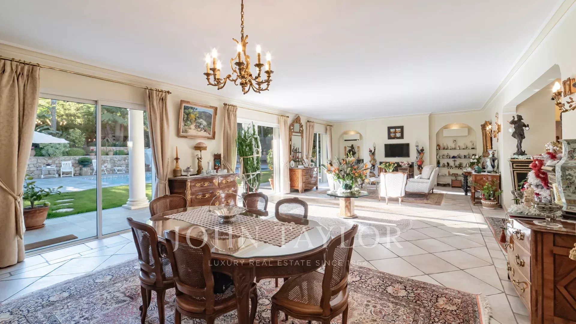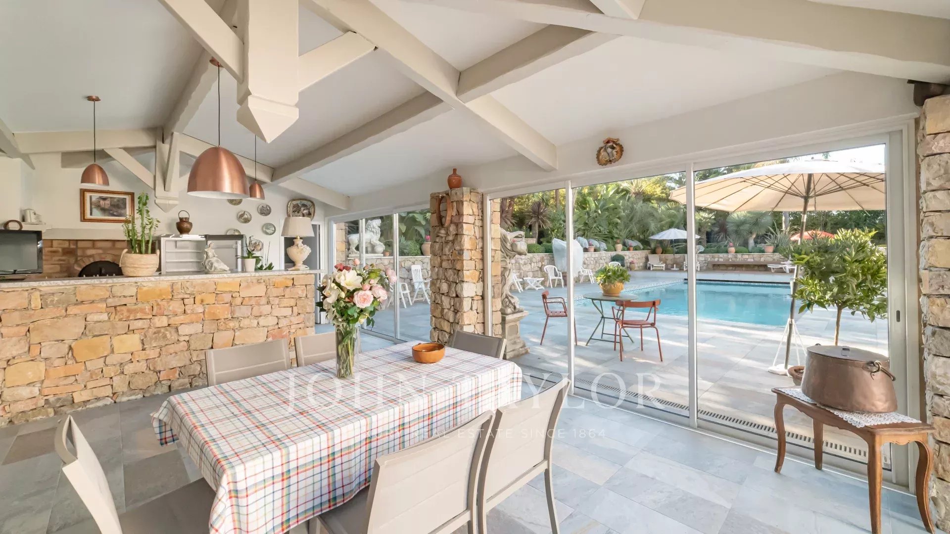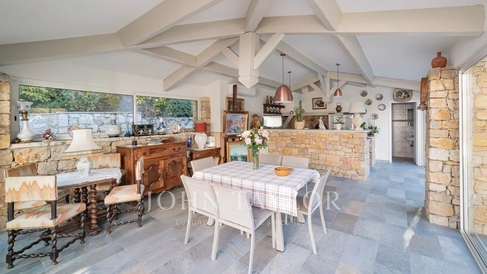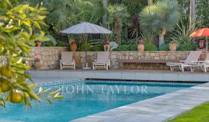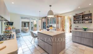 El salón y el comedor, con su acogedora chimenea, se abren a una cocina moderna y totalmente equipada con un lavadero funcional. Todos estos espacios se abren a hermosas terrazas, a un sublime jardín con piscina y a una casita de piscina de 45 m², que puede cerrarse y calentarse en invierno.