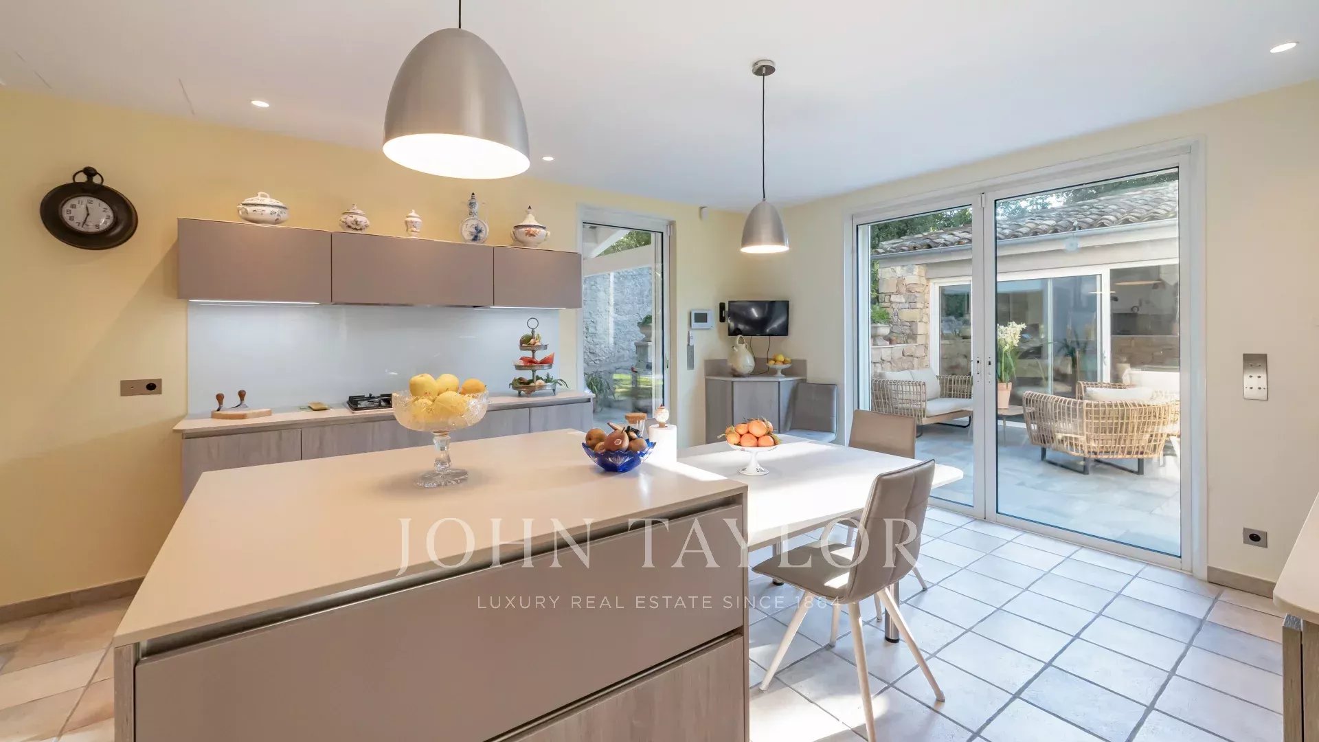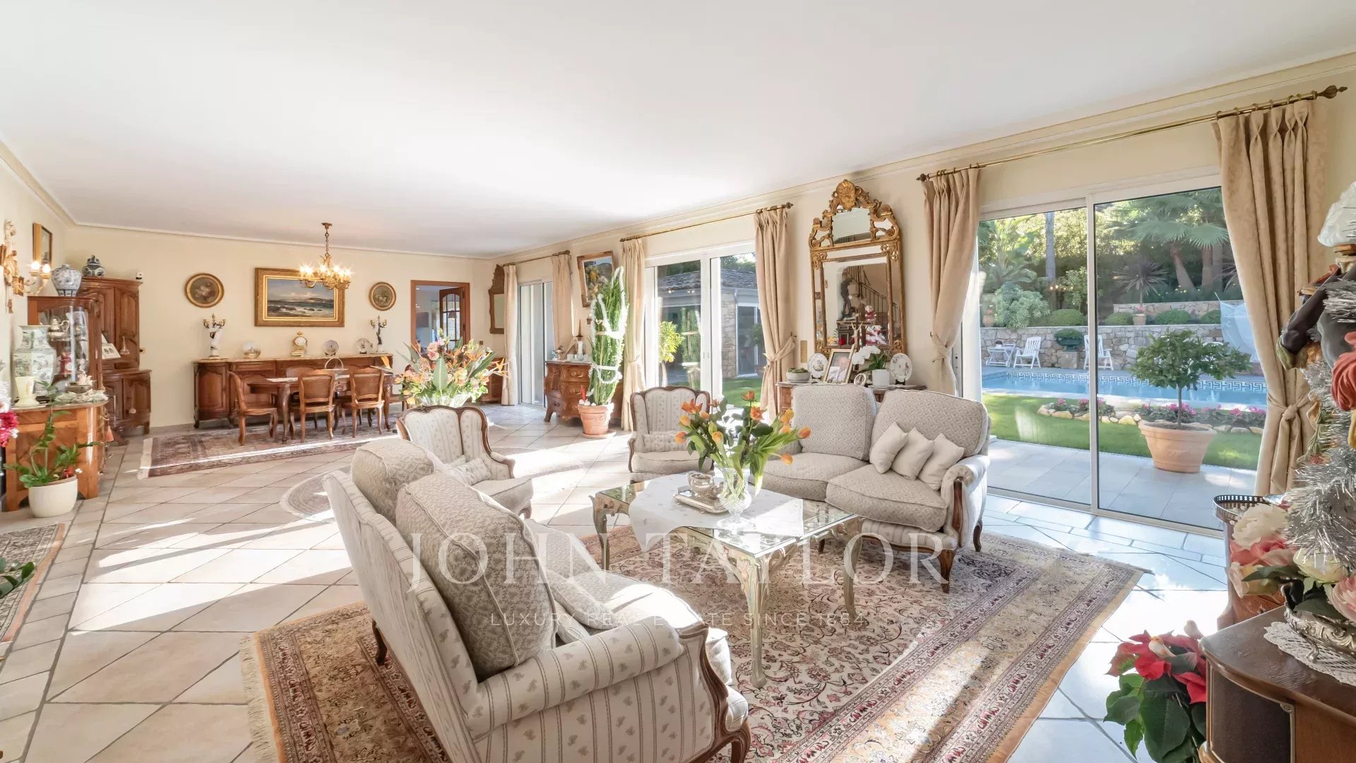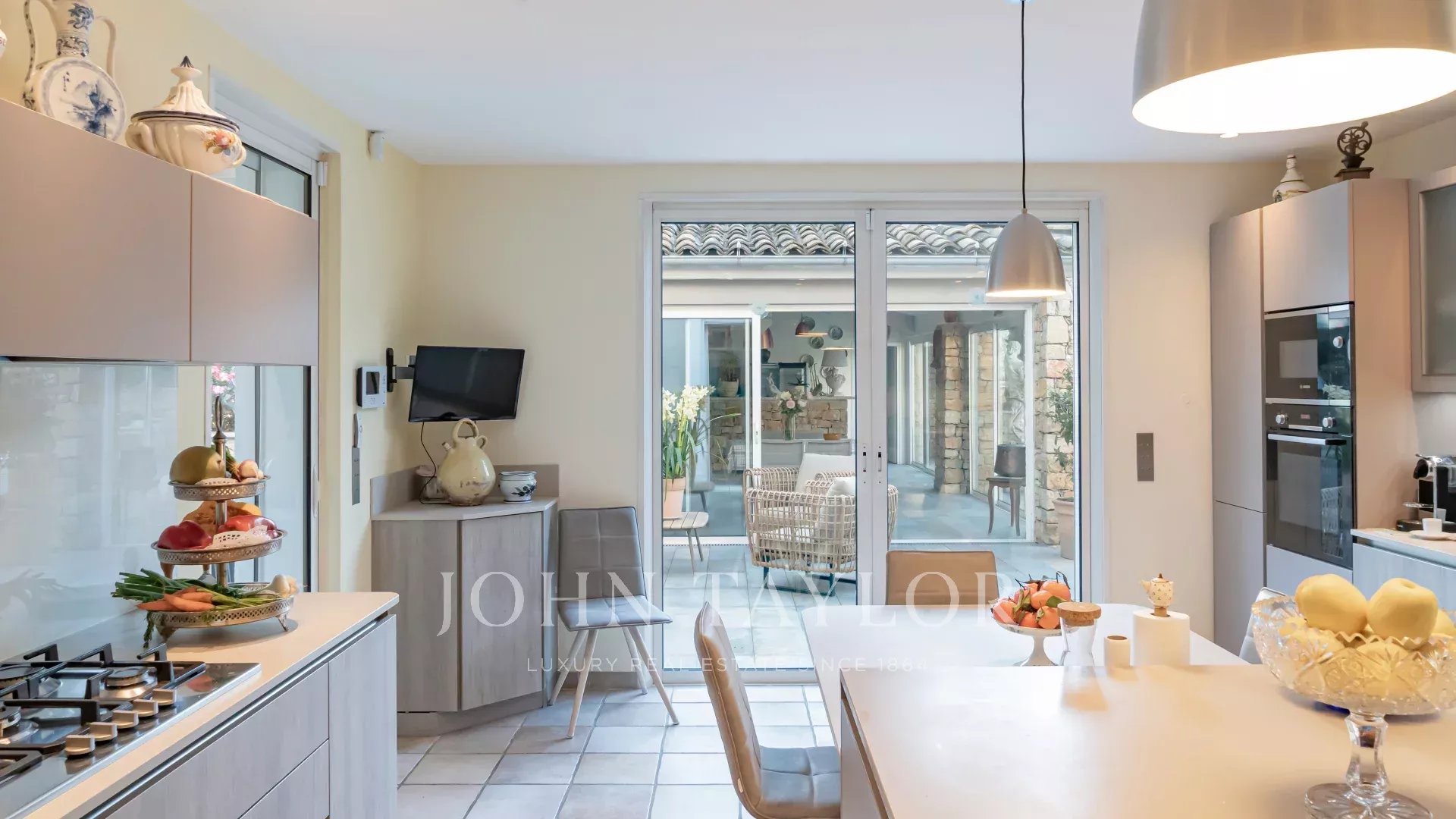 El salón y el comedor, con su acogedora chimenea, se abren a una cocina moderna y totalmente equipada con un lavadero funcional. Todos estos espacios se abren a hermosas terrazas, a un sublime jardín con piscina y a una casita de piscina de 45 m², que puede cerrarse y calentarse en invierno.