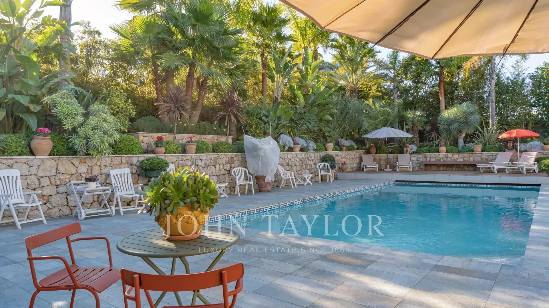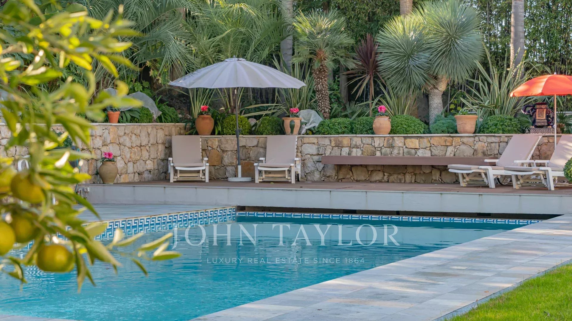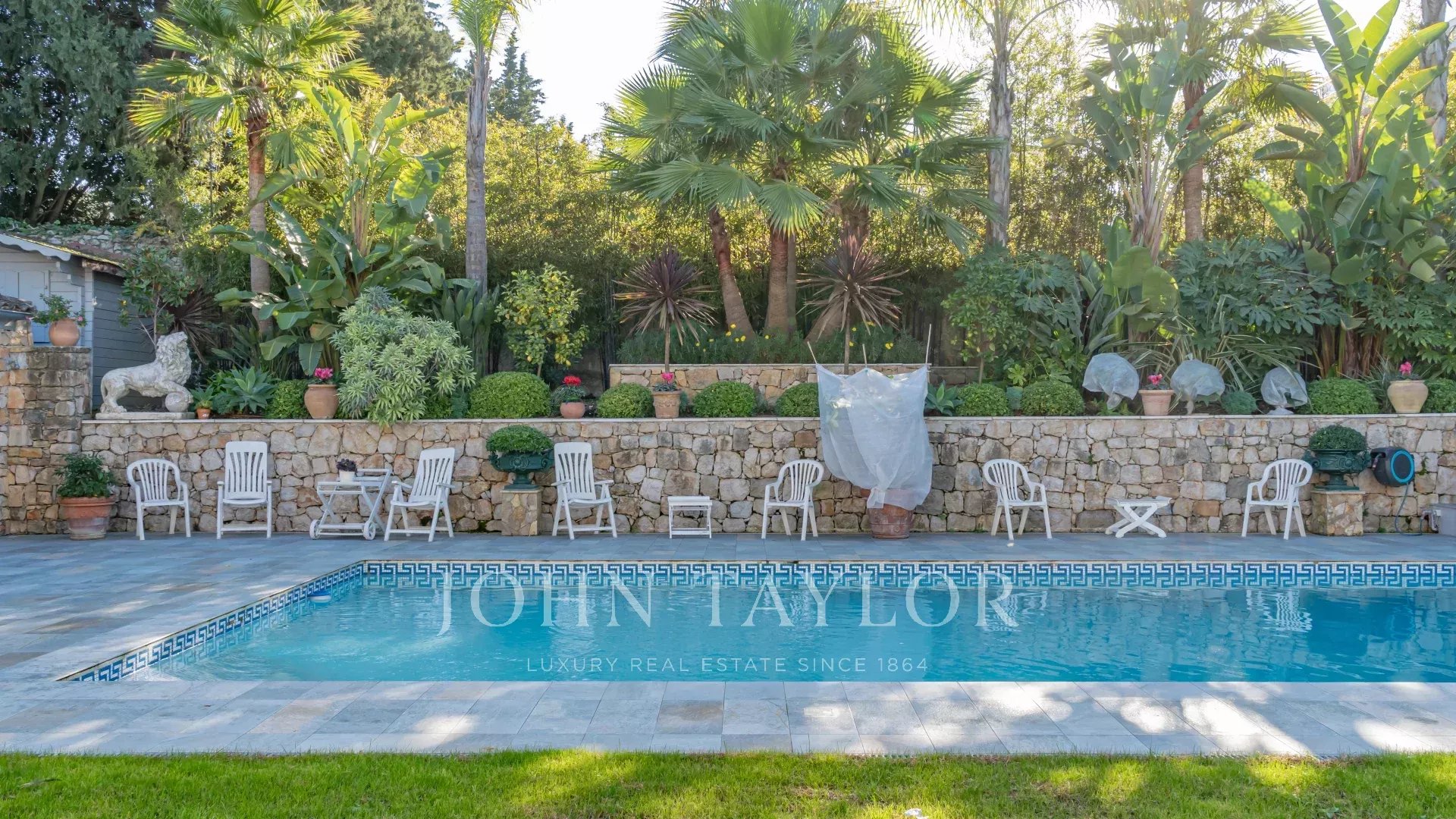 El parque mediterráneo de 1.650 m² cuenta con una espléndida piscina climatizada de 11,5 x 5,5 m, con cubierta eléctrica para una máxima seguridad, y dos cobertizos de jardín.