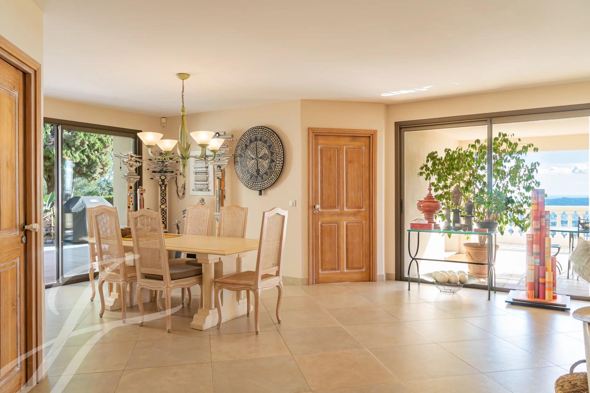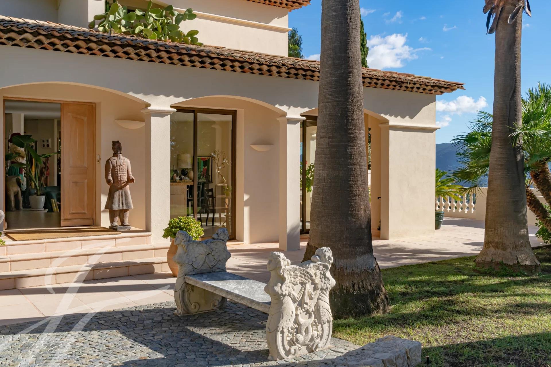 Situada en una finca discreta y privilegiada, en una posición dominante orientada al sureste, esta propiedad de estilo moderno y perfectamente mantenida ofrece unas impresionantes vistas panorámicas sobre el Mediterráneo hasta Cap d'Antibes, así como sobre las colinas de Niza, Mont Vinaigrier - Mont Boron y más allá.