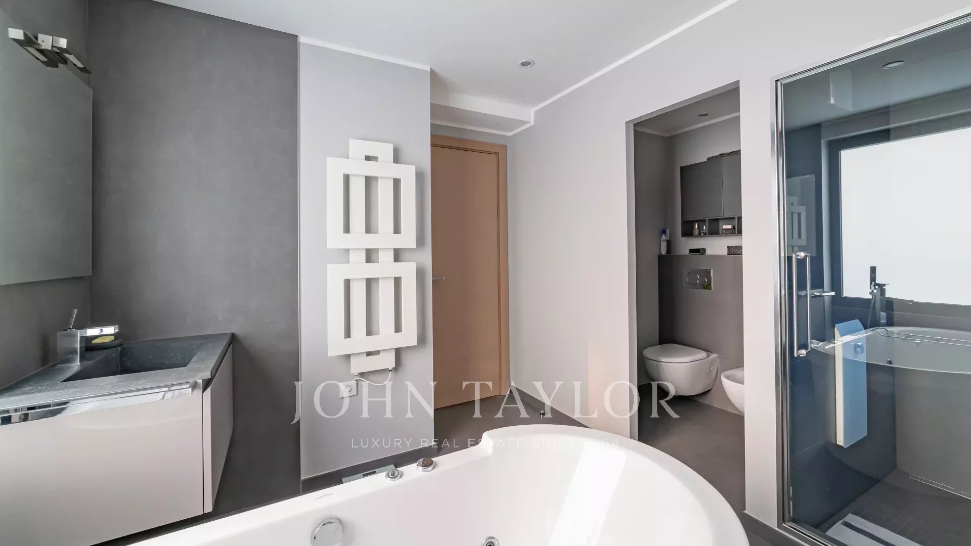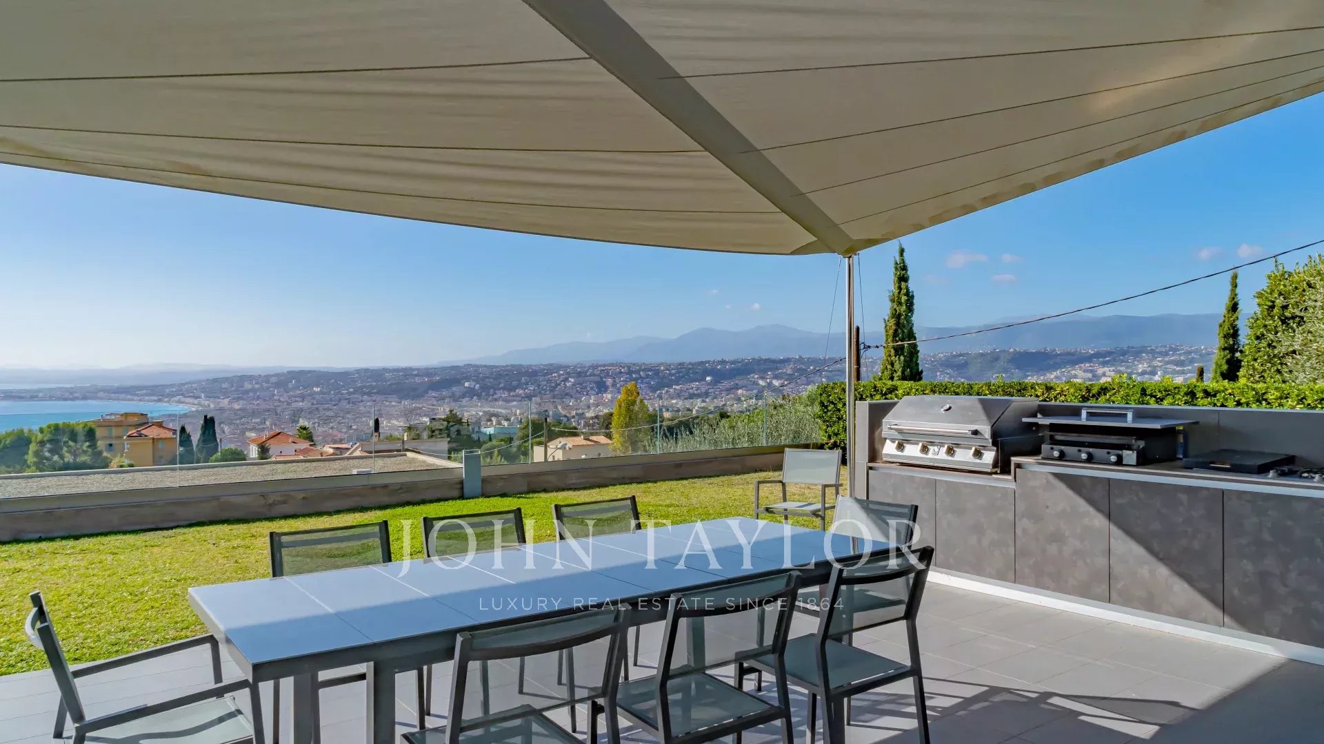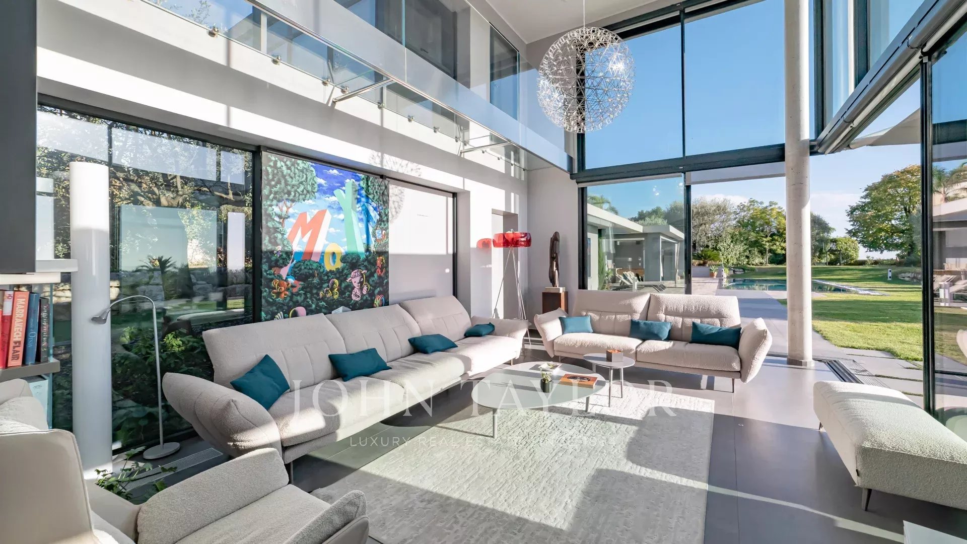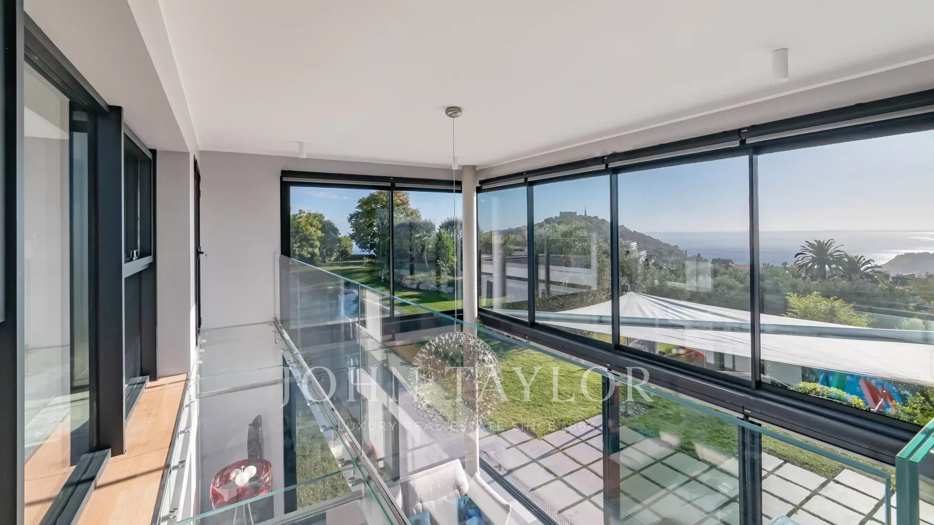 Todos los salones tienen vistas al mar y a la montaña, y se abren a amplias terrazas y al jardín. Una escalera de cristal conduce a todas las plantas.