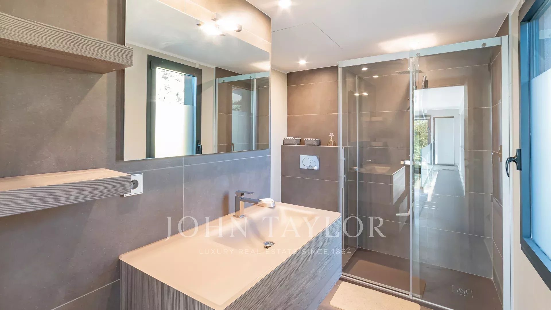 La villa contemporánea tiene una superficie total de 490 m2 (incluidos 278 m2 de espacio habitable) y está armoniosamente situada en 2560 m2 de terreno llano, totalmente ajardinado y plantado con especies mediterráneas raras. La gran piscina, muy atractiva y con acabado de espejo, está rodeada de playas y cuenta con una casita de piscina.
