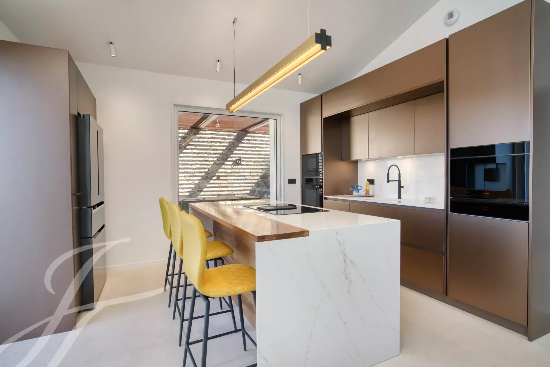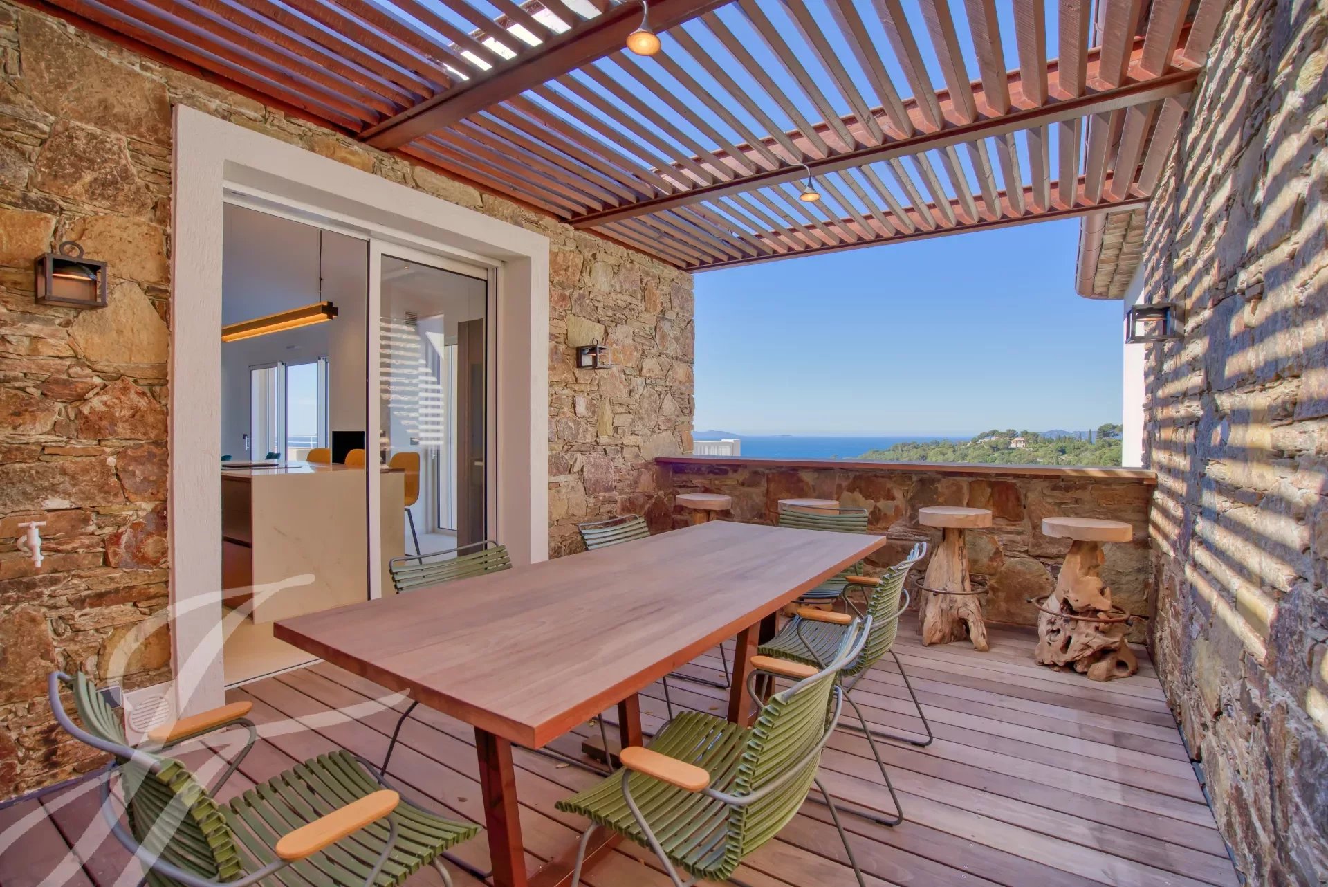 Consta de un espectacular salón con techo de catedral y cocina orientada al sur, una suite principal con acceso a la terraza y 2 dormitorios con cuartos de baño. Una segunda terraza, accesible directamente desde la cocina, ofrece una encantadora zona de sombra en verano, con una pérgola de madera y paredes de piedra natural.