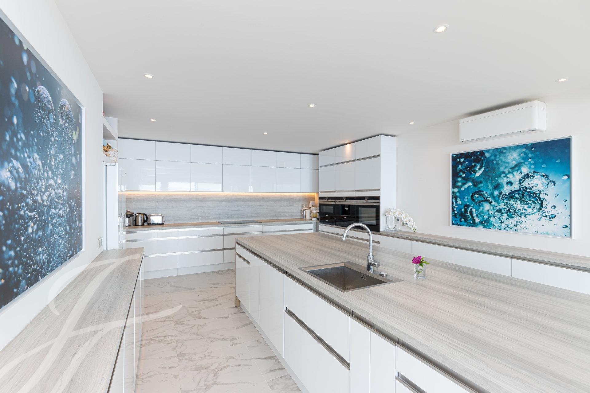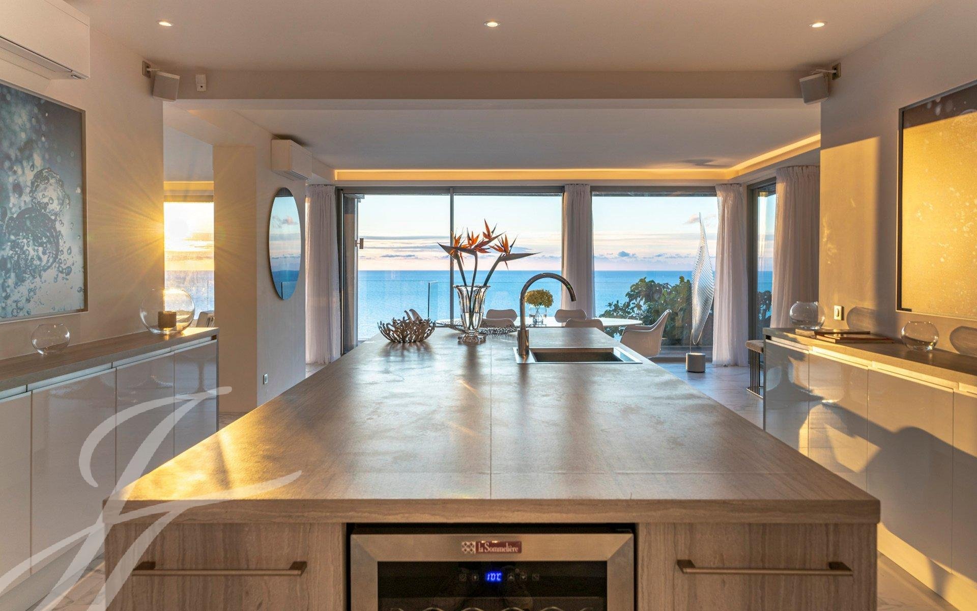 Entrada a una triple sala de estar, incluida una sala de televisión con chimenea (insertado de doble cara), otra sala, un comedor, una cocina americana de alta gama totalmente equipada, todo con acceso a una terraza con vista al mar.