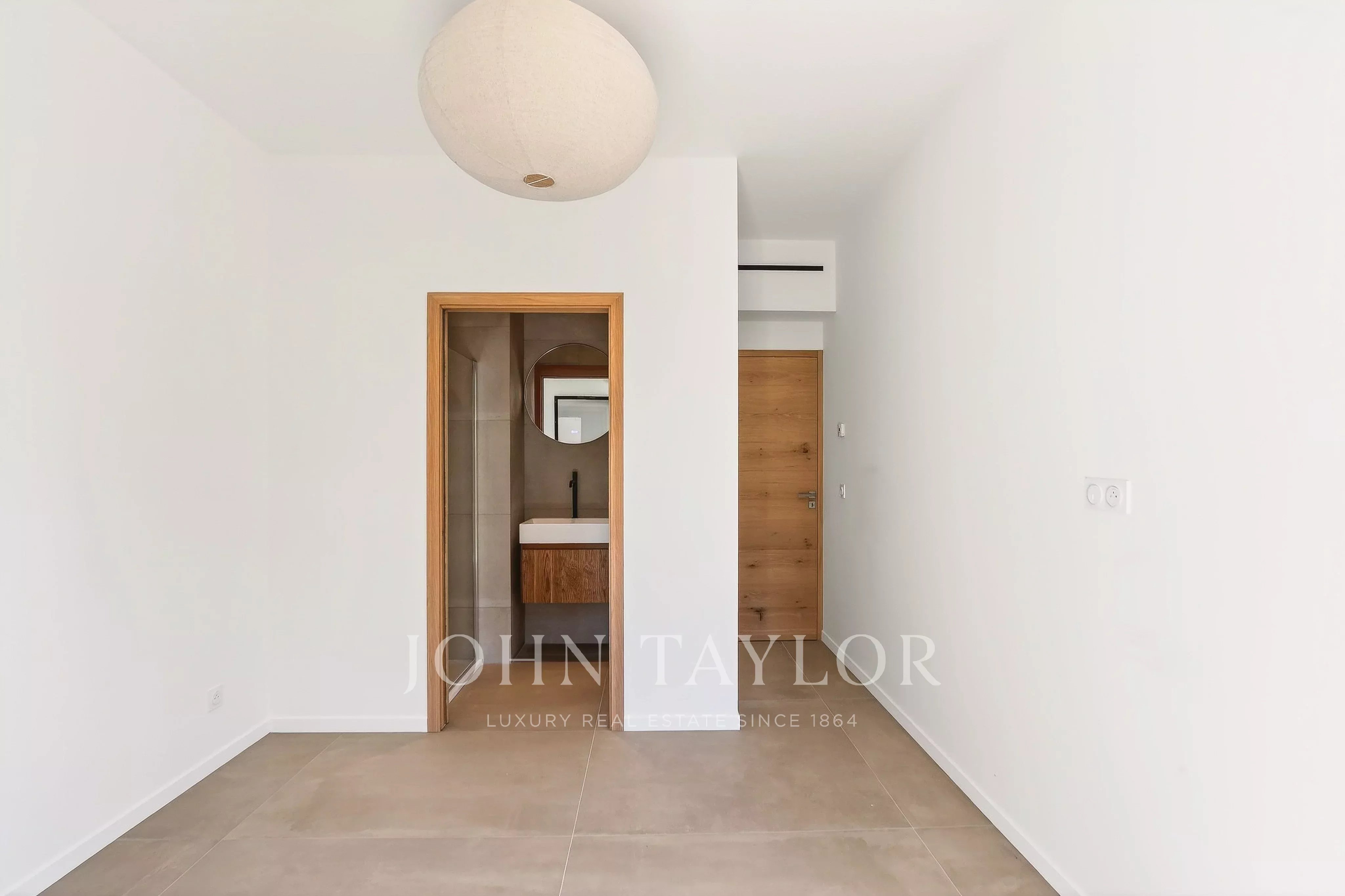 En el exterior, un agradable jardín íntimo permite disfrutar plenamente del clima azurino en un entorno tranquilo.