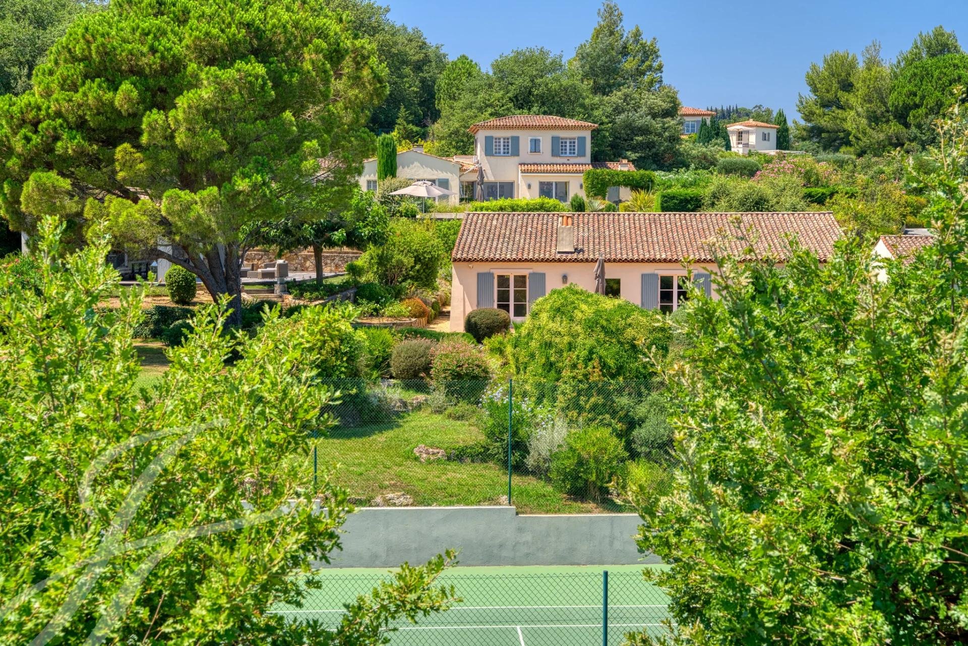 Idealmente situado en una pequeña urbanización segura a poca distancia del pueblo de Grimaud, cuenta con una pista de tenis, zona de petanca, piscina climatizada, garaje y un amplio espacio al aire libre con cocina de verano y salón.