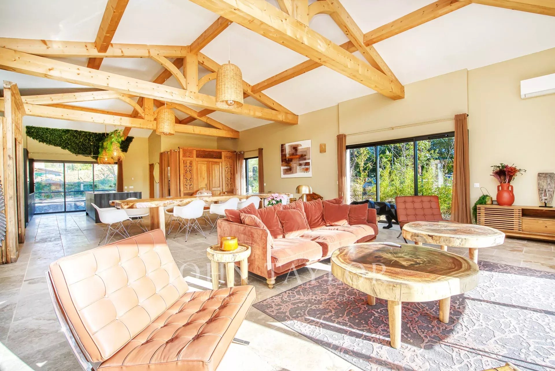 El salón, bañado de luz natural, se extiende sobre una generosa superficie de 120 m², ofreciendo un espacio de vida convivial y elegante. Se beneficia de las 4 exposiciones, con grandes ventanales que dan al magnífico campo de los alrededores y al castillo de Grimaud. La cocina, totalmente equipada, es una auténtica joya de la casa y ofrece un espacio funcional y atractivo.