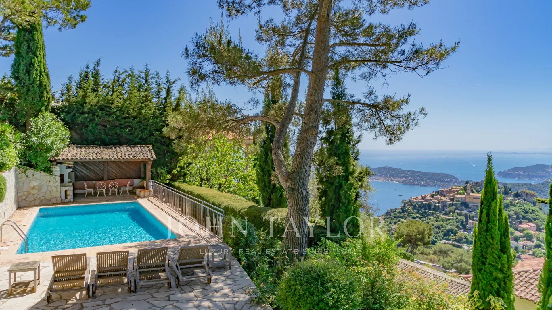 Situado en las alturas de Eze, en un lugar tranquilo con preciosas vistas al mar y Eze-Village, esta villa de 240 m² se encuentra en 1400 m² de terreno con piscina y cocina de verano.