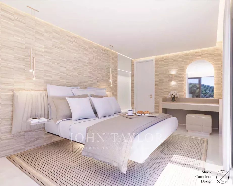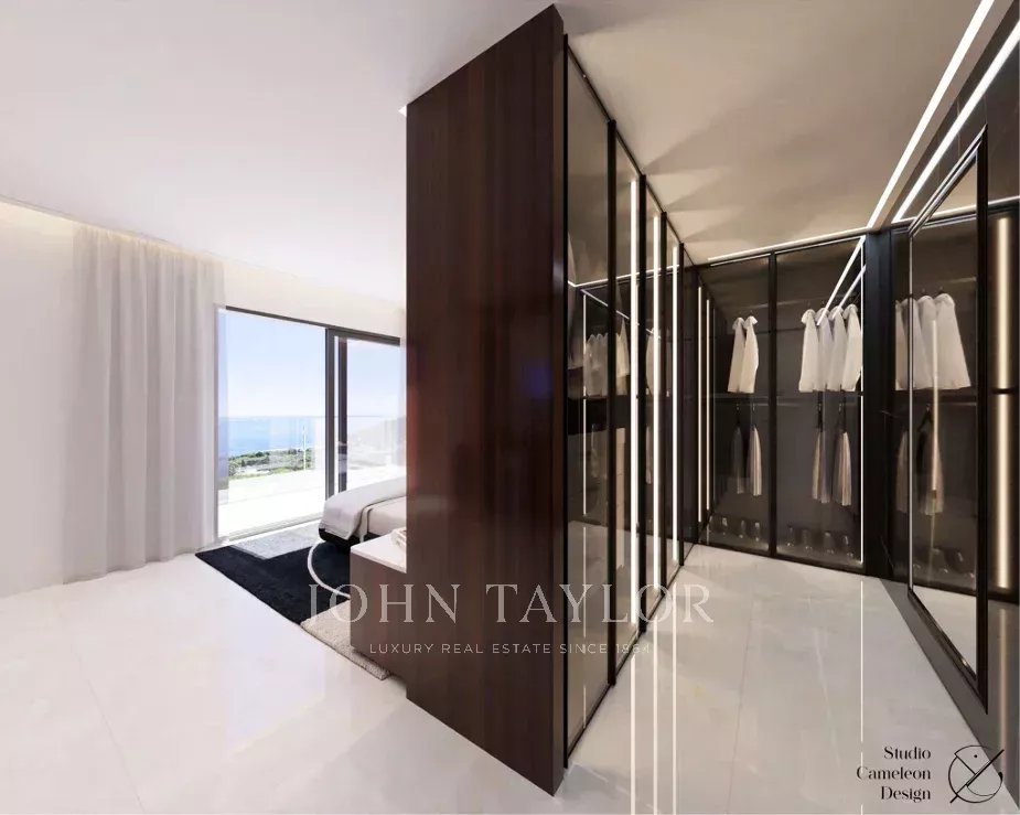 La villa, construida en cuatro niveles, ofrece amplios espacios de vida, cuatro dormitorios y prestaciones previstas como una piscina cubierta, una zona de bienestar con spa y una sala de cine.