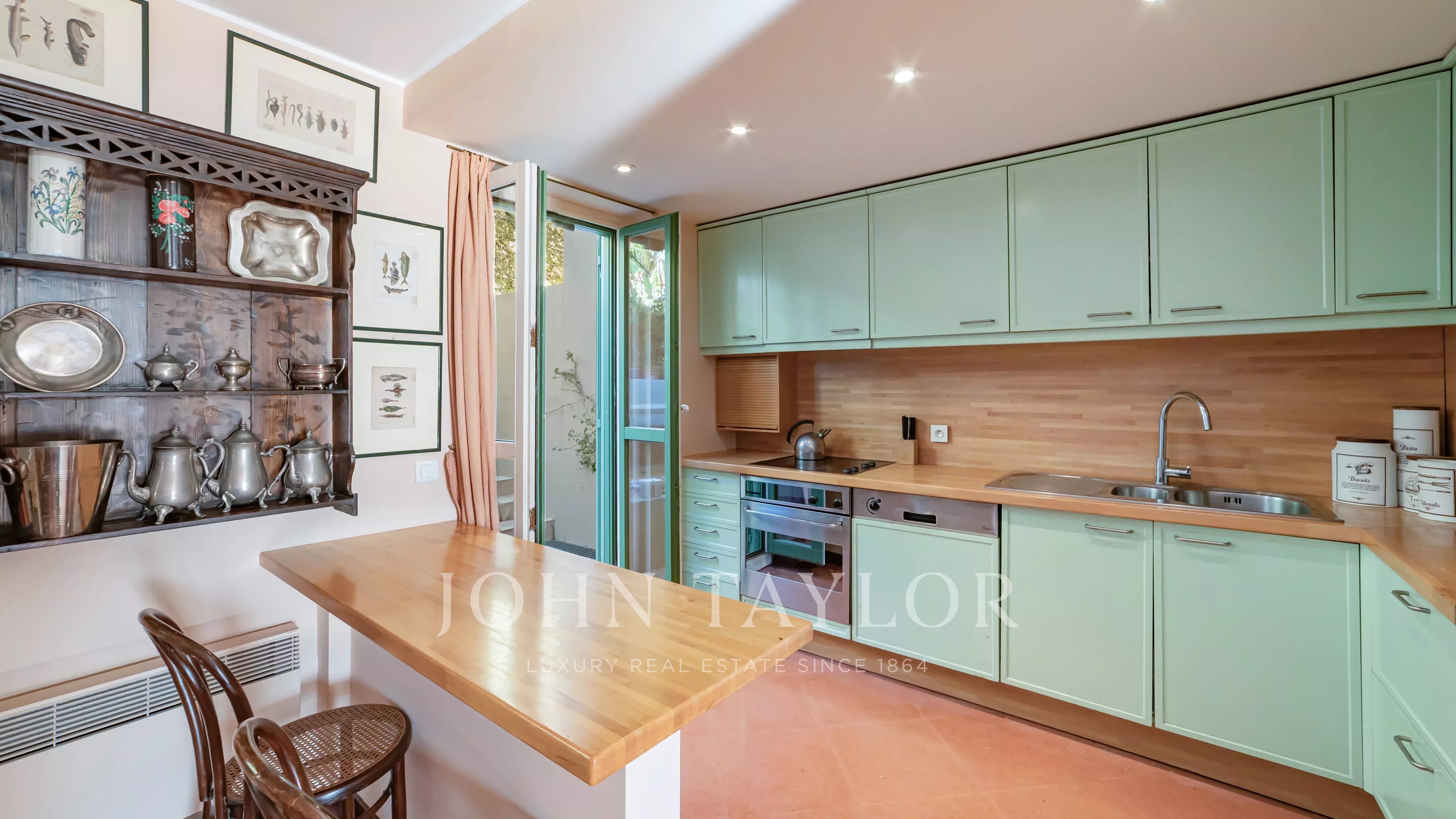 El comedor y la cocina, situados más atrás, dan acceso a una segunda terraza prolongada por un pequeño jardín, que ofrece un espacio exterior tranquilo e íntimo.