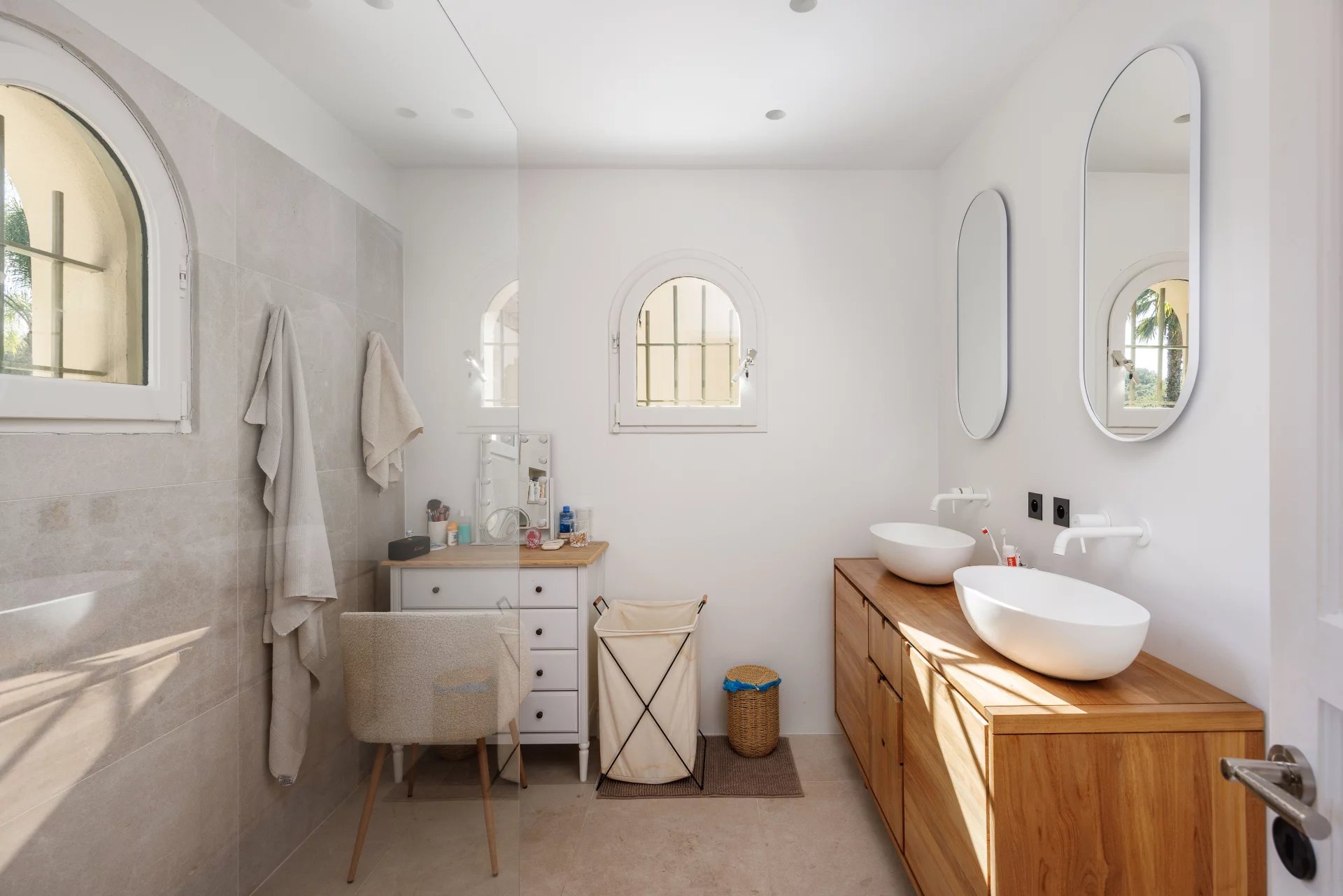 La villa principal ofrece amplias estancias bañadas de luz. En una sola planta, consta de un hall de entrada, una sala de estar muy amplia y acogedora con cocina y lavadero, una suntuosa suite principal con cuarto de ducha, vestidor y tocador con chimenea, así como dos dormitorios adicionales con dos cuartos de baño/ducha. En la planta superior, hay un cuarto dormitorio y un gran altillo, perfecto como despacho o zona de juegos.