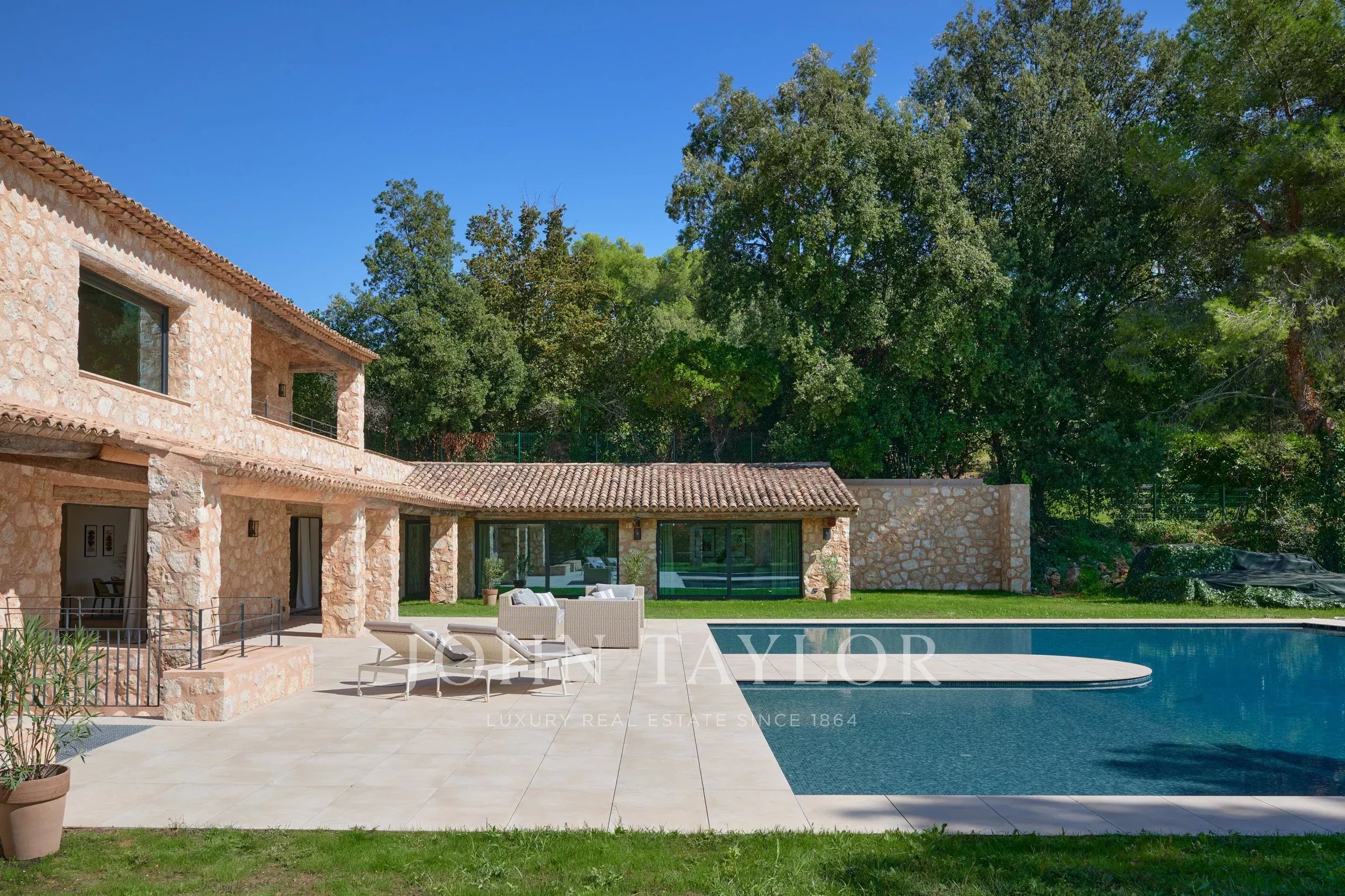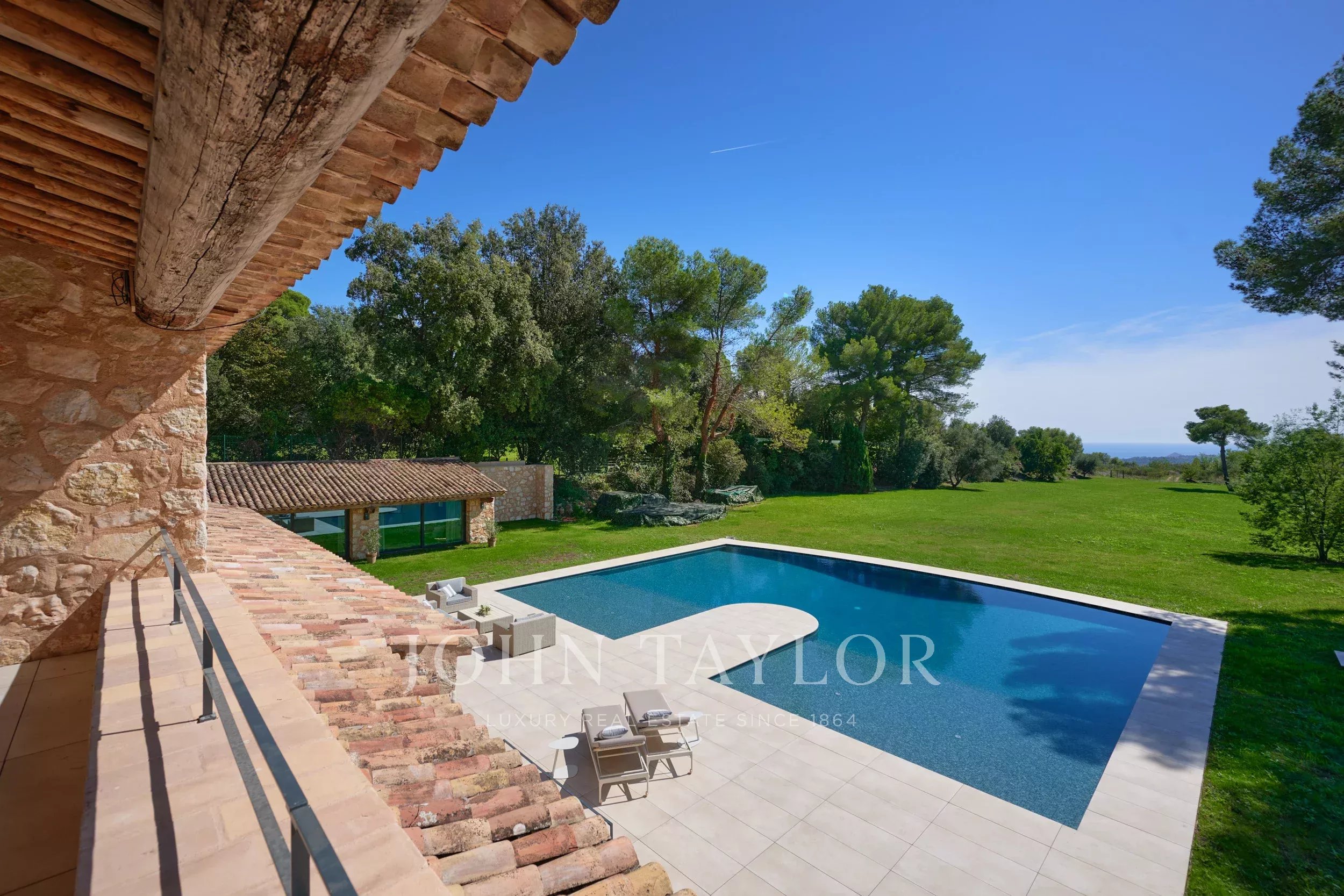 Esta lujosa residencia de piedra encarna la mezcla perfecta de elegancia y encanto. Enclavada cerca del pintoresco pueblo de Saint-Paul de Vence, en el corazón de una discreta finca privada, se encuentra en una posición dominante, ofreciendo majestuosas vistas hasta el mar.