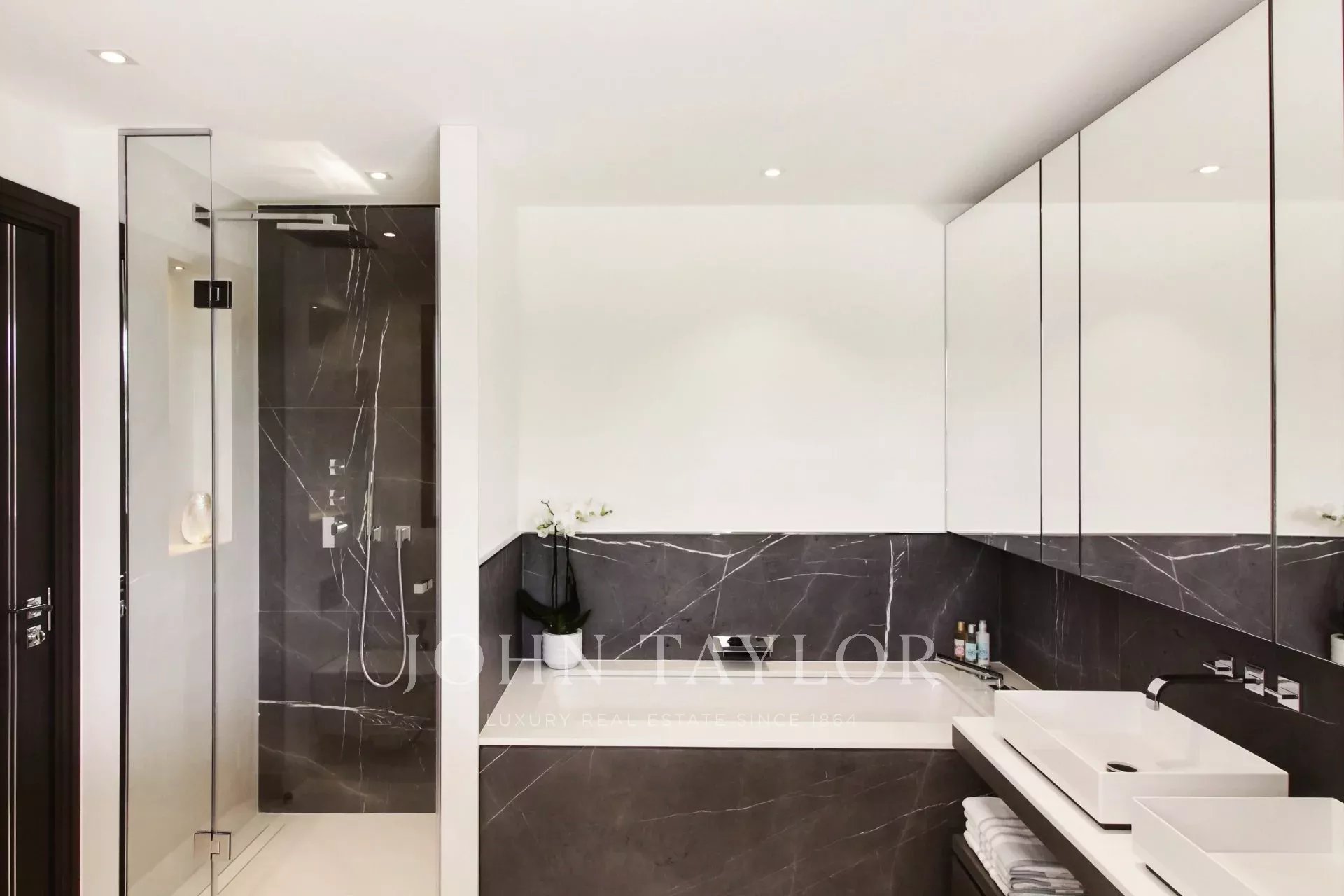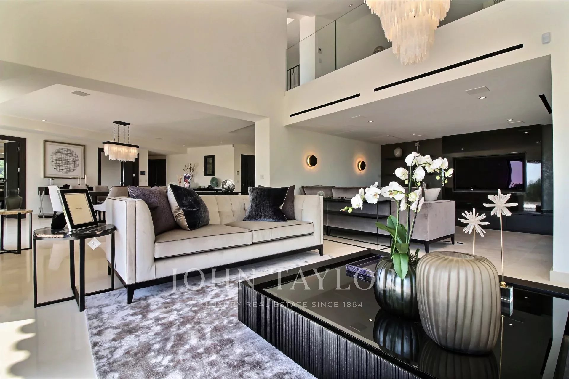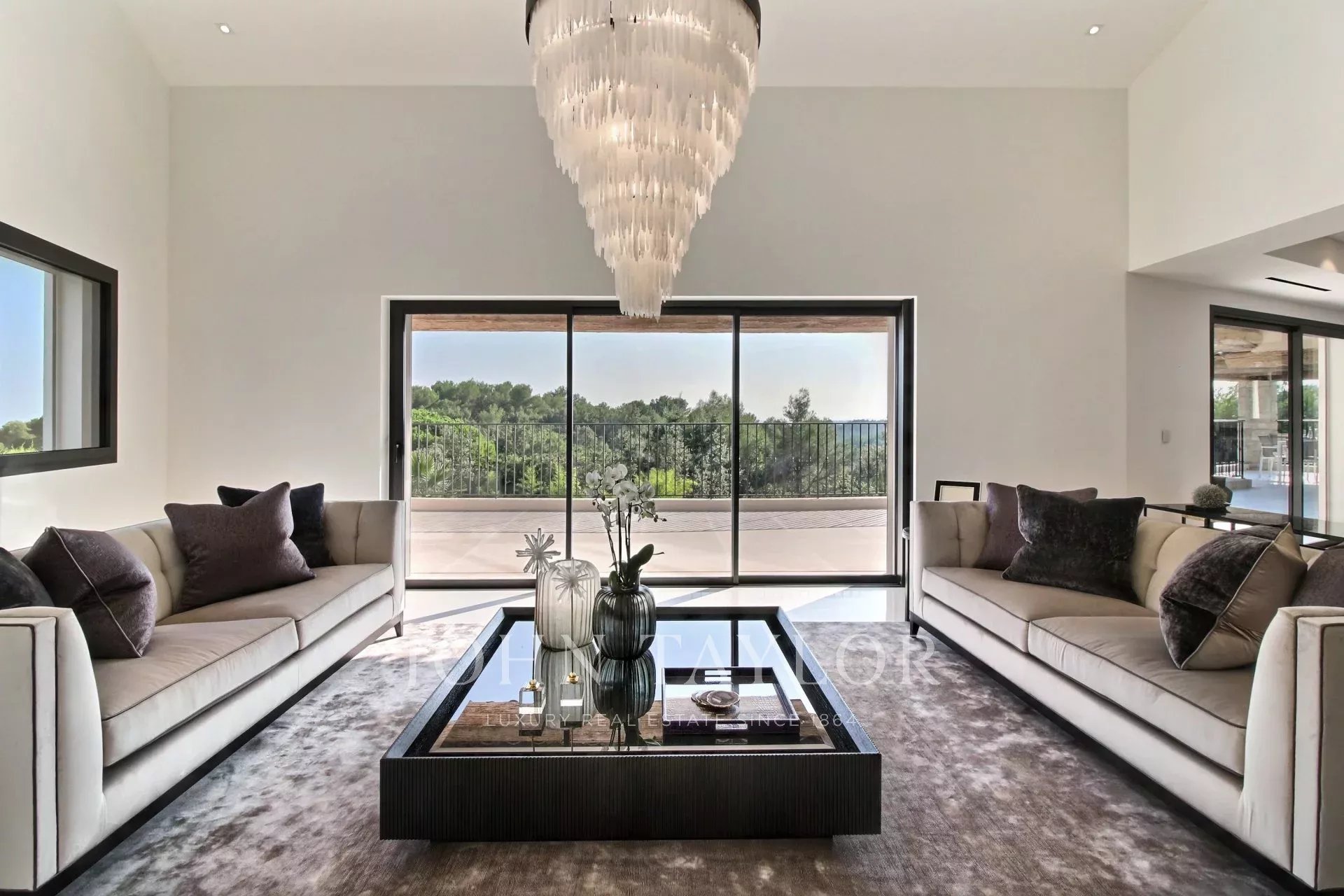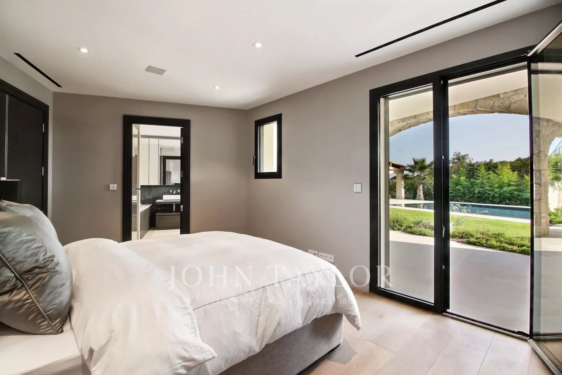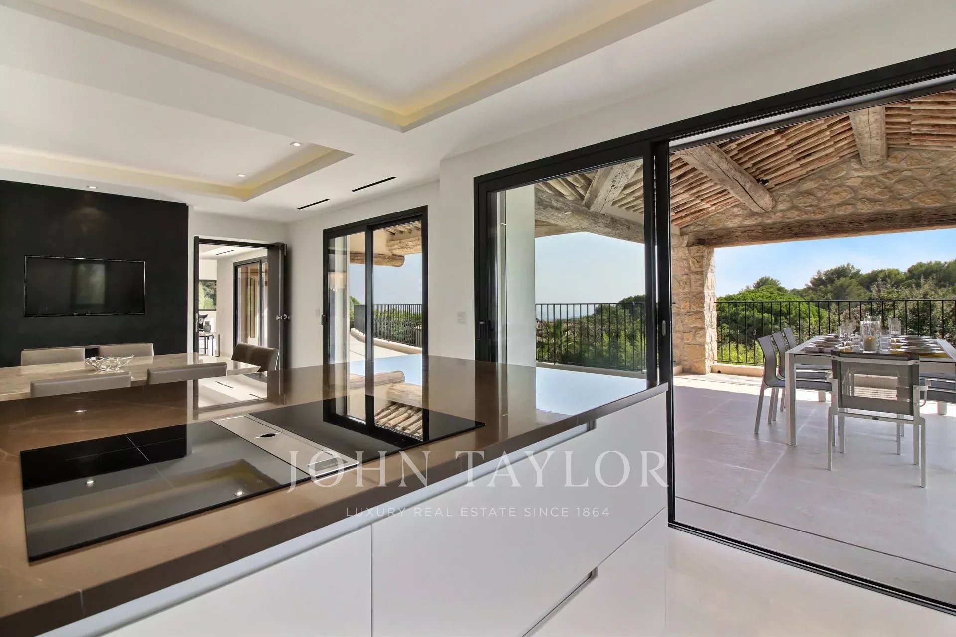 un vestíbulo de entrada, un doble salón-comedor con zona de TV, un comedor, una cocina de alta gama con una isla central y acceso a una terraza cubierta orientada al sur, una suite principal espaciosa con su gran vestidor y un despacho contiguo, 4 habitaciones en suite, un gimnasio, una bodega de vinos.