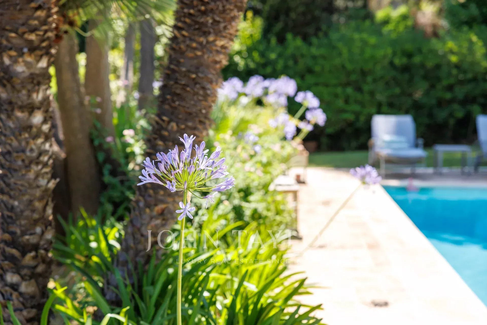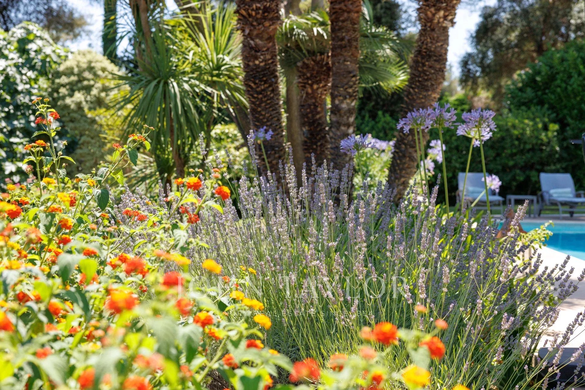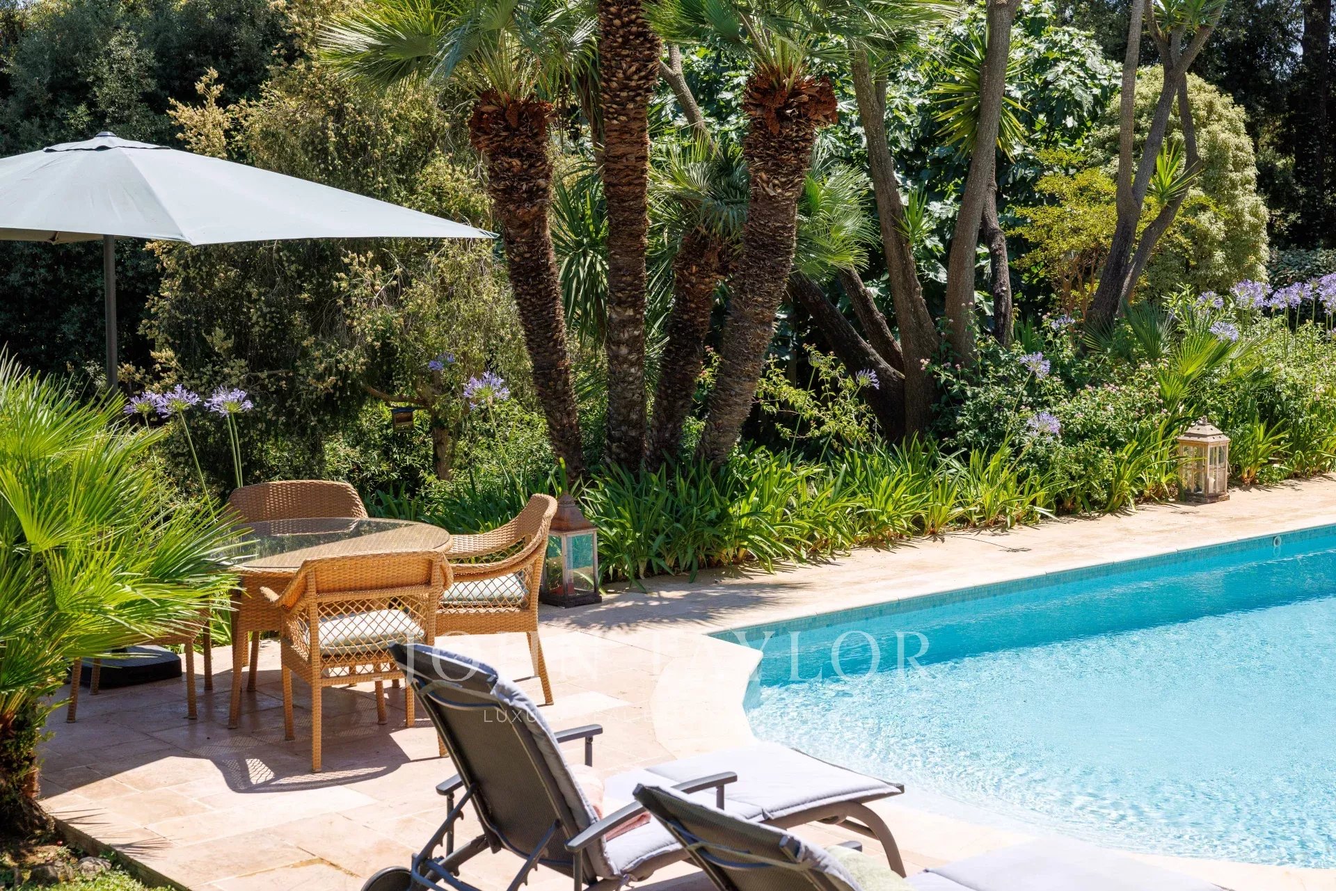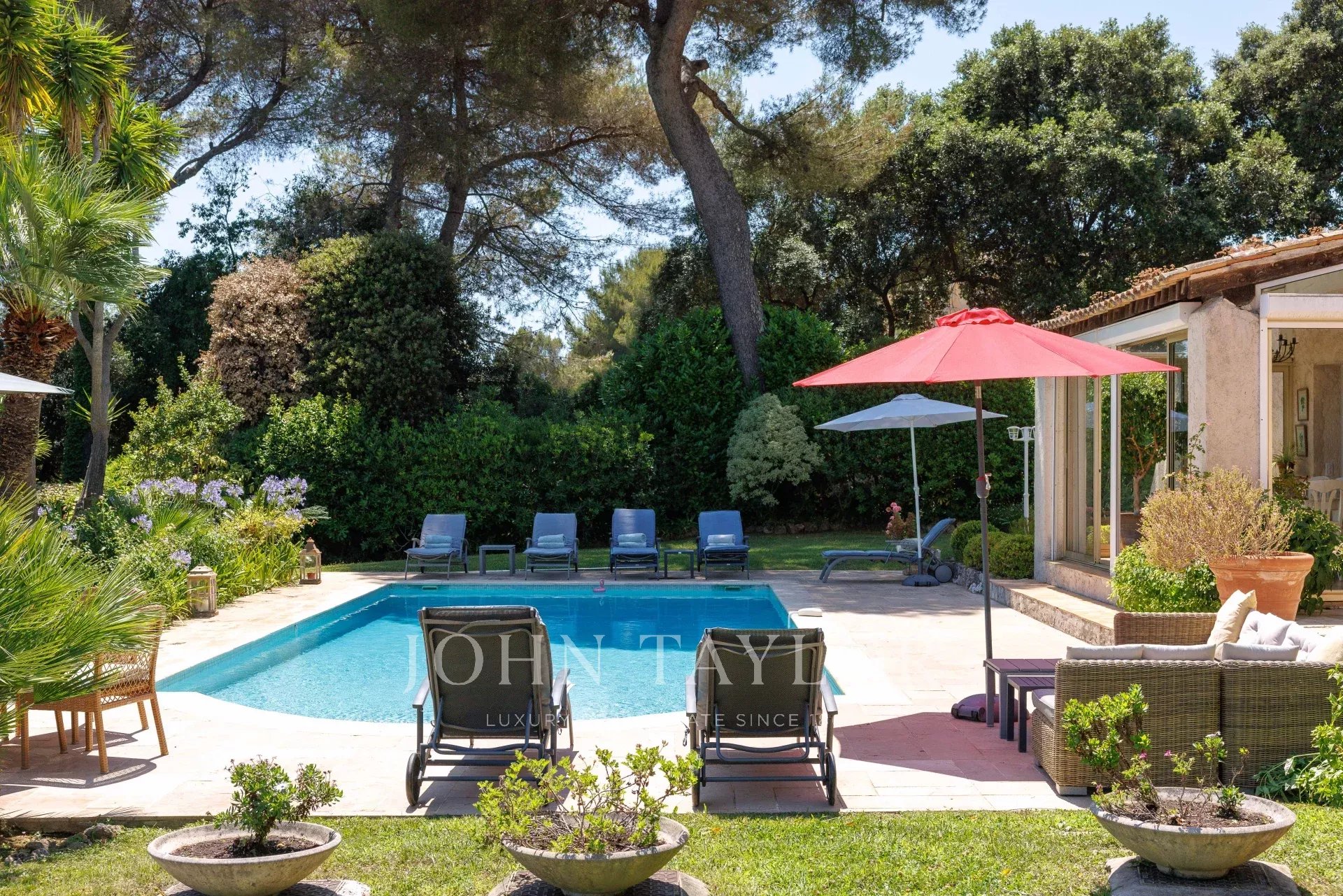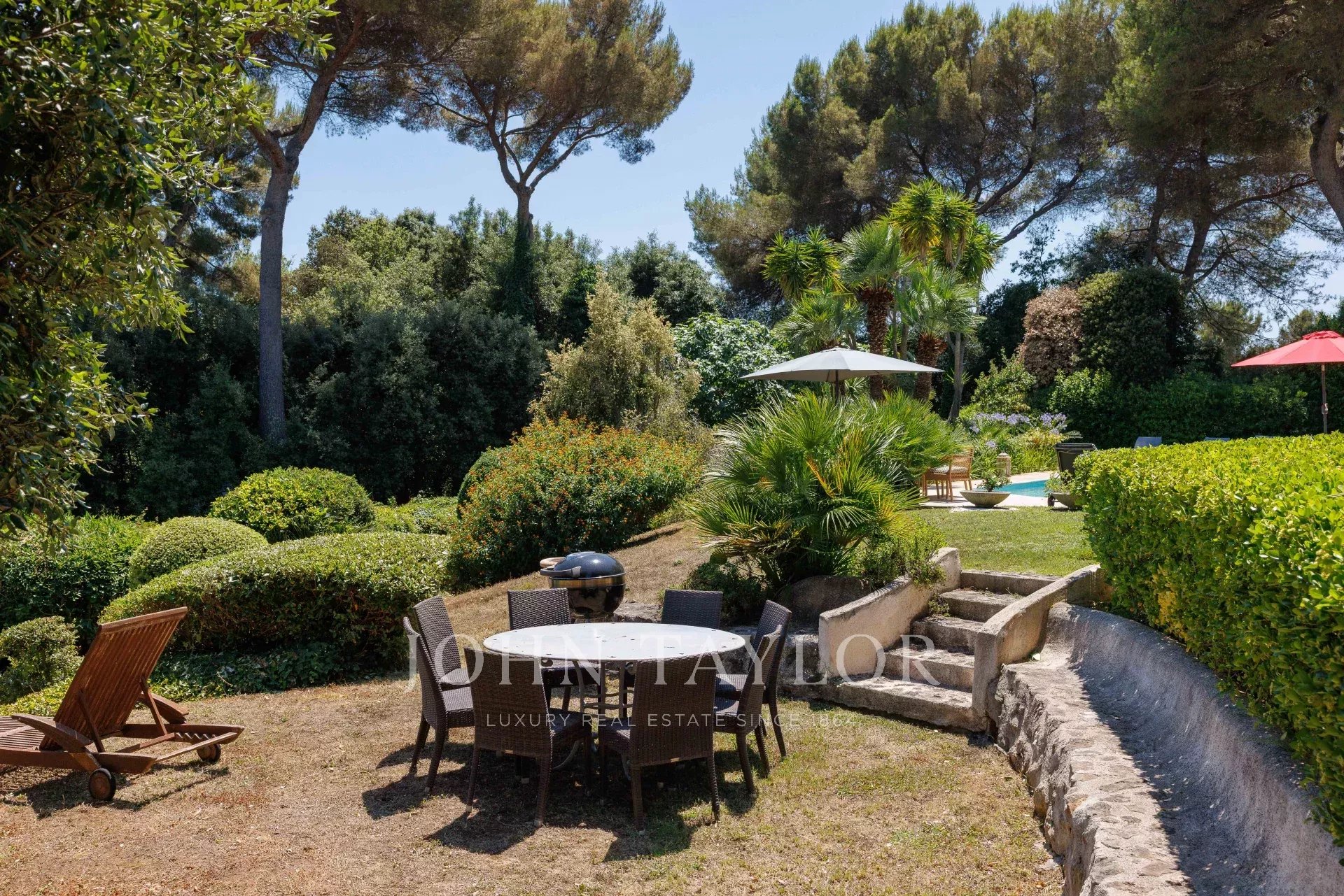 En el exterior, el jardín, perfectamente cuidado, ofrece distintos ambientes: una piscina bordeada de terrazas, un gran césped con una segunda zona de descanso y una zona de recepción en la parte trasera de la casa.