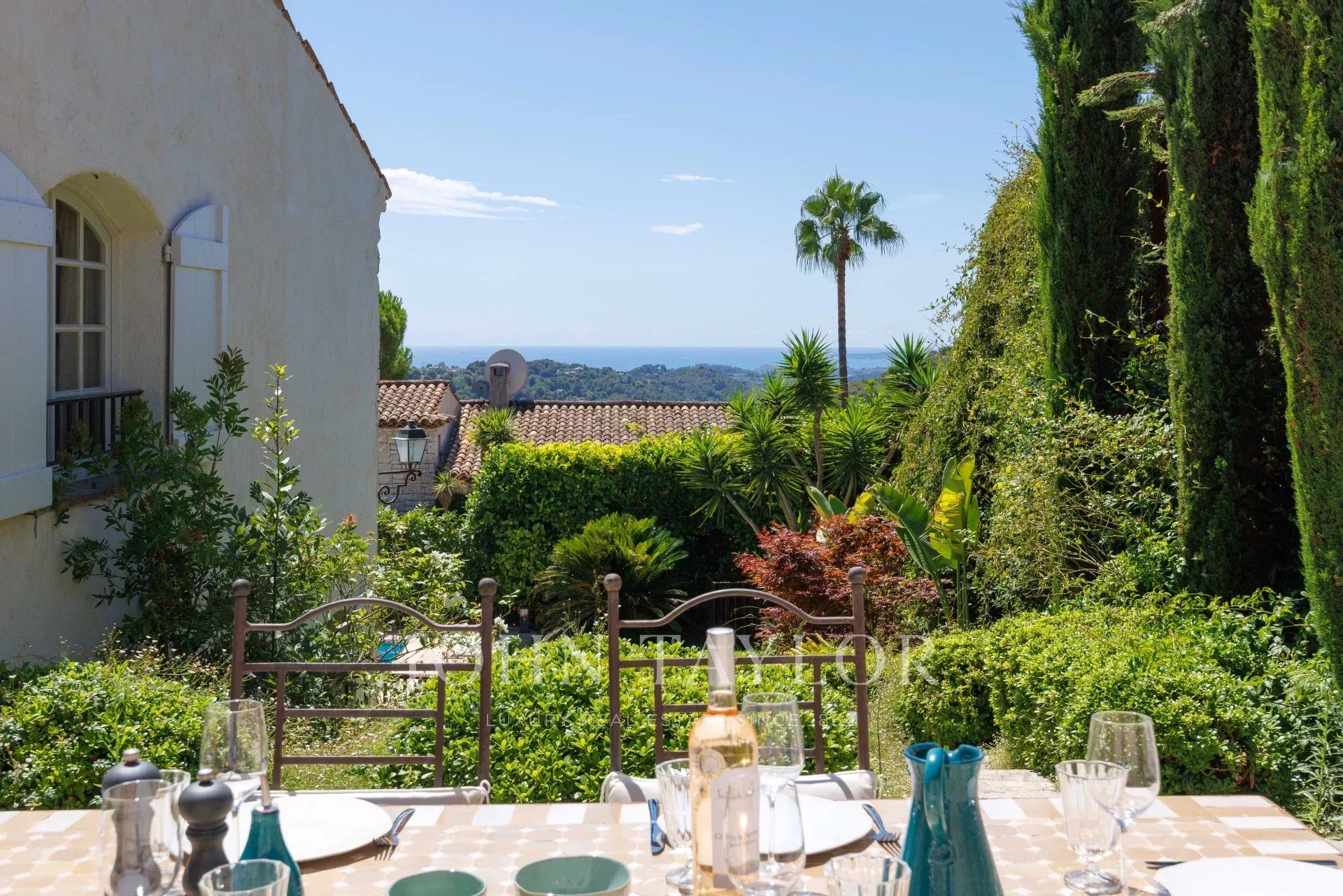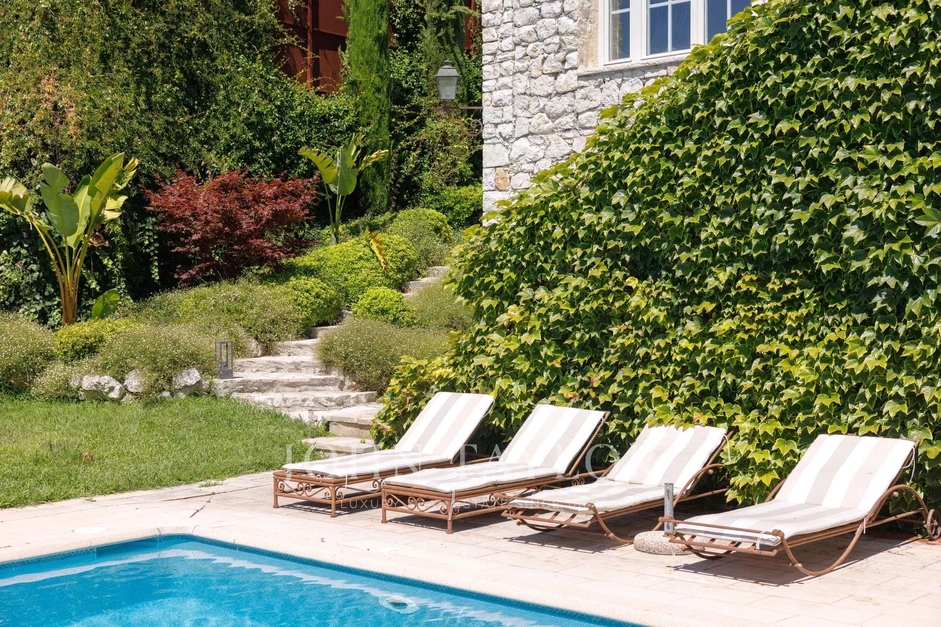 El jardín fue diseñado en su totalidad por el renombrado arquitecto paisajista Jean Mus y ofrece varias zonas, incluyendo un gran patio con refugio para dos vehículos y una fuente, una zona de comedor conectada a la cocina con vistas al mar de Cap d'Antibes, la hermosa terraza del salón y la zona de la piscina con casa de piscina y terraza, ¡ideal para relajarse y jugar con amigos y familiares!