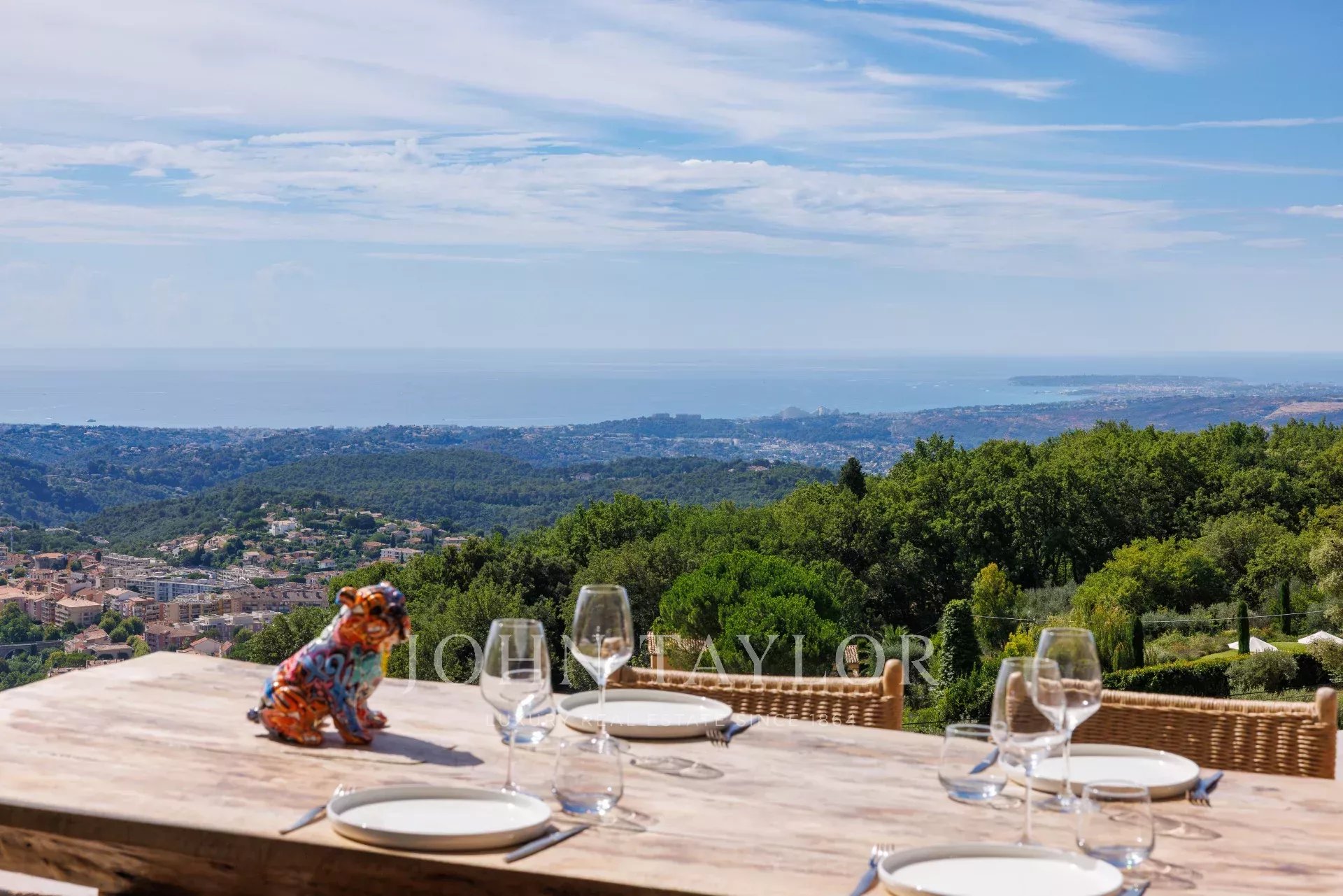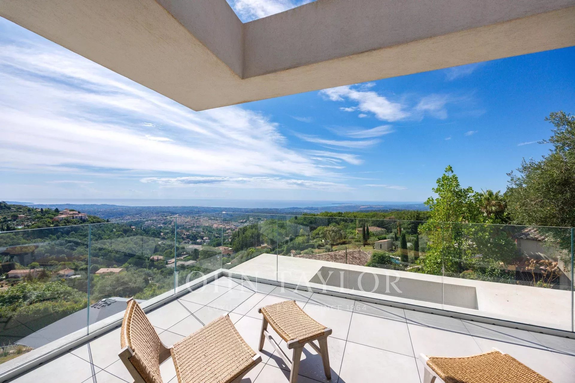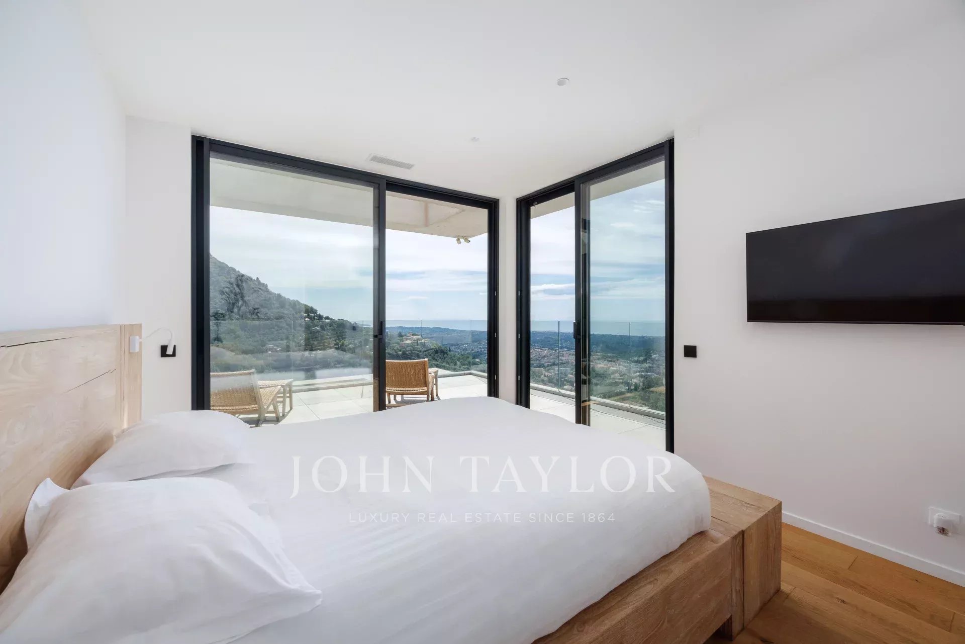 Esta magnífica villa contemporánea de reciente construcción (355 m²) goza de una ubicación ideal en las colinas de Vence, en el corazón de 4.000 m² de terreno ajardinado. Ofrece un marco excepcional con vistas de postal al mar -desde el Cap d'Antibes hasta la Baie des Anges y el Cap Ferrat- y a las montañas circundantes.