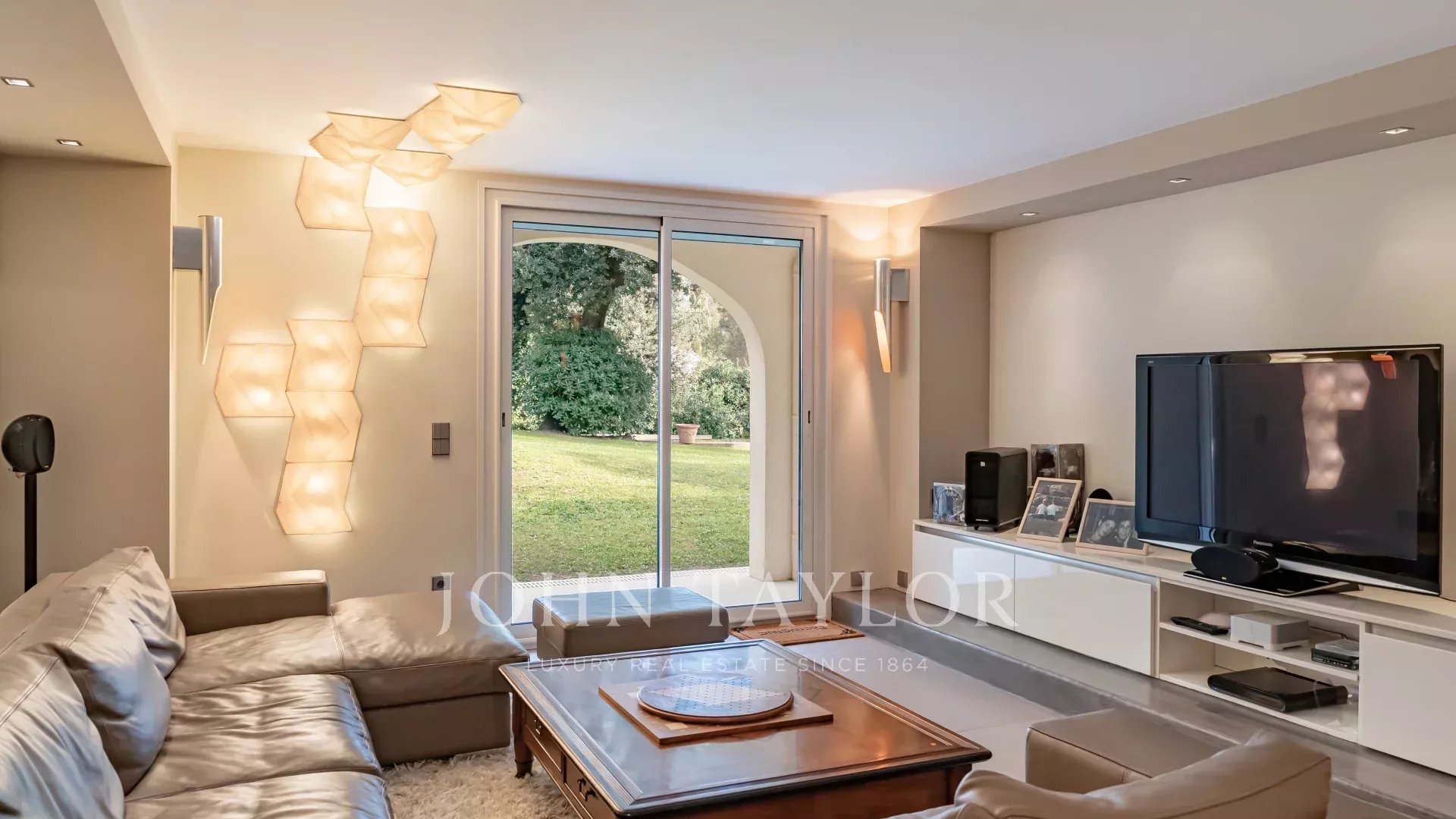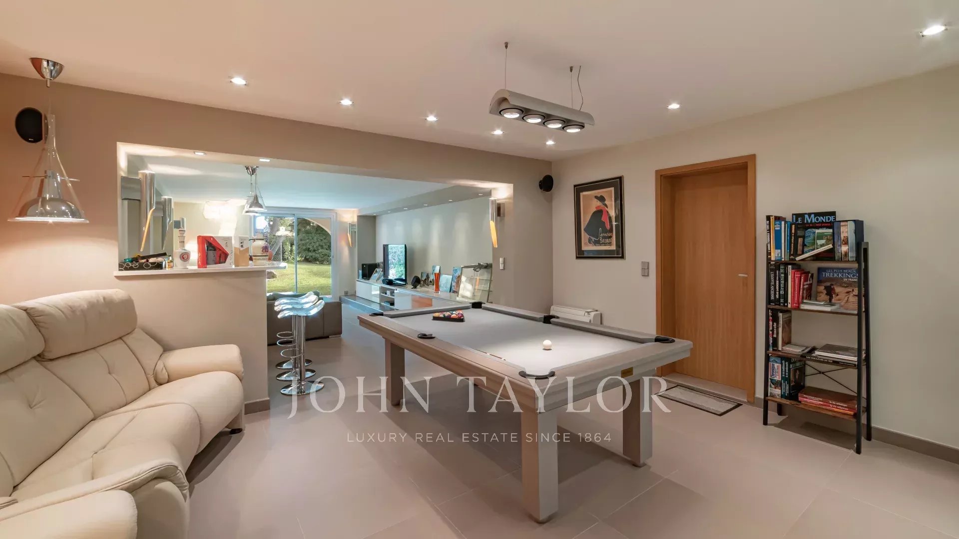 En el nivel del jardín, un amplio espacio dedicado a las actividades de ocio incluye un gimnasio, una zona de relajación con jacuzzi y sauna, una sala de cine y un salón abierto al jardín, equipado con una mesa de billar, un bar y una bodega.