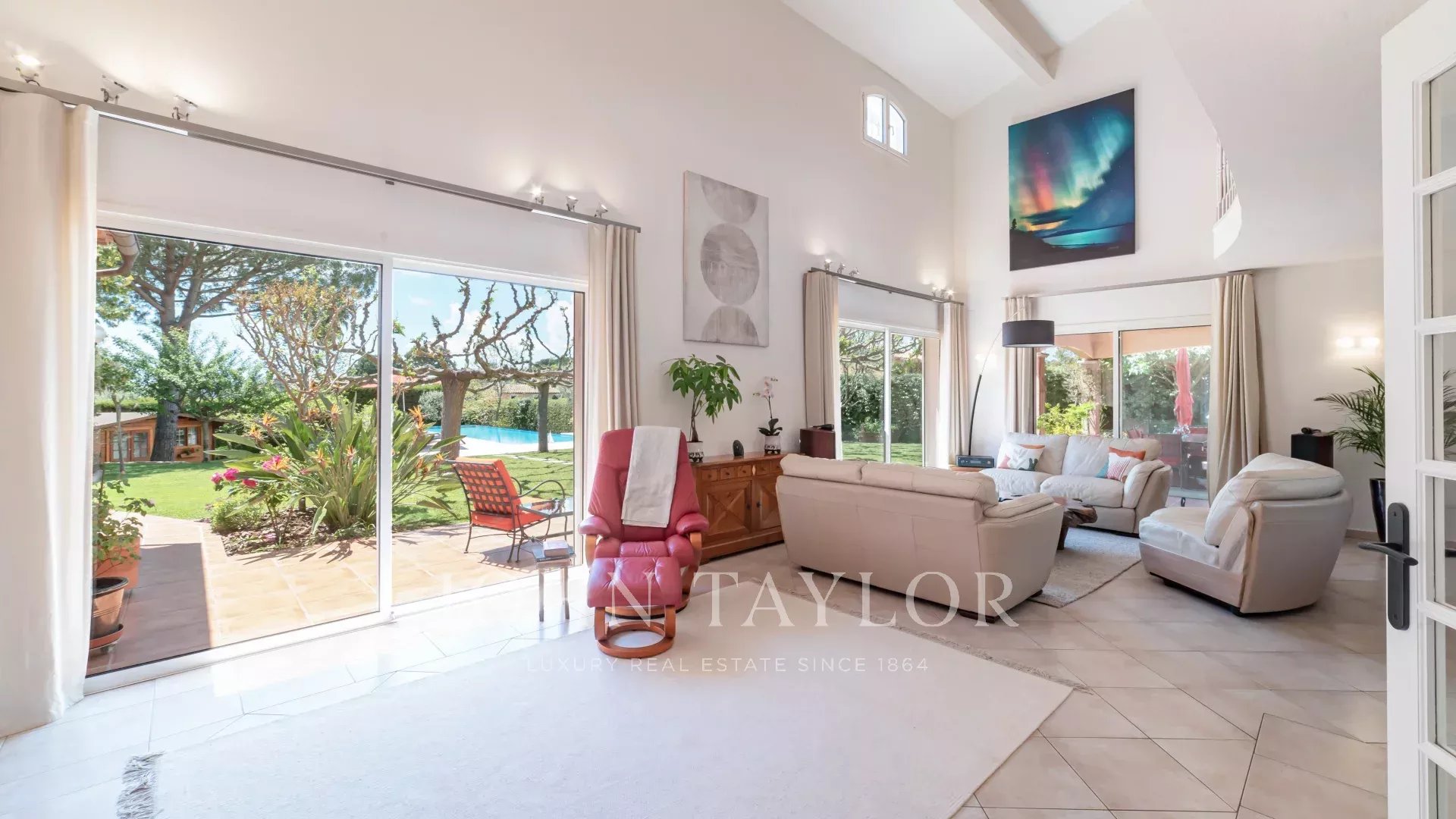Un salón amplio y luminoso con techos altos y vistas al jardín y a la piscina.