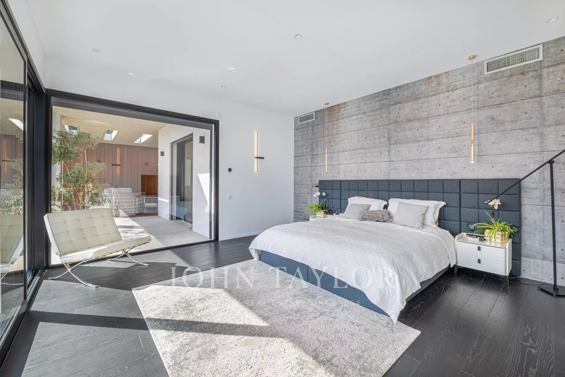 Consta de 4 dormitorios en suite, un gran salón-comedor, cocina americana, un gimnasio, una sala de cine, una oficina, una bodega, numerosos vestidores, un amplio garaje cerrado, una gran piscina acompañada de su casa de la piscina, y numerosas zonas de relajación.