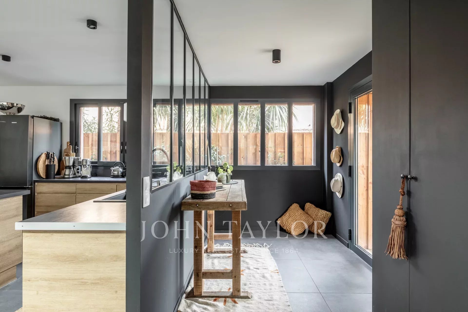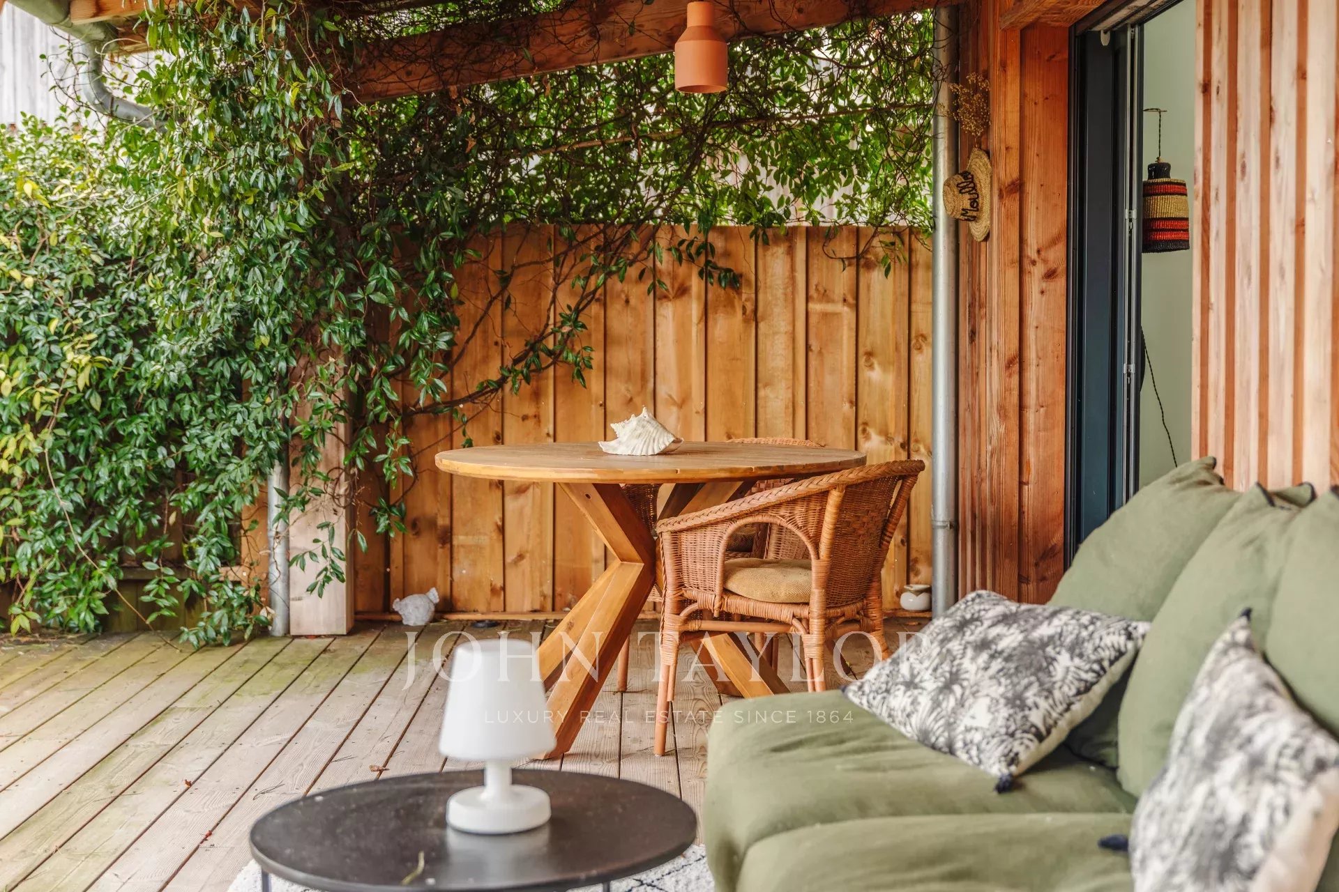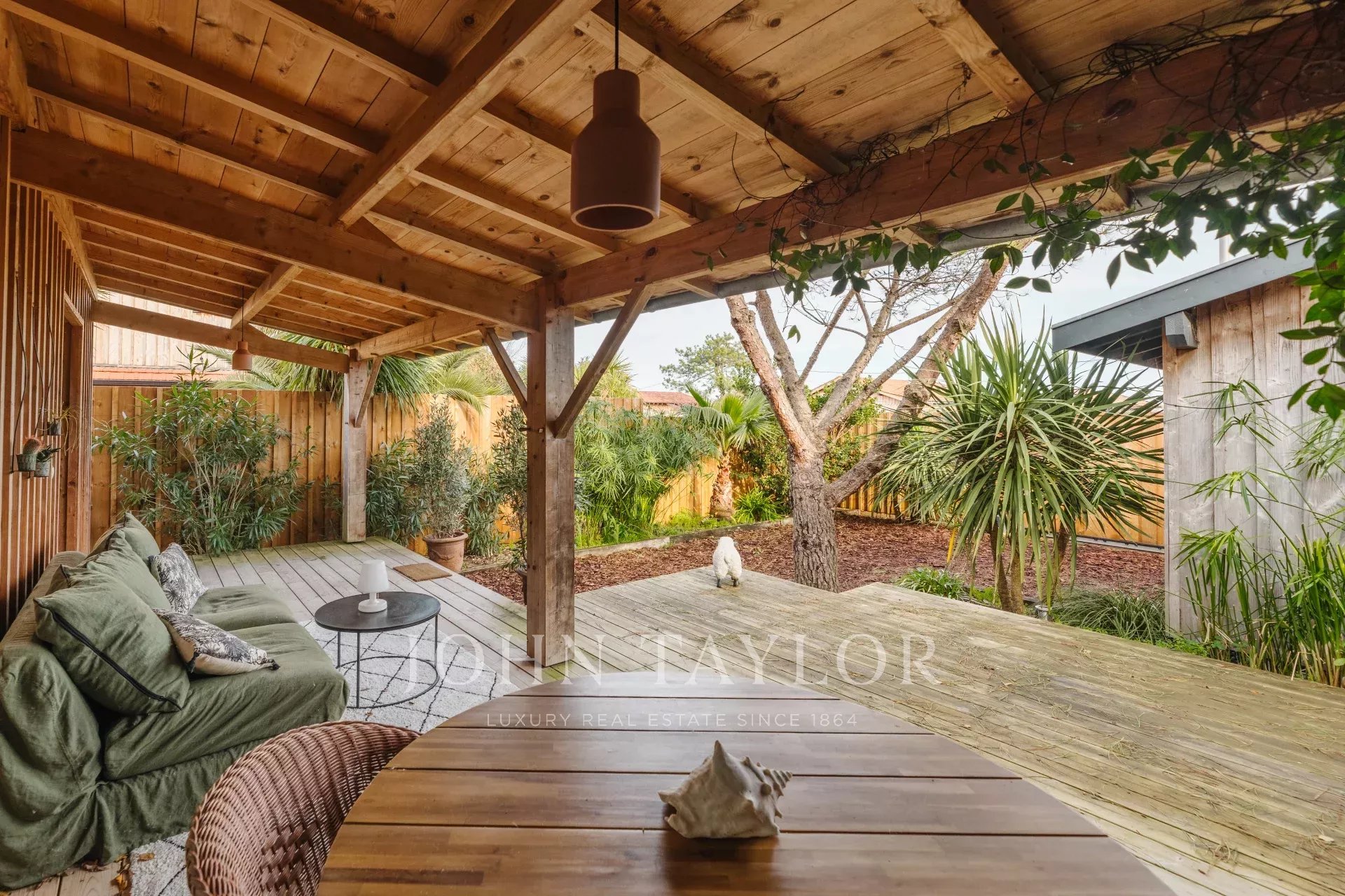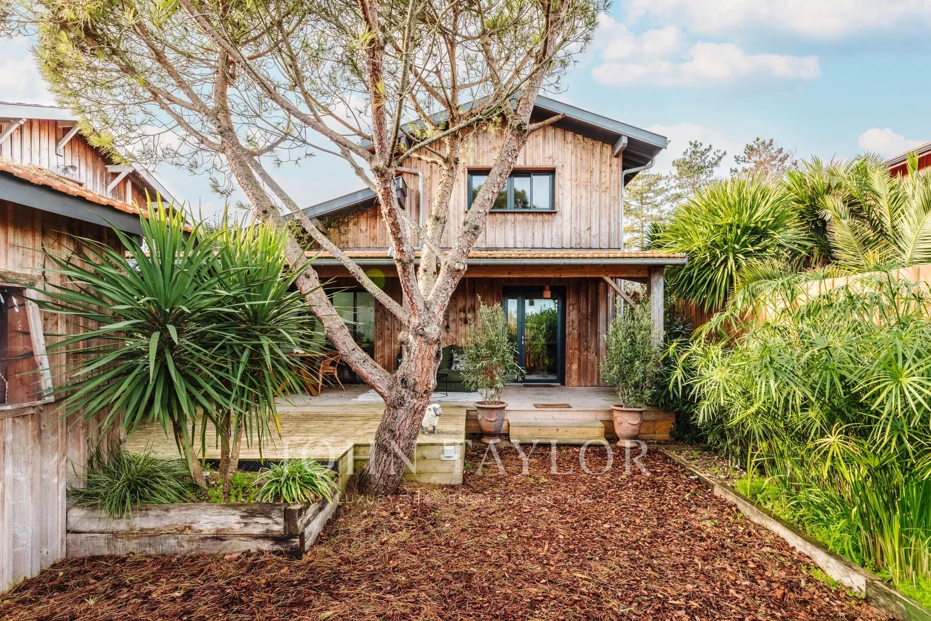 Descubra esta casa de estilo cabaña de pescadores, que combina autenticidad y modernidad. Situada a solo 100 metros del puerto de La Teste y al lado de Les Prés Salés, esta propiedad reciente le conquistará por su revestimiento de madera y su interior decorado con gusto.