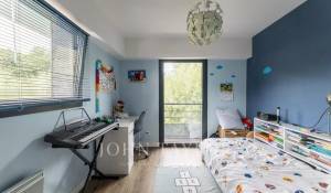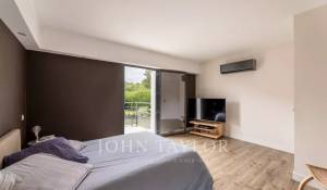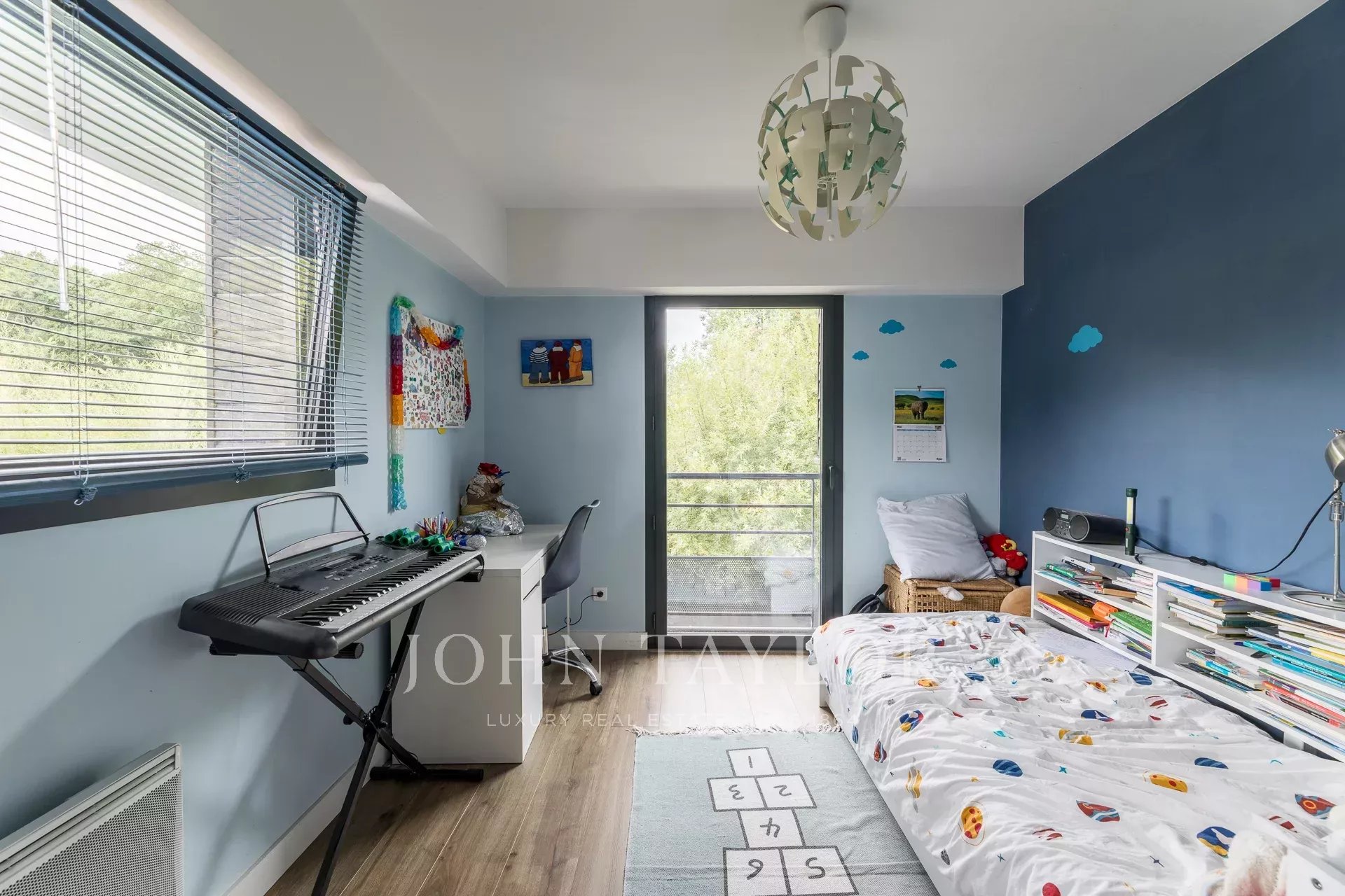 La planta baja se abre a un salón en forma de catedral, realzado por grandes ventanales que se abren a un jardín orientado al sur con su piscina de baldosas de piedra Bali. Una cocina familiar funcional está acompañada de un lavadero contiguo. Un primer dormitorio completa este nivel.