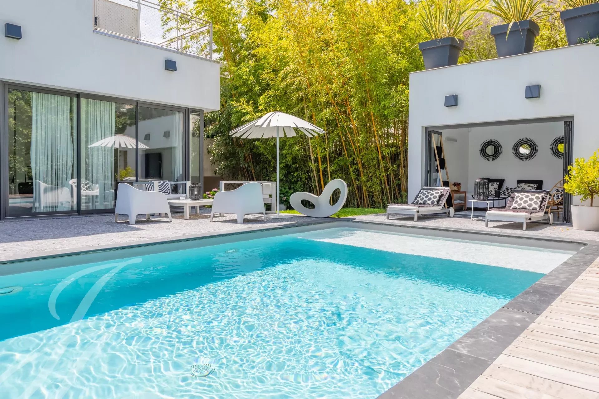 Enclavada en una parcela de 700 m2, cuenta con un gran jardín de exuberante vegetación, donde los amigos y la familia podrán disfrutar del campo de petanca, así como de una terraza con piscina.